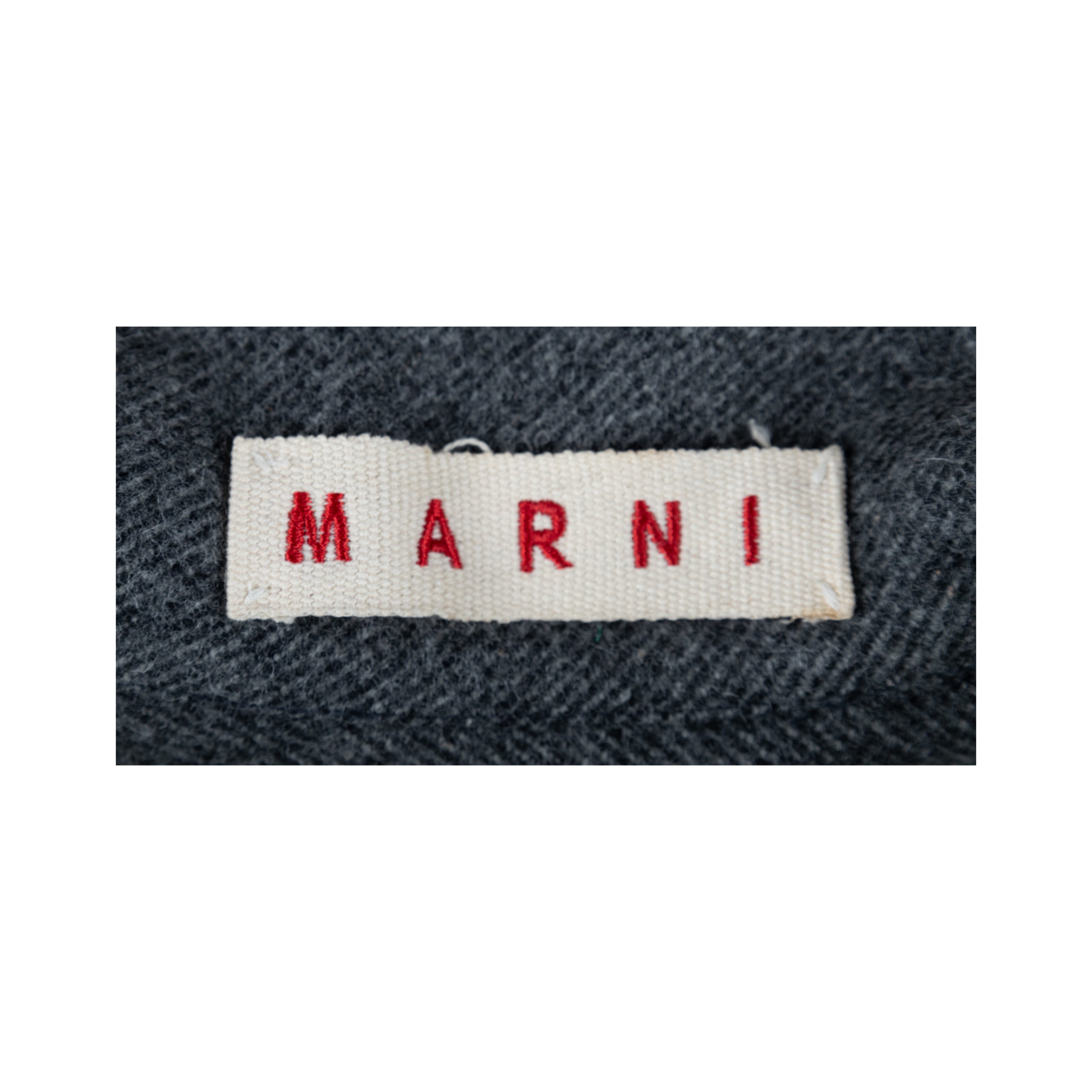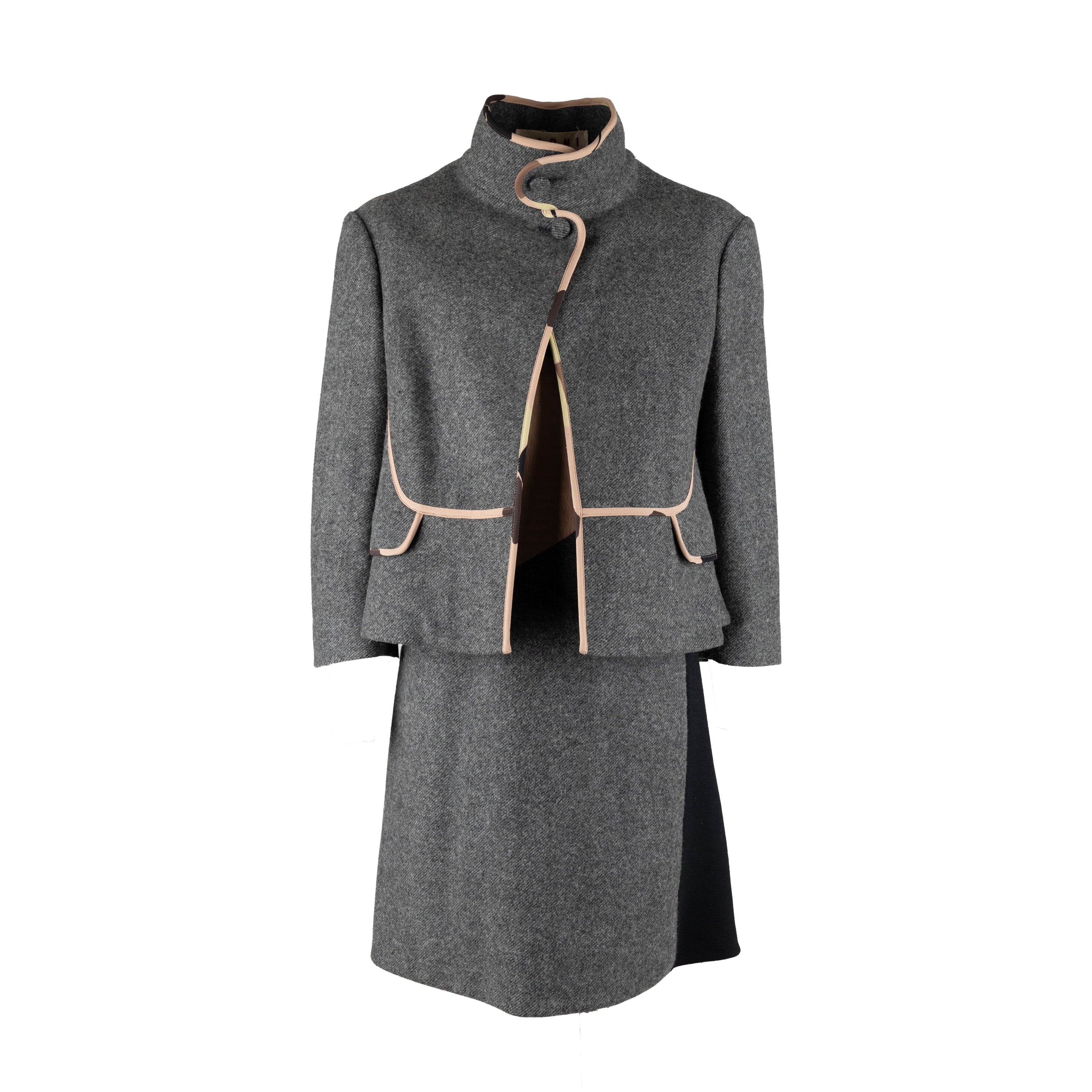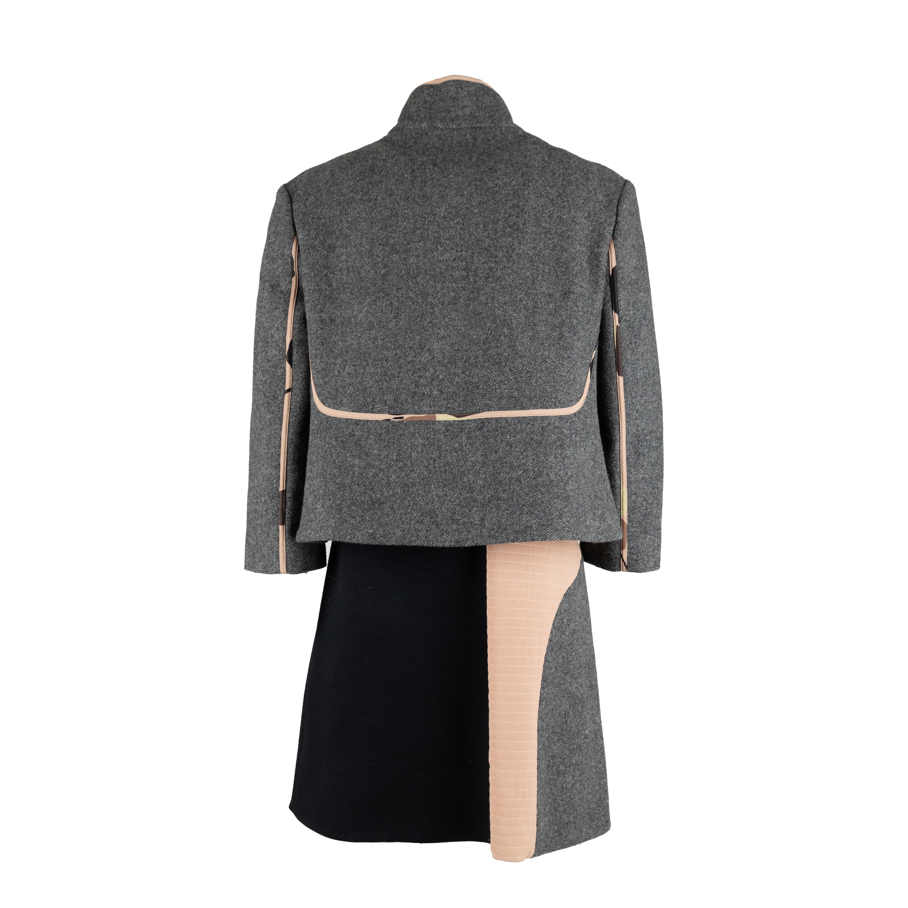 This Marni Dress and Jacket Set is crafted from a luxurious wool blend fabric. The grey fabric is complemented by striking beige and black colorblock pattern, as well as an elegant a-line silhouette. The accompanying jacket features contrasting silk trim, two front pockets and a high-necked button closure. Perfect for any special occasion.