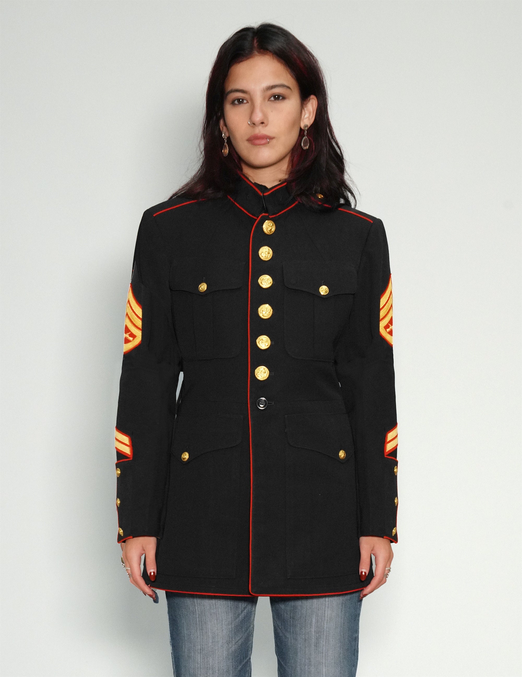 An original vintage US Marine Staff Sergeant dress tunic, 100% Wool. For a Staff Sergeant. Gold metal button fastening front and loop on collar. Ideal for the woman who dresses to impress.