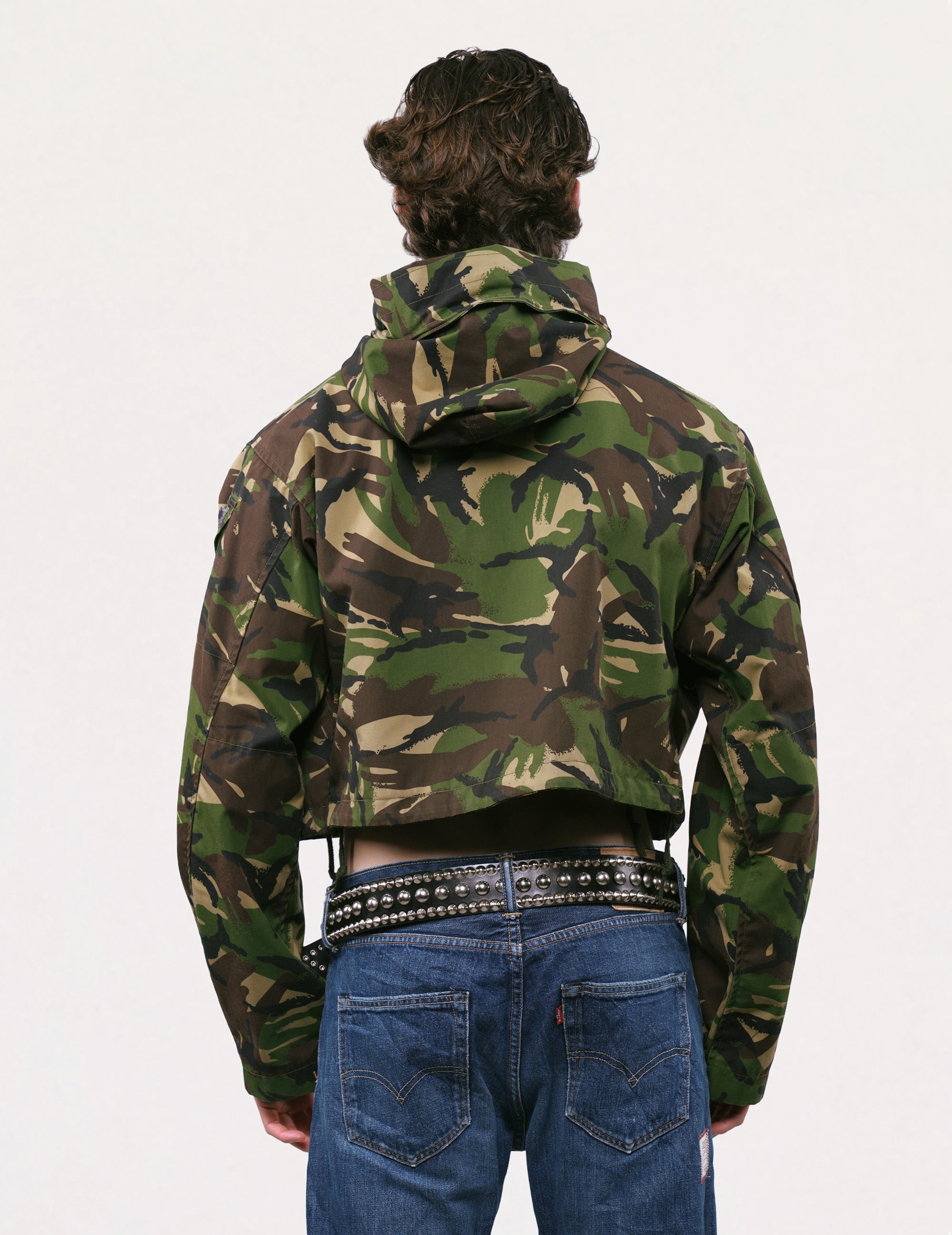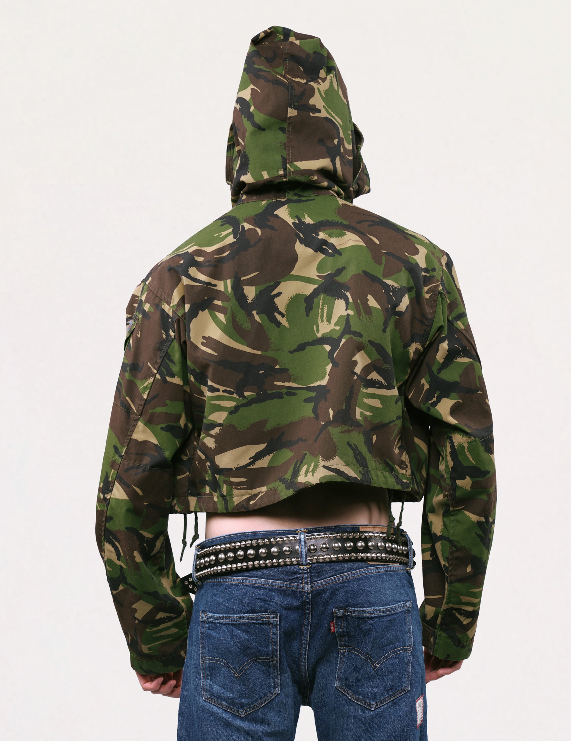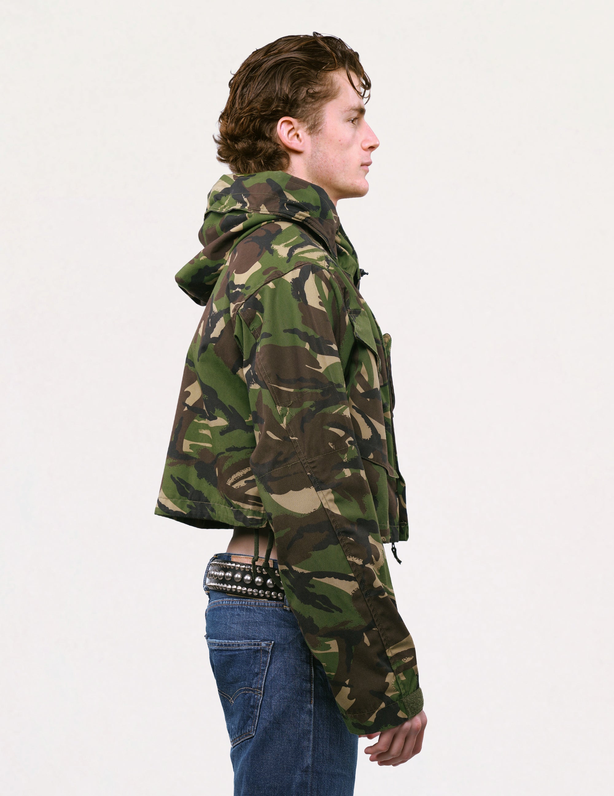 Cropped, hooded British Army DPM smock, circa early 1990's. 100% cotton. Front cargo pockets, adjustable hood, and waist fasteners.