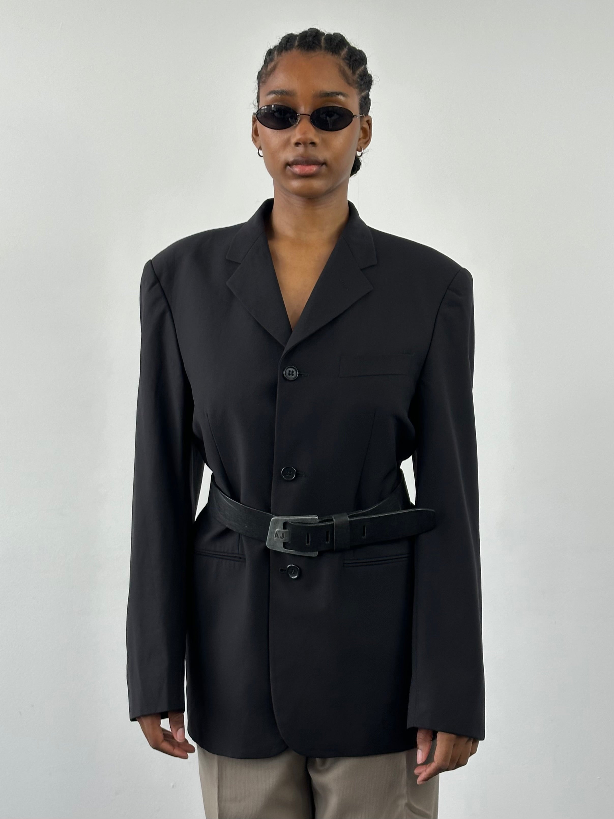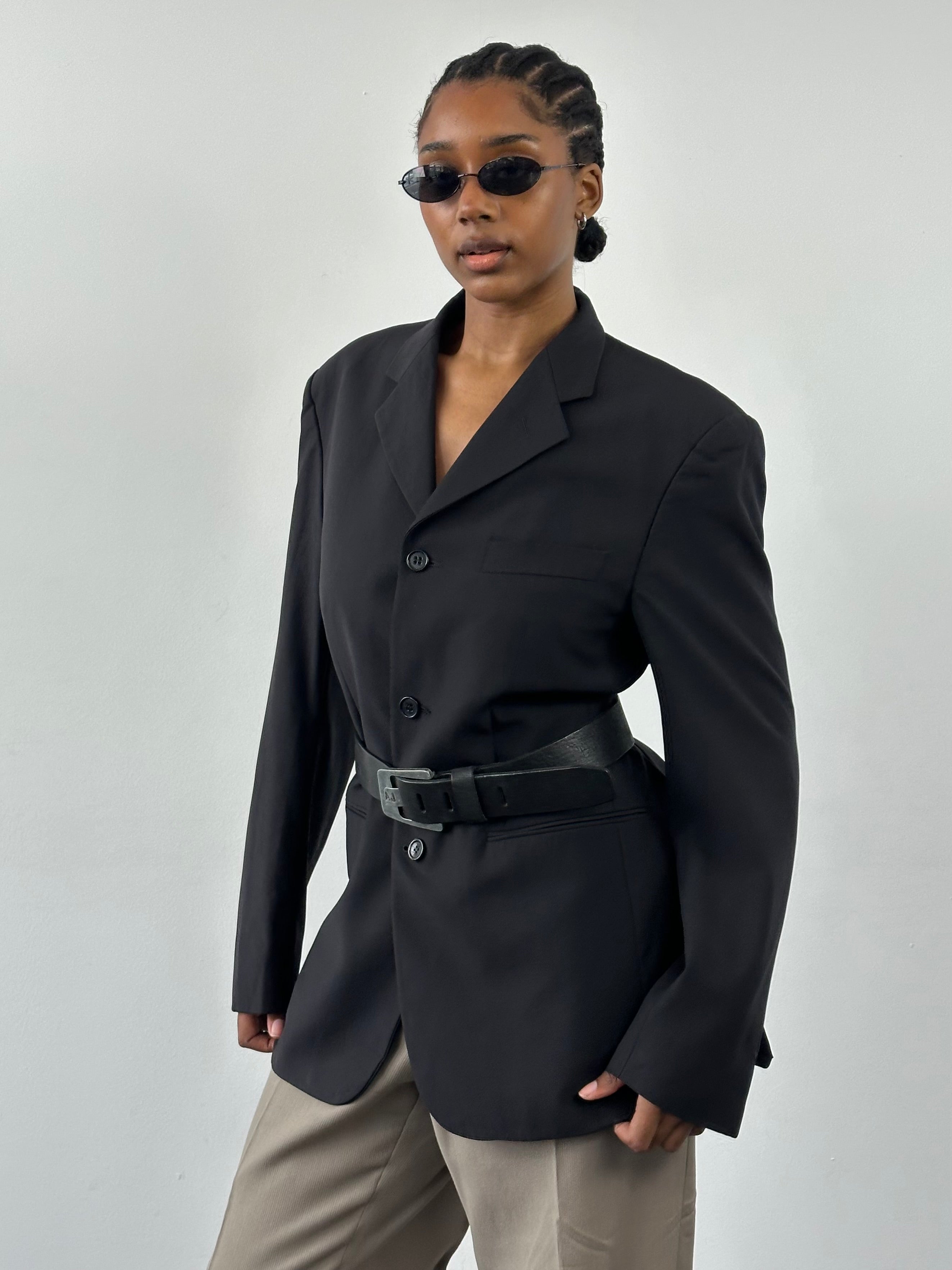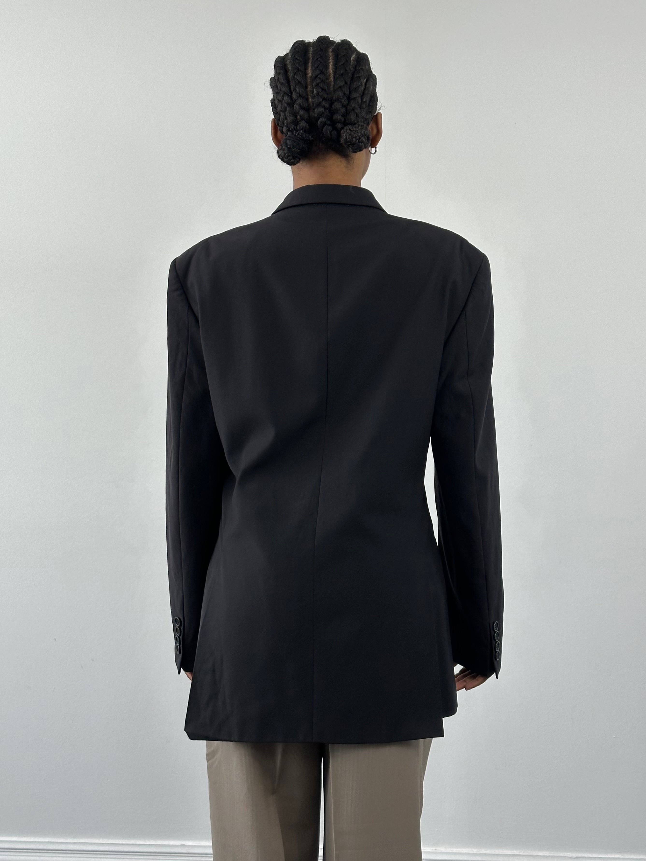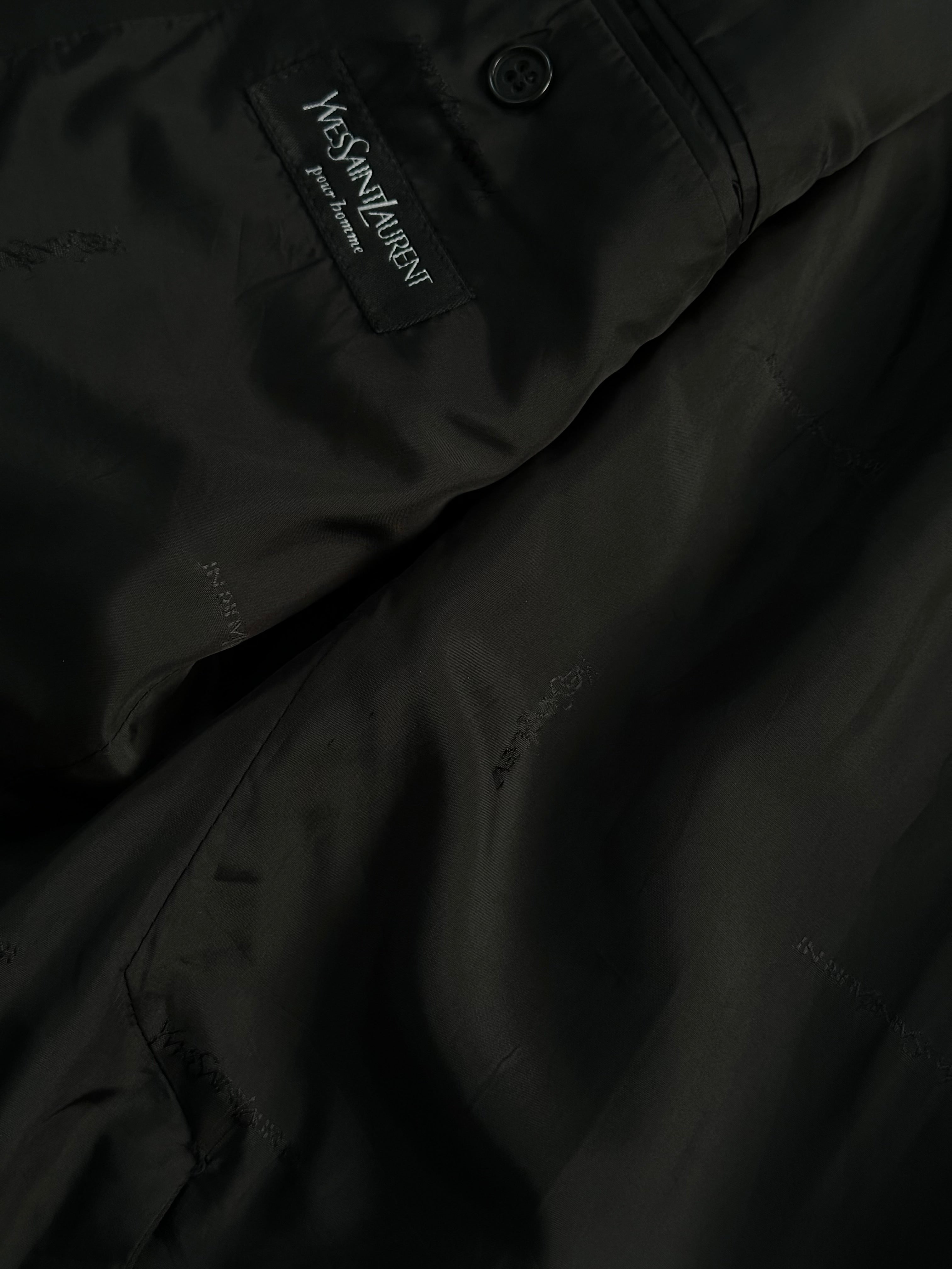 A vintage 1990s Yves Saint Laurent Pour Homme blazer in a deep black tone with a clean tailored structure. A refined single breasted silhouette with soft structure through the shoulders.