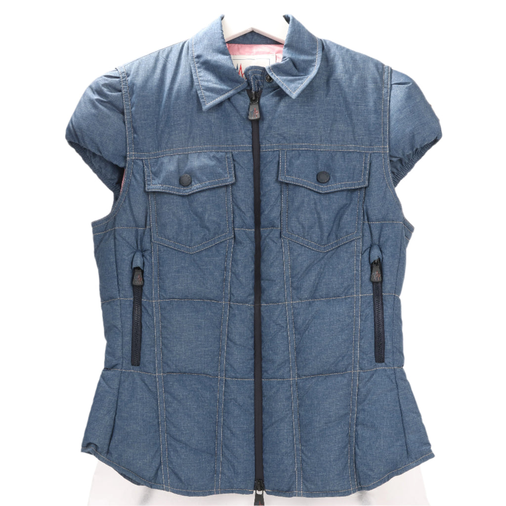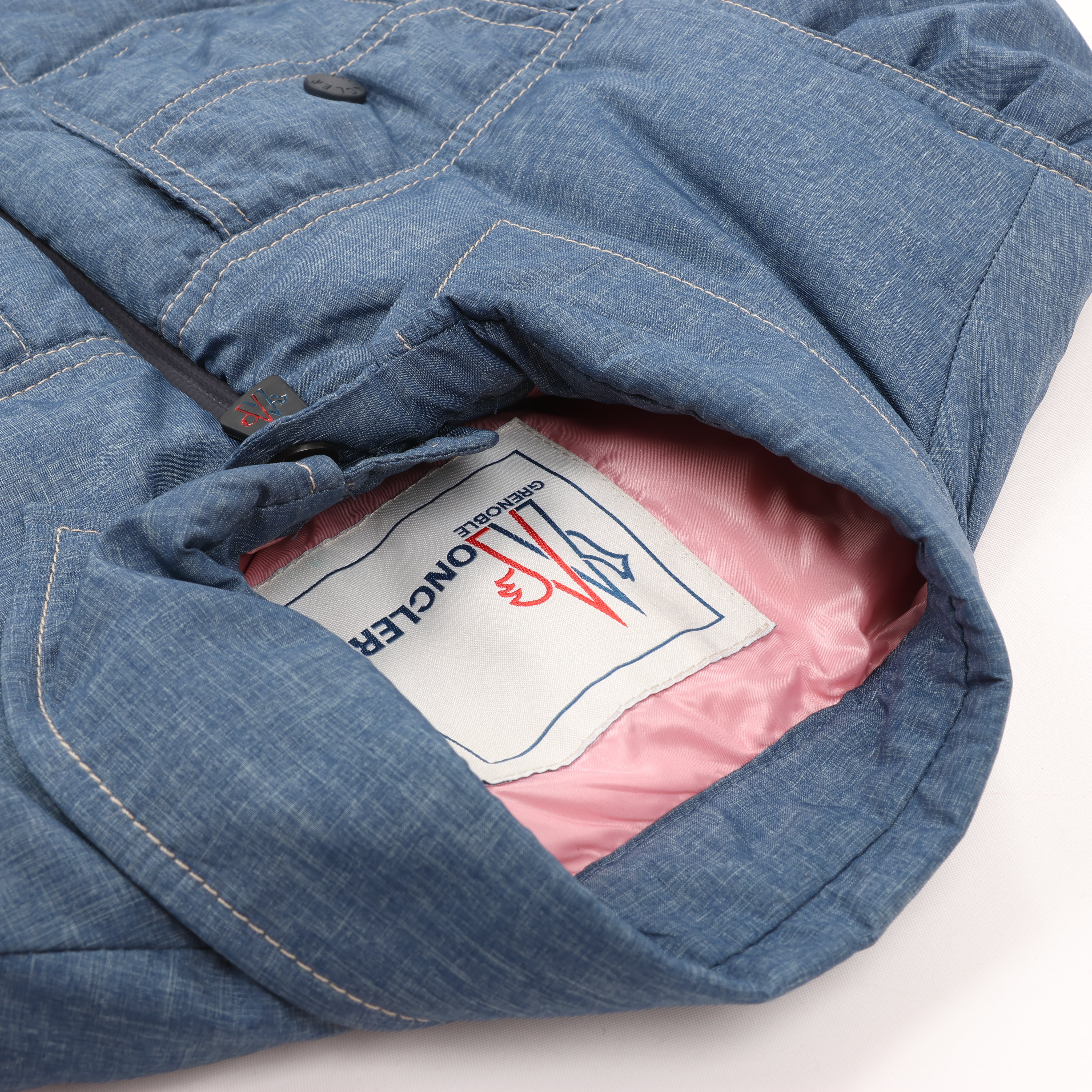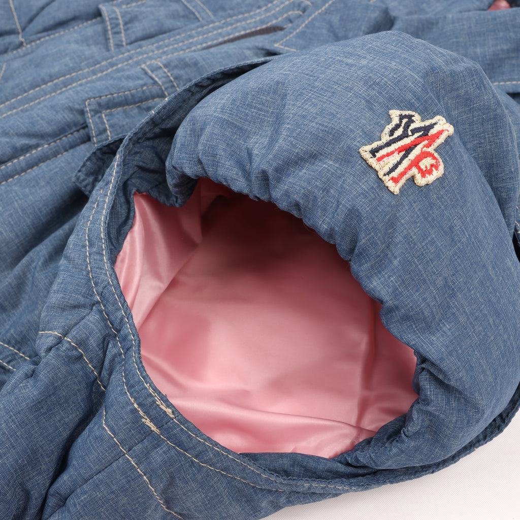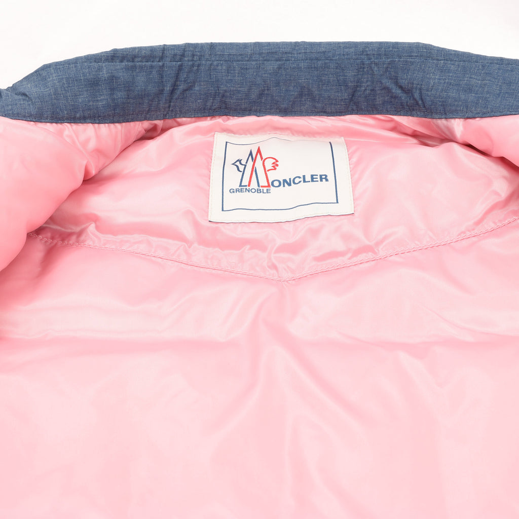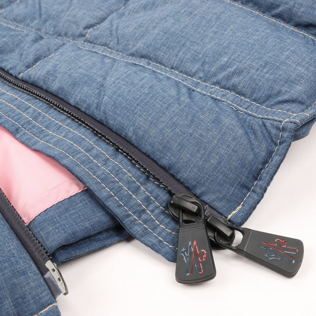 This Moncler Grenoble sleeveless jacket combines functionality with style. Featuring a blue denim exterior and a soft pink inner lining this piece offers a chic yet casual look. It includes two chest pockets front zip closure and a comfortable fit. Ideal for layering during transitional seasons.
