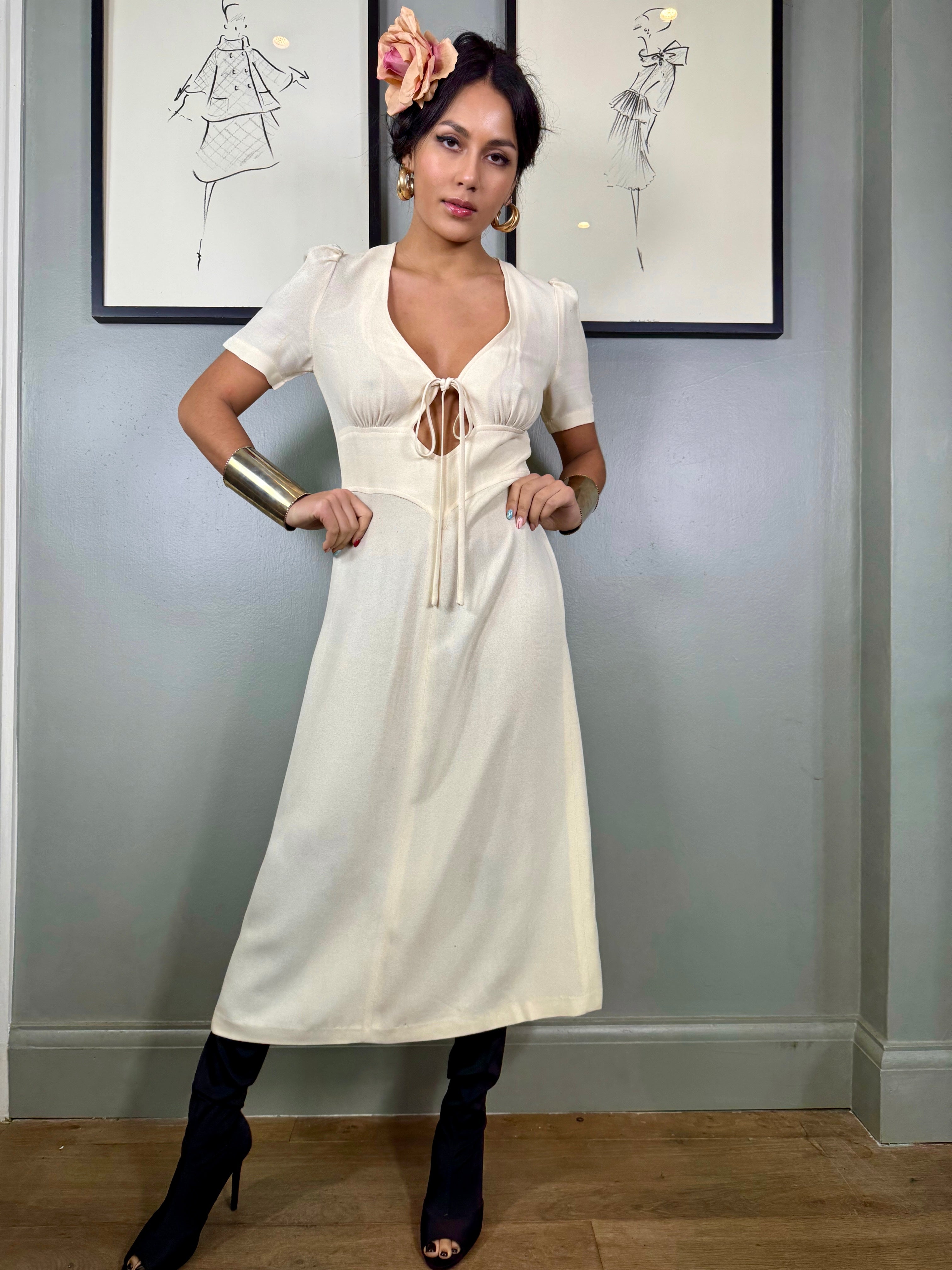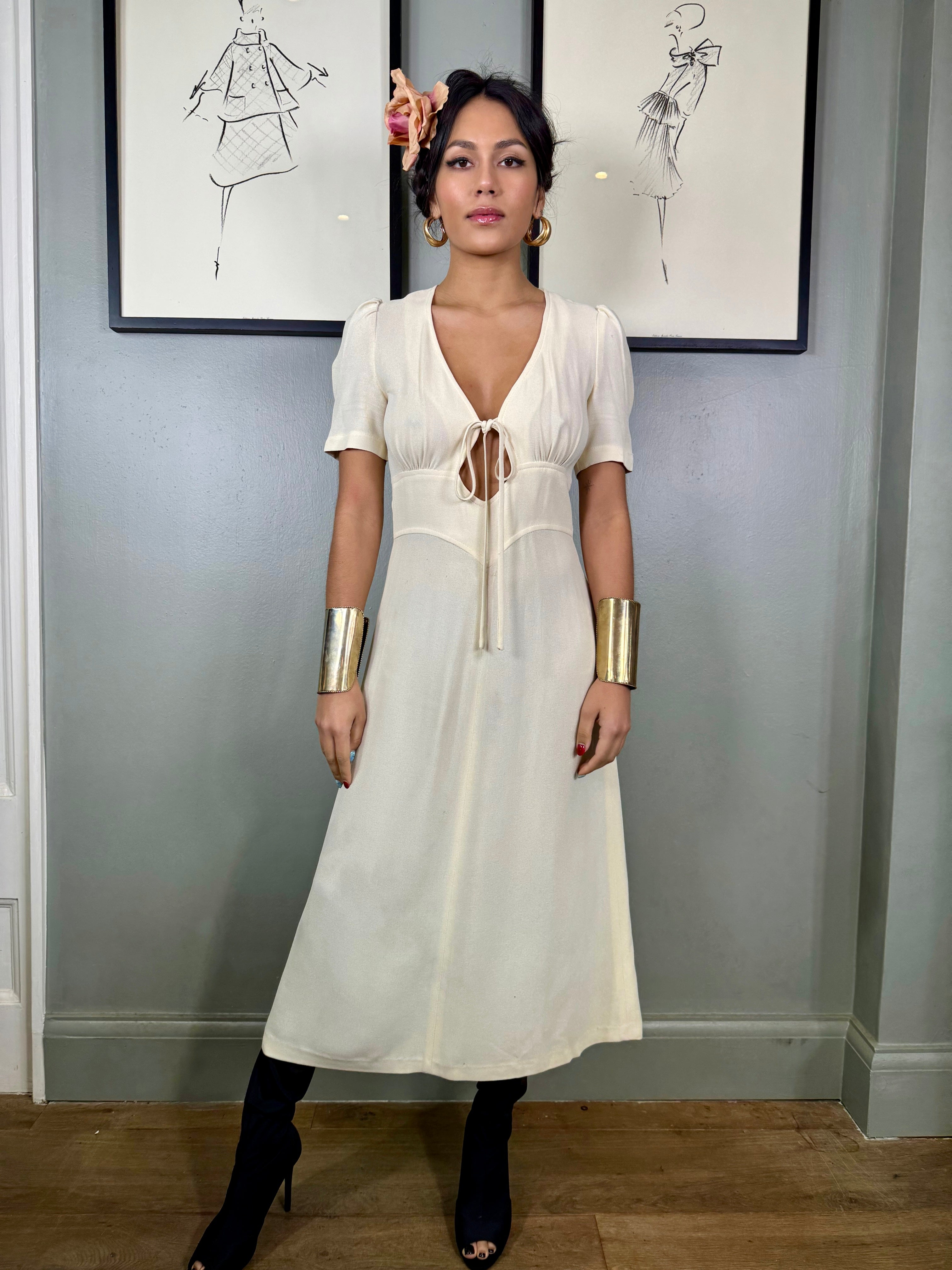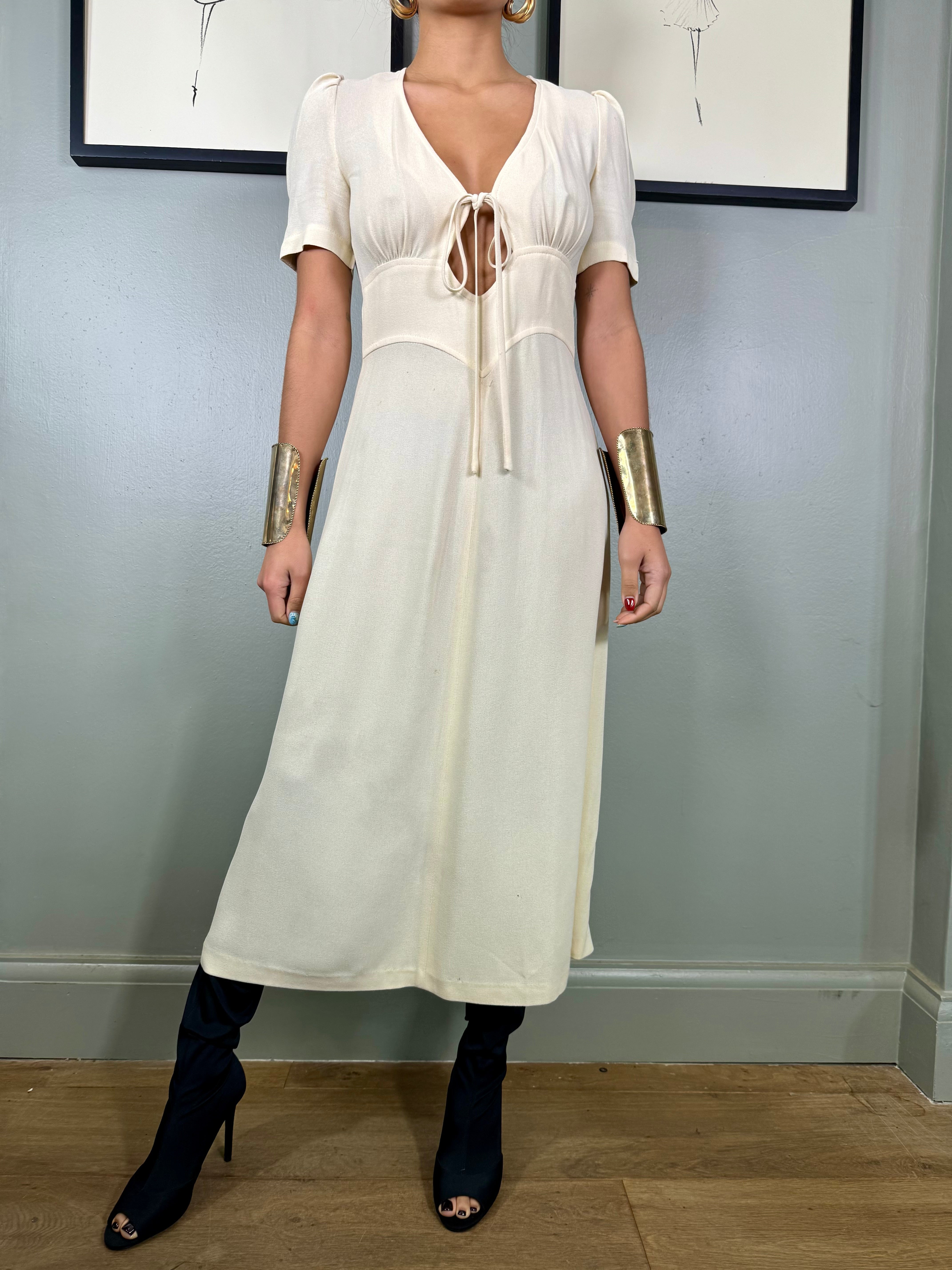 Gorgeous and iconic designer Ossie Clark, 70s, cream crepe dress with front keyhole design that ties across the bust. Has short sleeves and an A line skirt. Zips on the back. Has its original label. Very collectable.