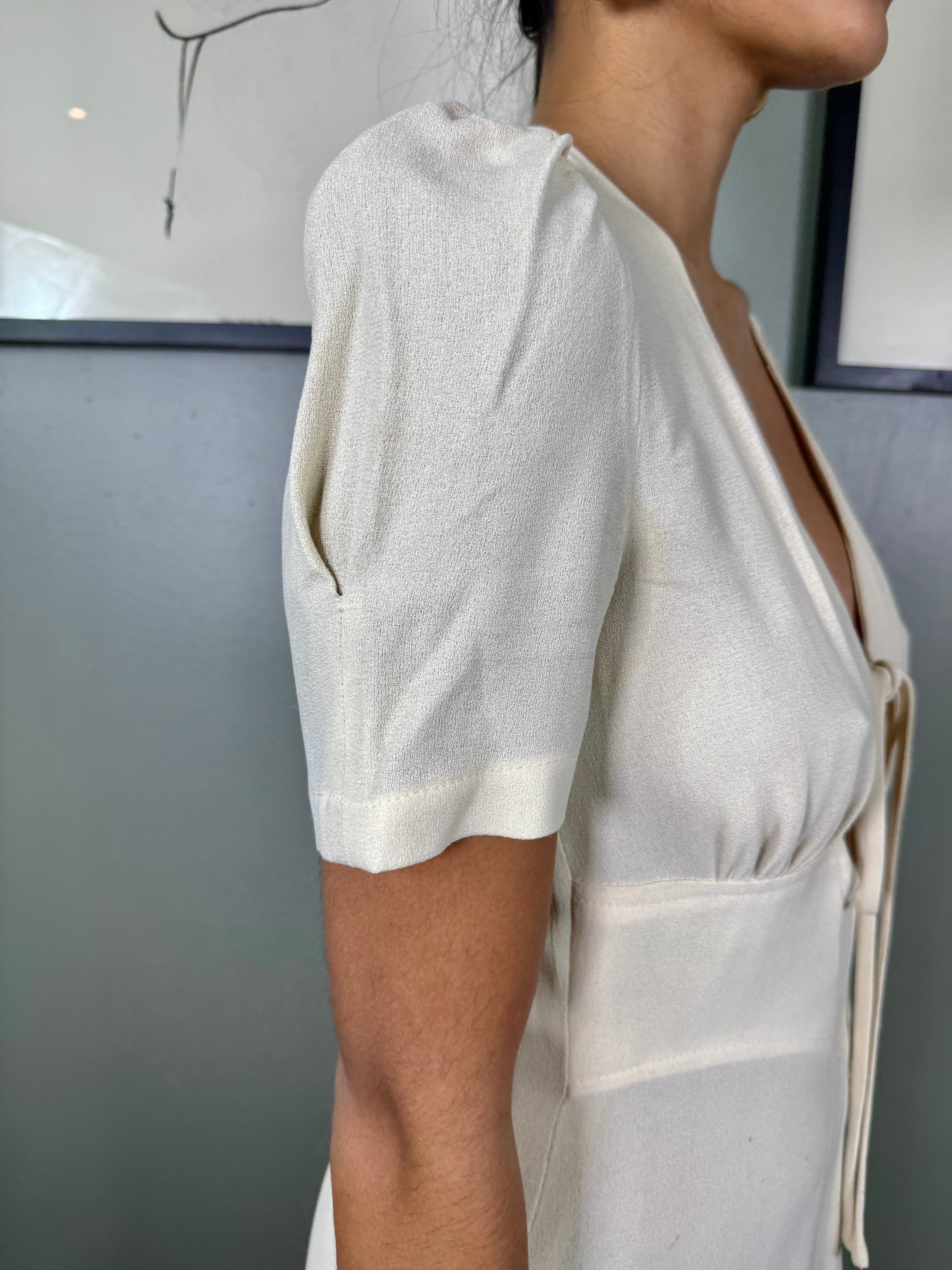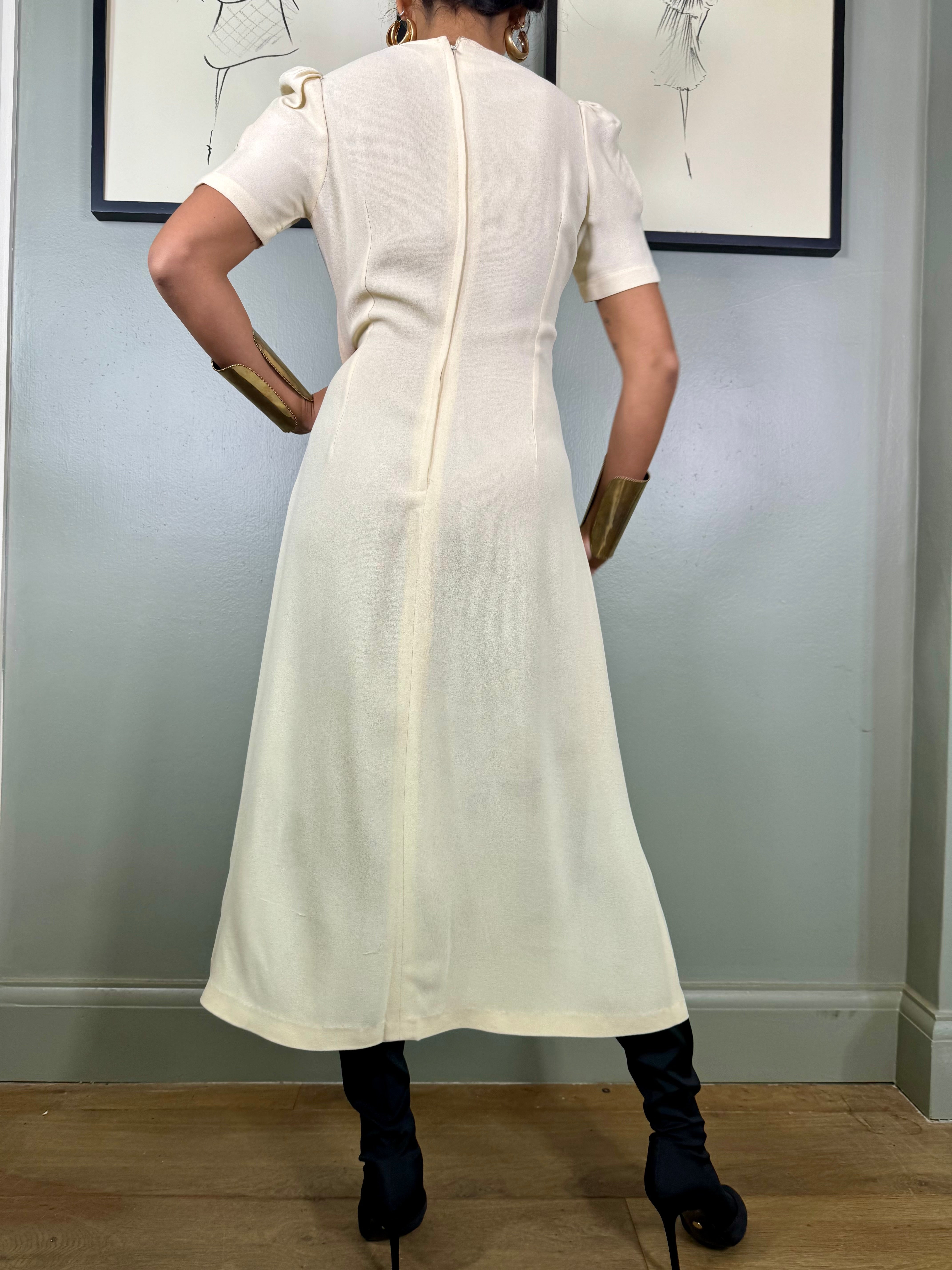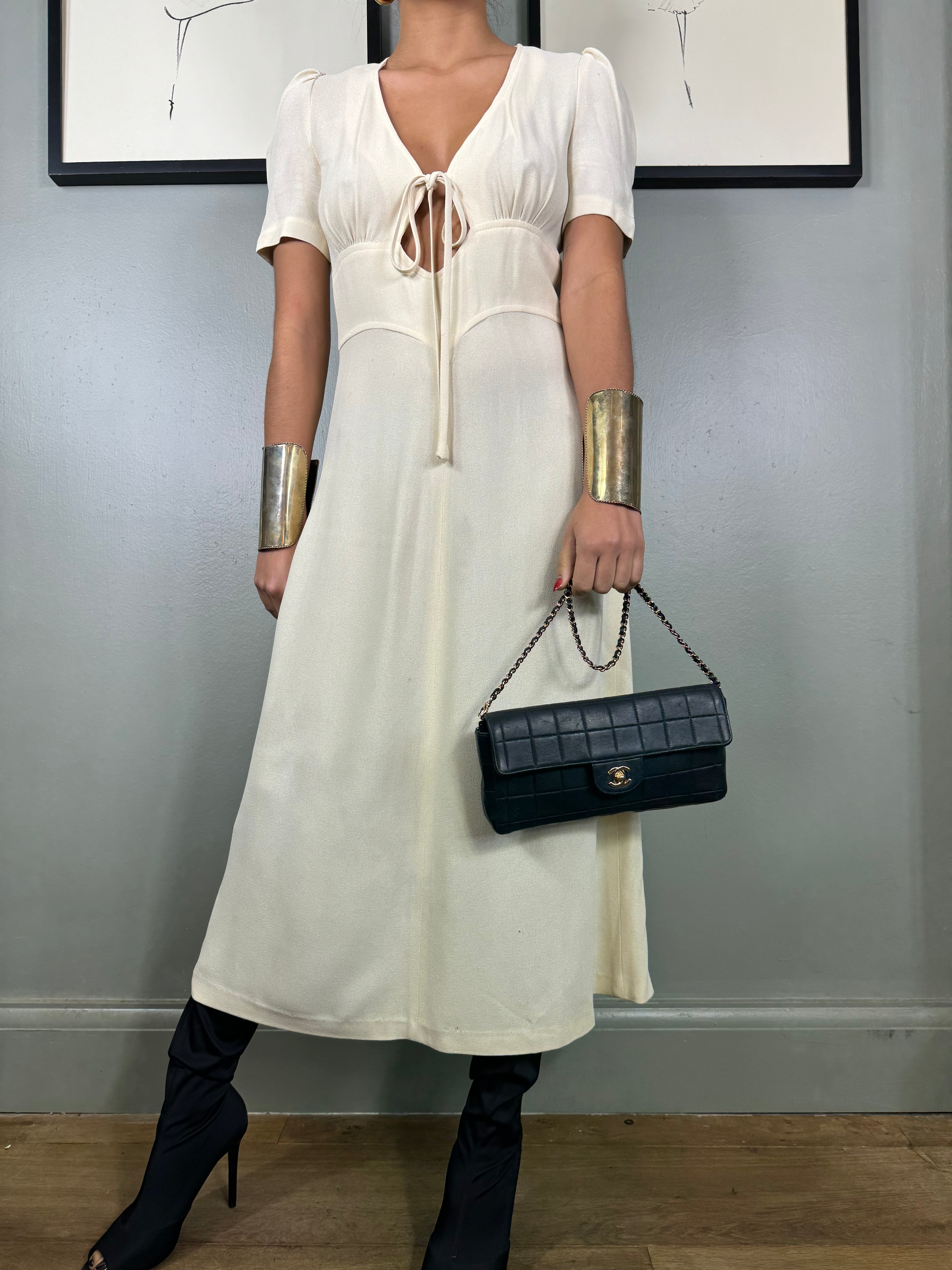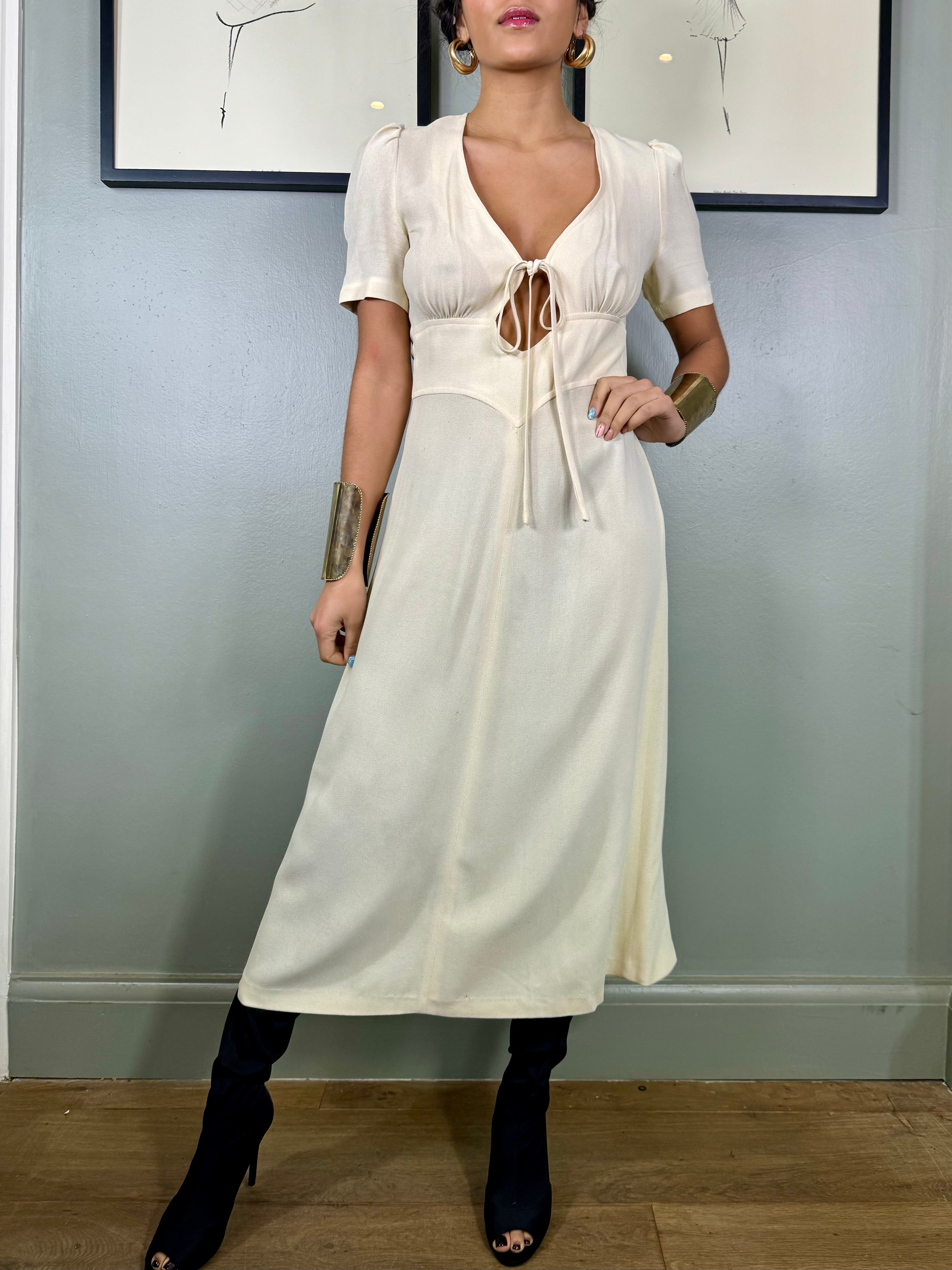 Gorgeous and iconic designer Ossie Clark, 70s, cream crepe dress with front keyhole design that ties across the bust. Has short sleeves and an A line skirt. Zips on the back. Has its original label. Very collectable.