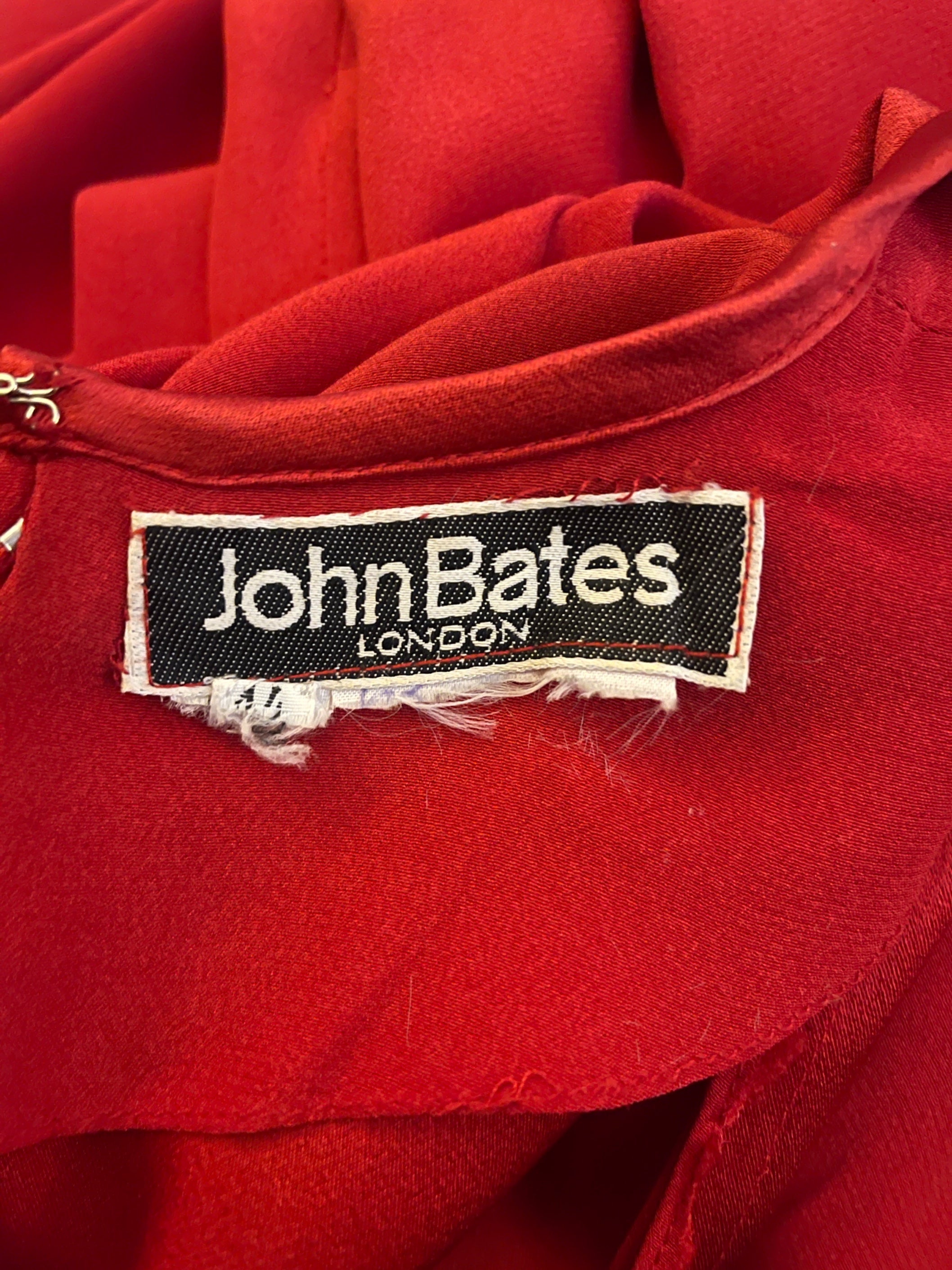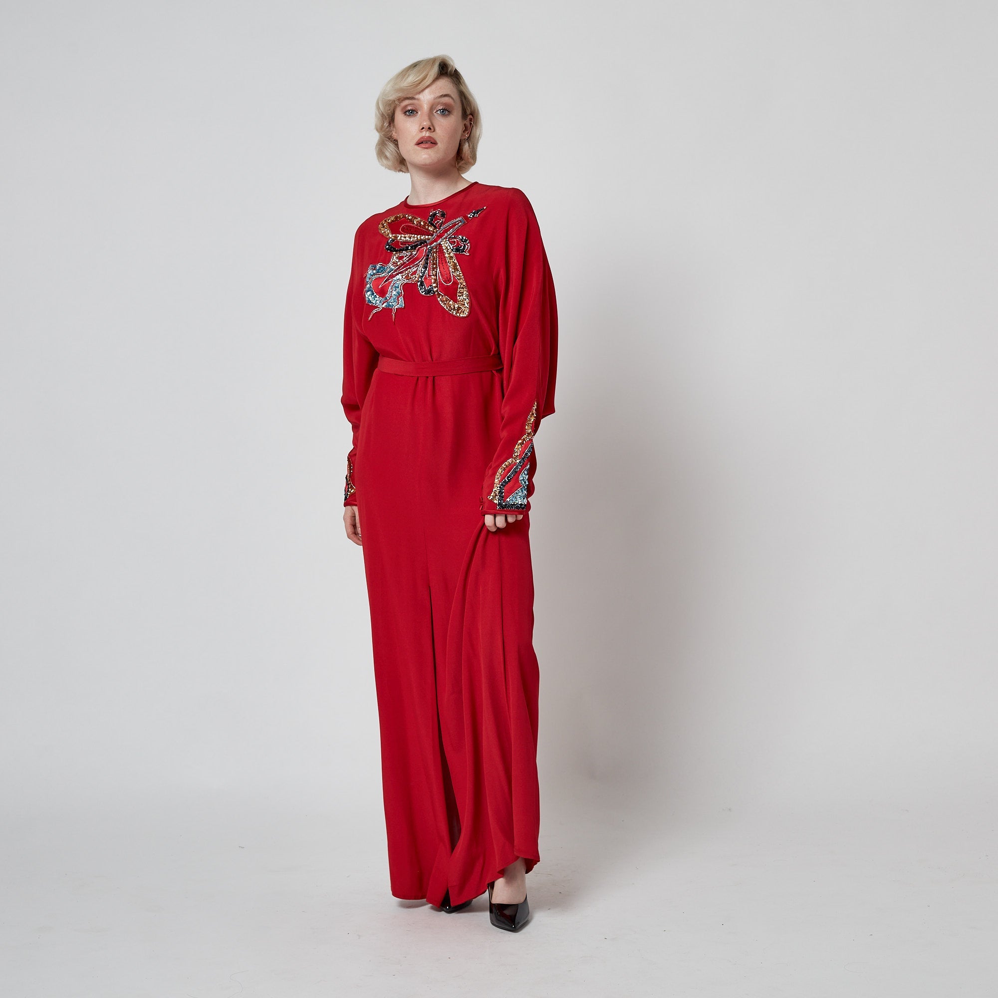 This playful, wonderfully detailed gown was designed by John Bates in the 1970s. Often operating through his Jean Varon label, John Bates produced some of the most forward-looking designs of the 1960s and 1970s, distinguished by graphic lines, imaginative construction, and a distinctly futuristic sensibility. This dress was created under his own name and is generously tailored from heavy red crepe to a flowing, A-line maxi silhouette. The sleeves are long and cut to a theatrical batwing shape with long, slim cuffs covering the forearm. It is unlined and is secured at the back of the neck with a tonal red zip and hook-and-eye clasp. The applique detailing is beautiful; it forms an abstract shape from red silk satin and rainbow-hued sequins across the front of the gown that could be interpreted as a rocket, a moth or a butterfly. The cuffs are embellished with Art Deco forms created from sequins in pale blue, bronze and navy. They close with two red satin-covered buttons and fabric loops. The skirt has a slit at the front. The dress comes with a slim belt crafted from coordinating red crepe.