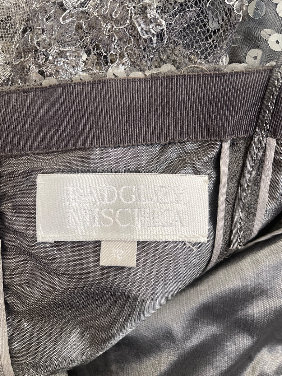 1990s Badgley Mischka Gunmetal Silver Ball Gown with Sequinned Bodice