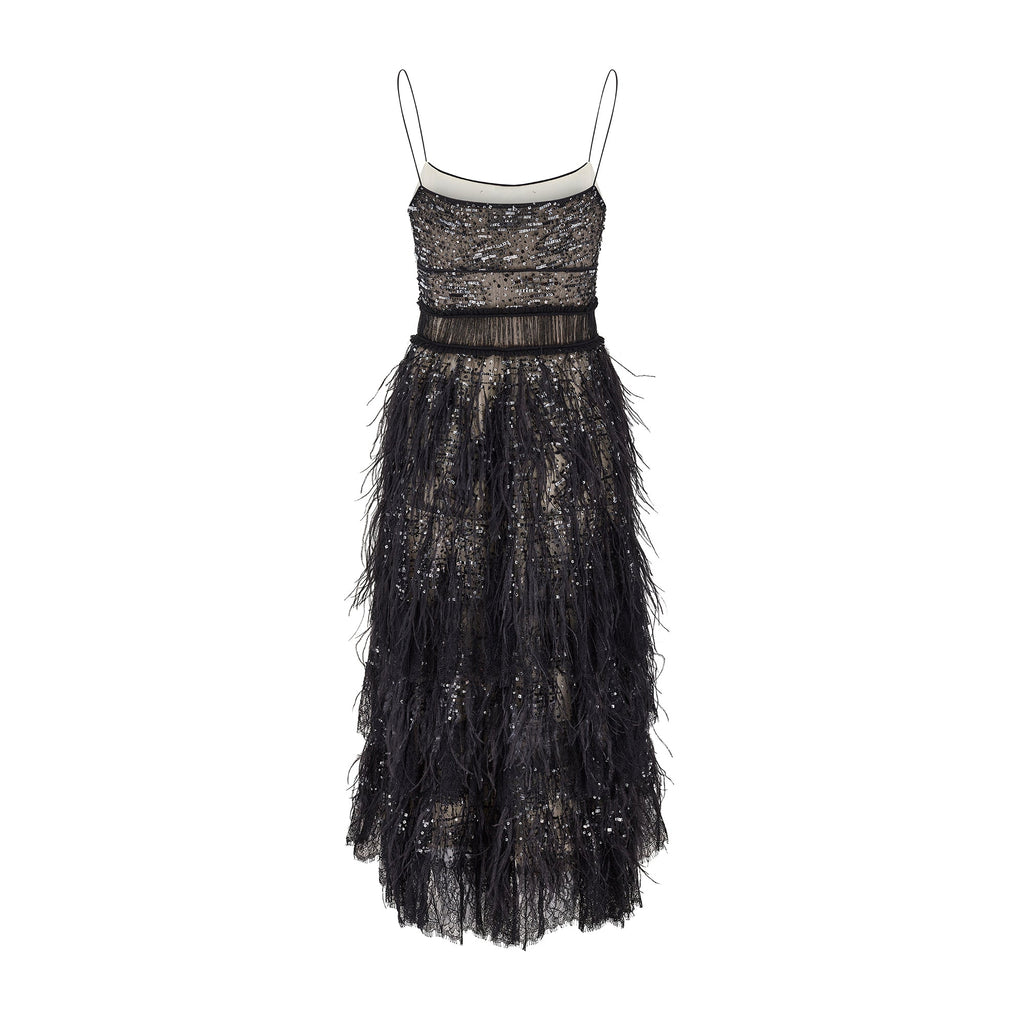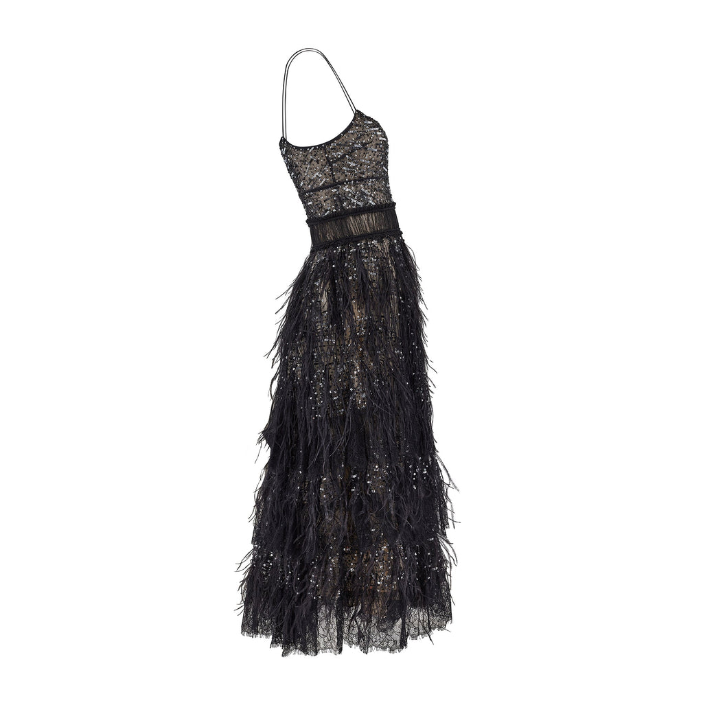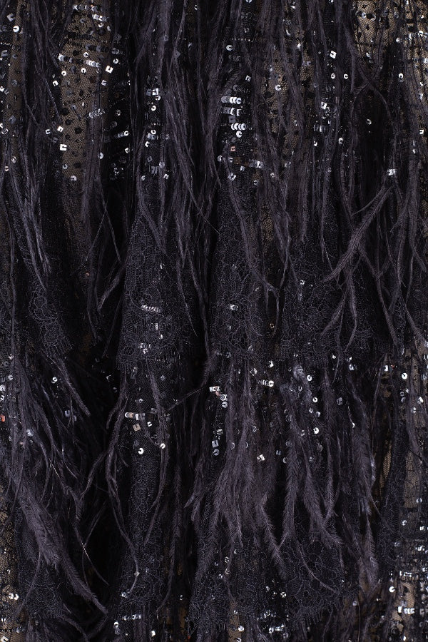 Feathered gowns were popular among the bright young things of the 1920s, and this dress echoes the party-ready nature of these designs. Crafted from black tulle, the bodice is held up by delicate spaghetti straps and is adorned with tiny, glittering black and silver sequins. A ruched panel of tulle forms the waistband, trimmed with black tulle ruffles. The skirt is generously tailored to a swirling, A-line silhouette from panels of black tulle and black lace. It is smothered in fluffy black ostrich feathers, and black and silver sequins to match the top. The dress is lined with cream silk for a comfortable, luxurious wear. It fastens under the left arm with a hidden tonal black zip.