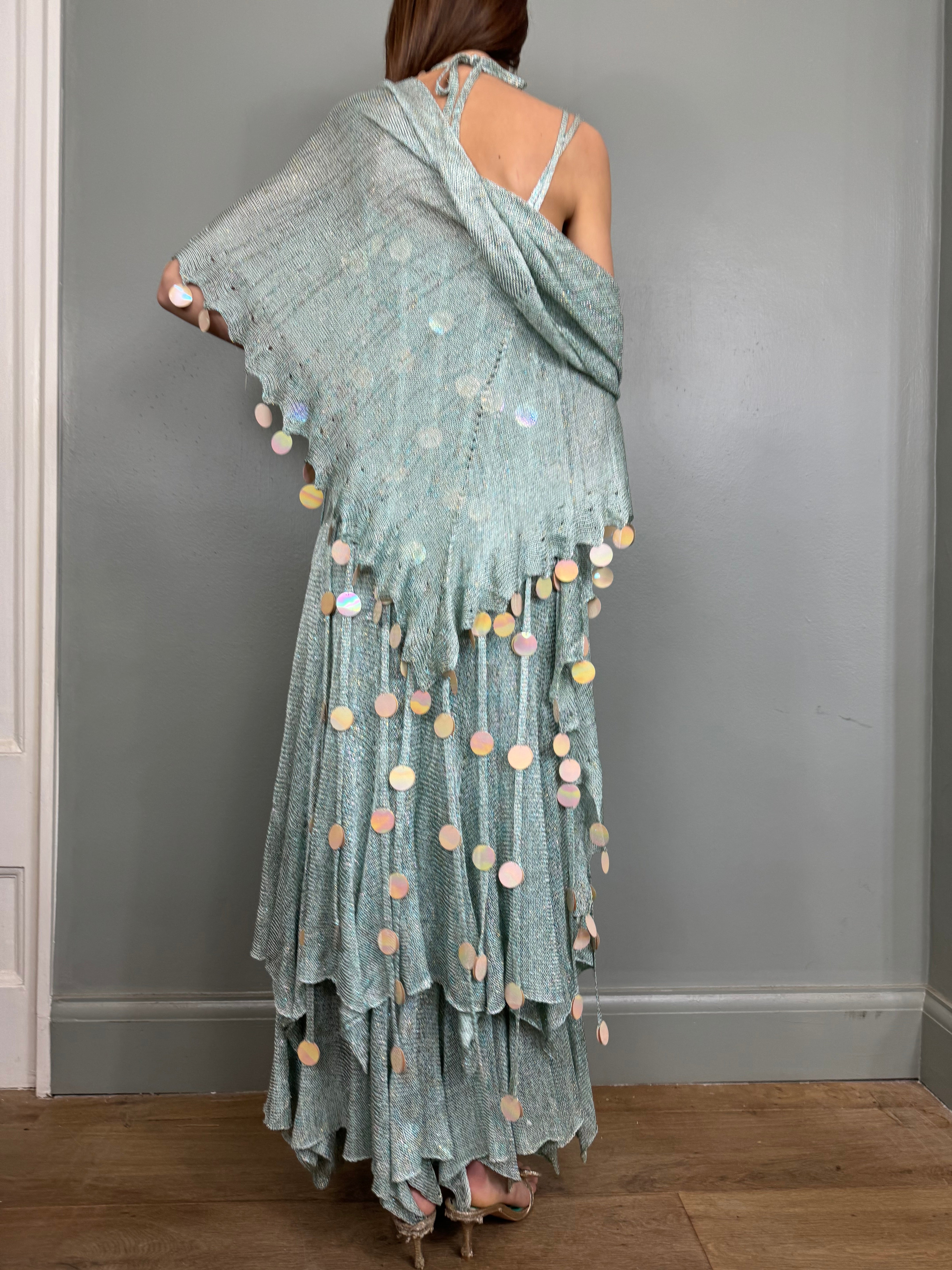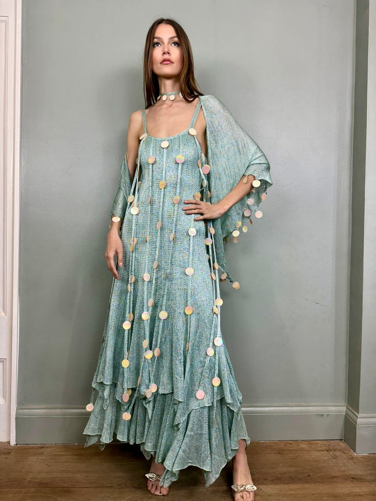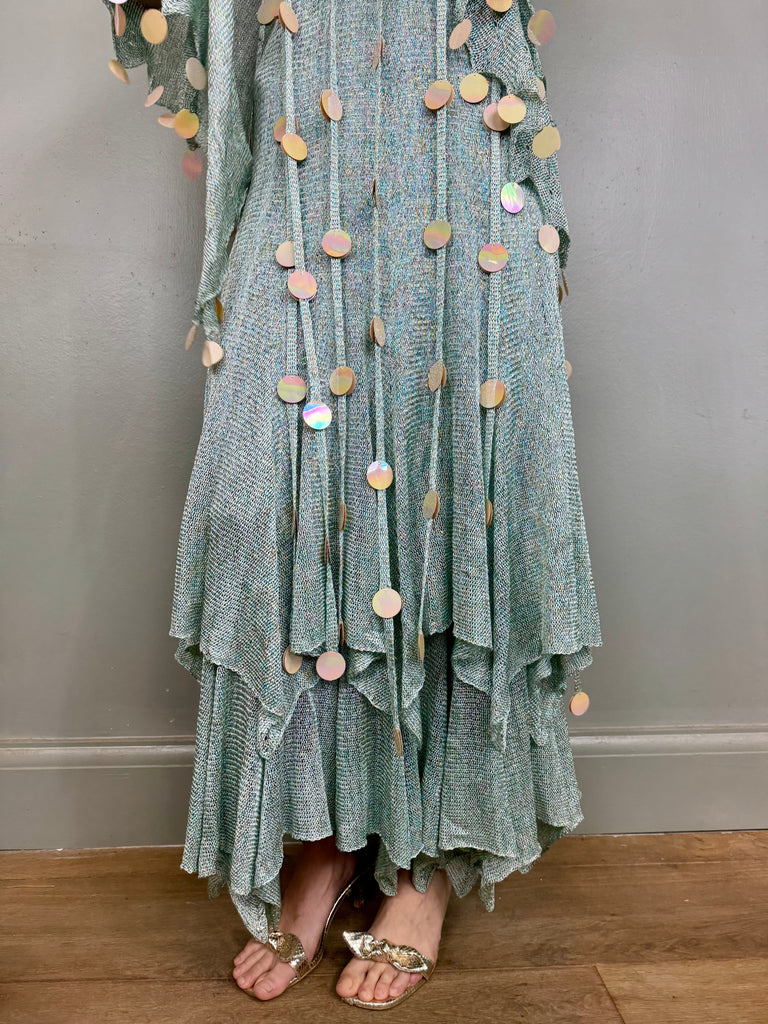 Adina, 70s blue knit ensemble with iridescent sequin fringing