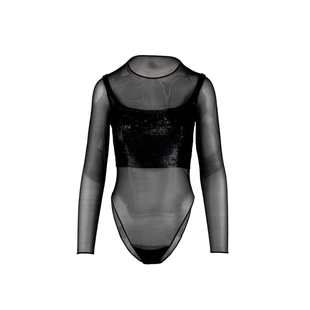 Collection Privée black bodysuit. Long sleeves, decorated with black sequins.
