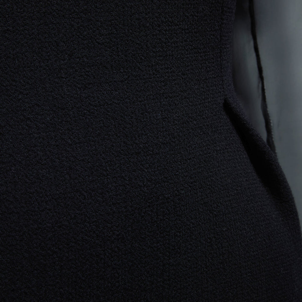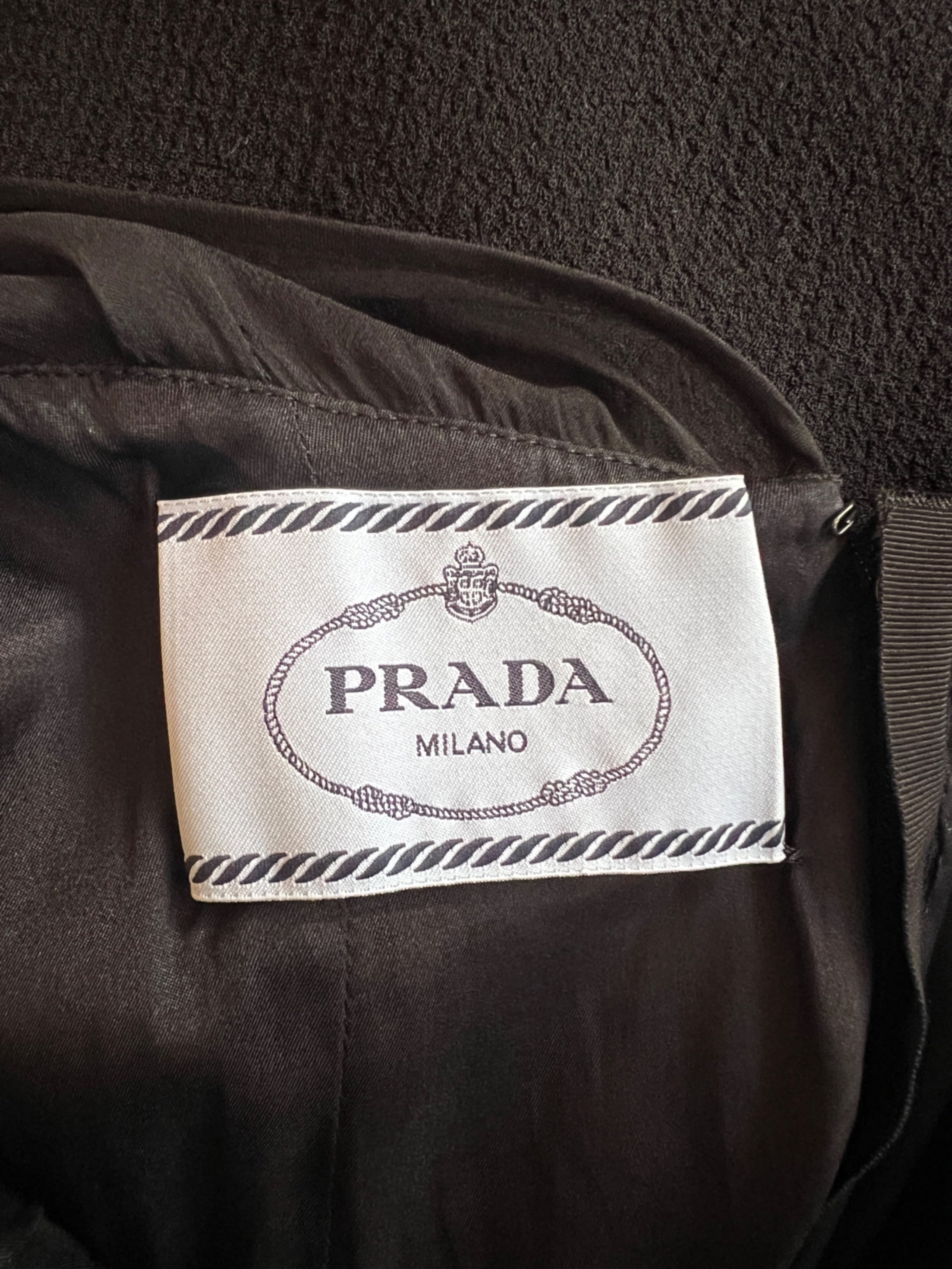 This elegant Prada dress, circa 2015, displays the elevated take on femininity that have become a part of Miuccia Prada’s signature style. Tailored from a black wool crepe with a lovely texture, it has a fit-and-flare silhouette that nips in at the waist and flares out into a flippy, playful skirt. The bust is cut to a sweetheart shape and, above that, sits sheer black chiffon across the front, back and forming the elegant long sleeves. The neckline is simple and rounded and there is a keyhole cut-out at the back which fastens with a fabric-covered button at the rear of the neck. There is a hidden tonal black zip at the rear to close the dress. The dress is lined in matte black silk throughout. The label is in Prada’s iconic pale blue with black lettering.