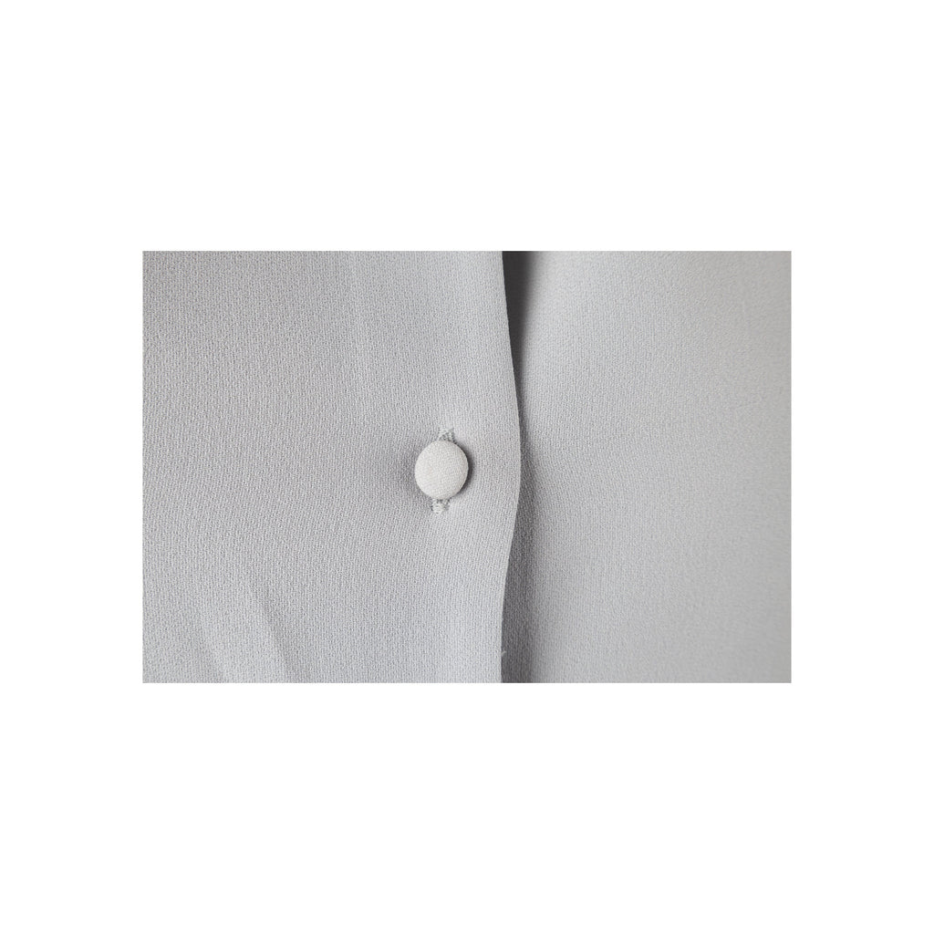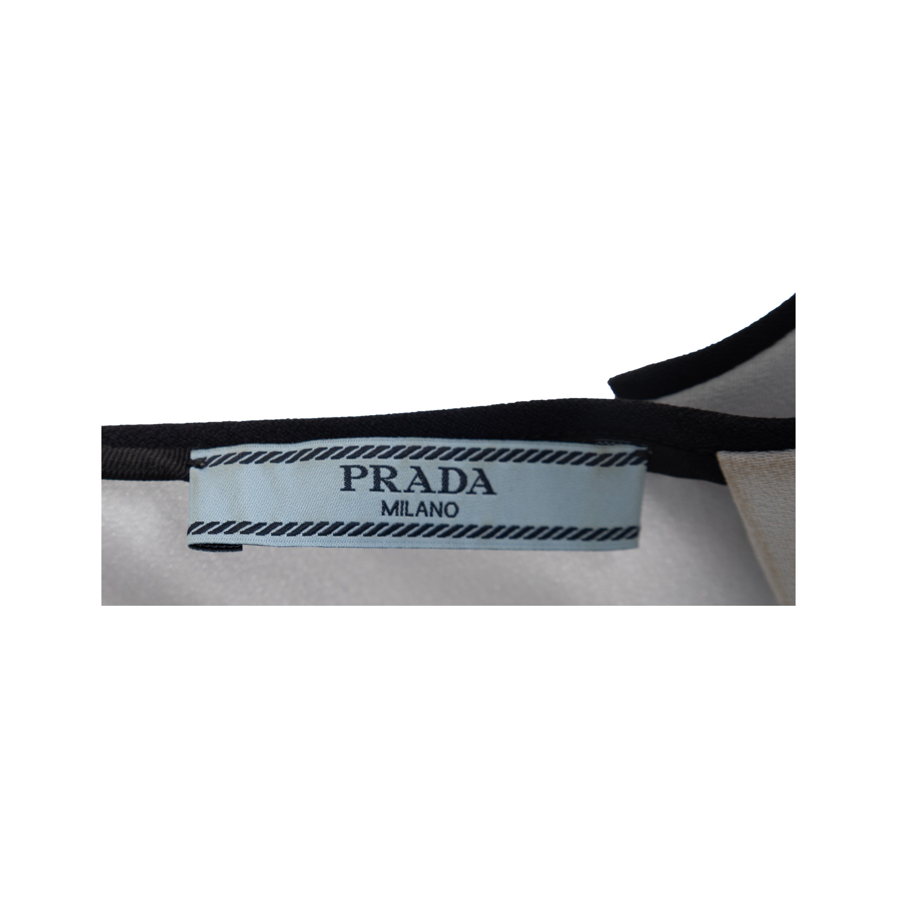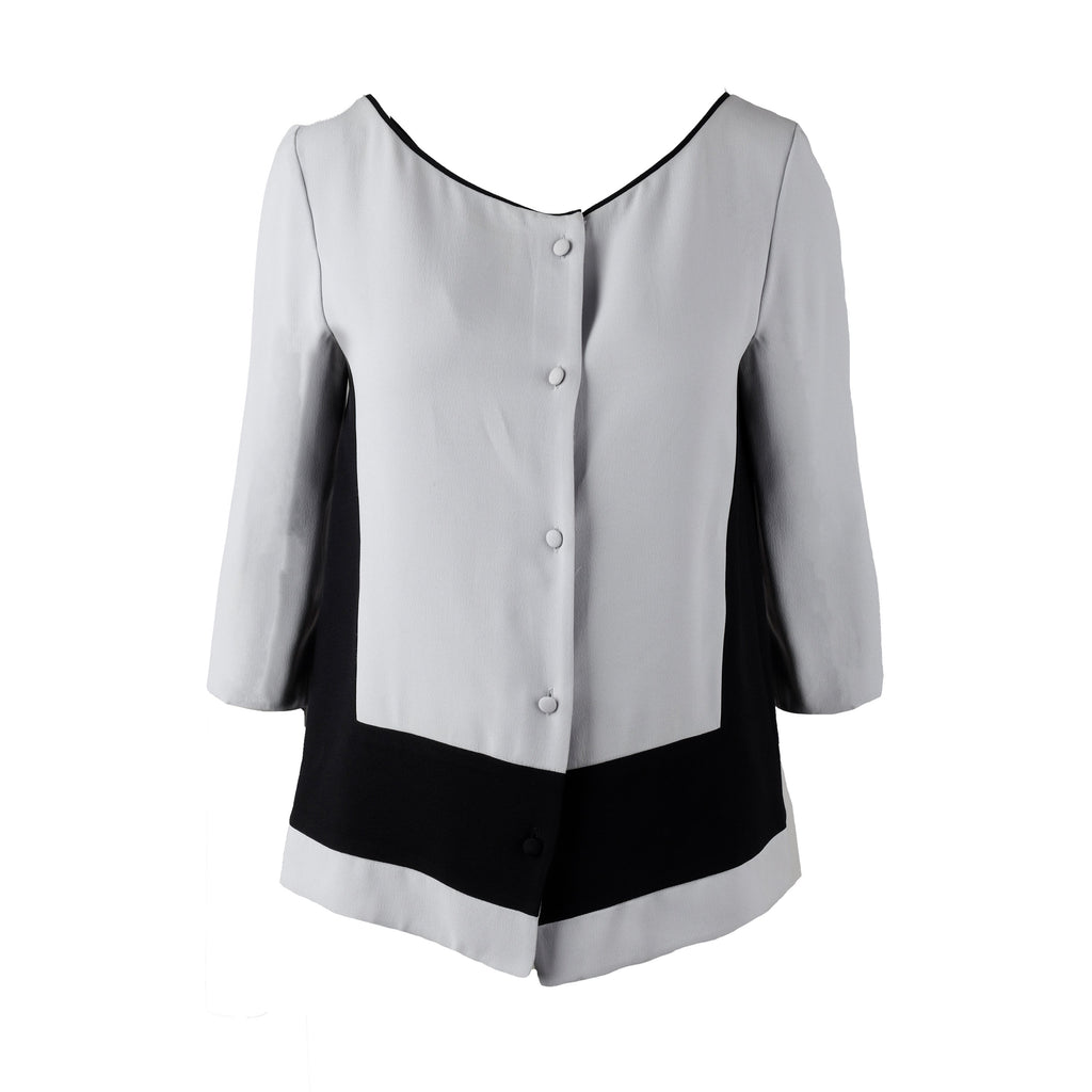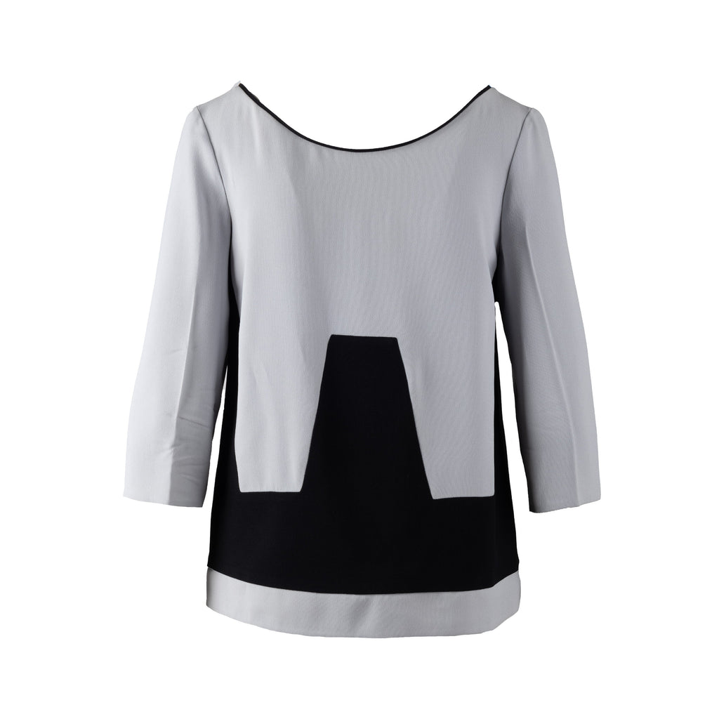 This Prada Color Block Top is perfect for creating a modern, sophisticated look. It features a long sleeve top in grey and black colorblock pattern, as well as boat neck with contrast piping. The back is complete with fabric covered buttons for an added touch.
