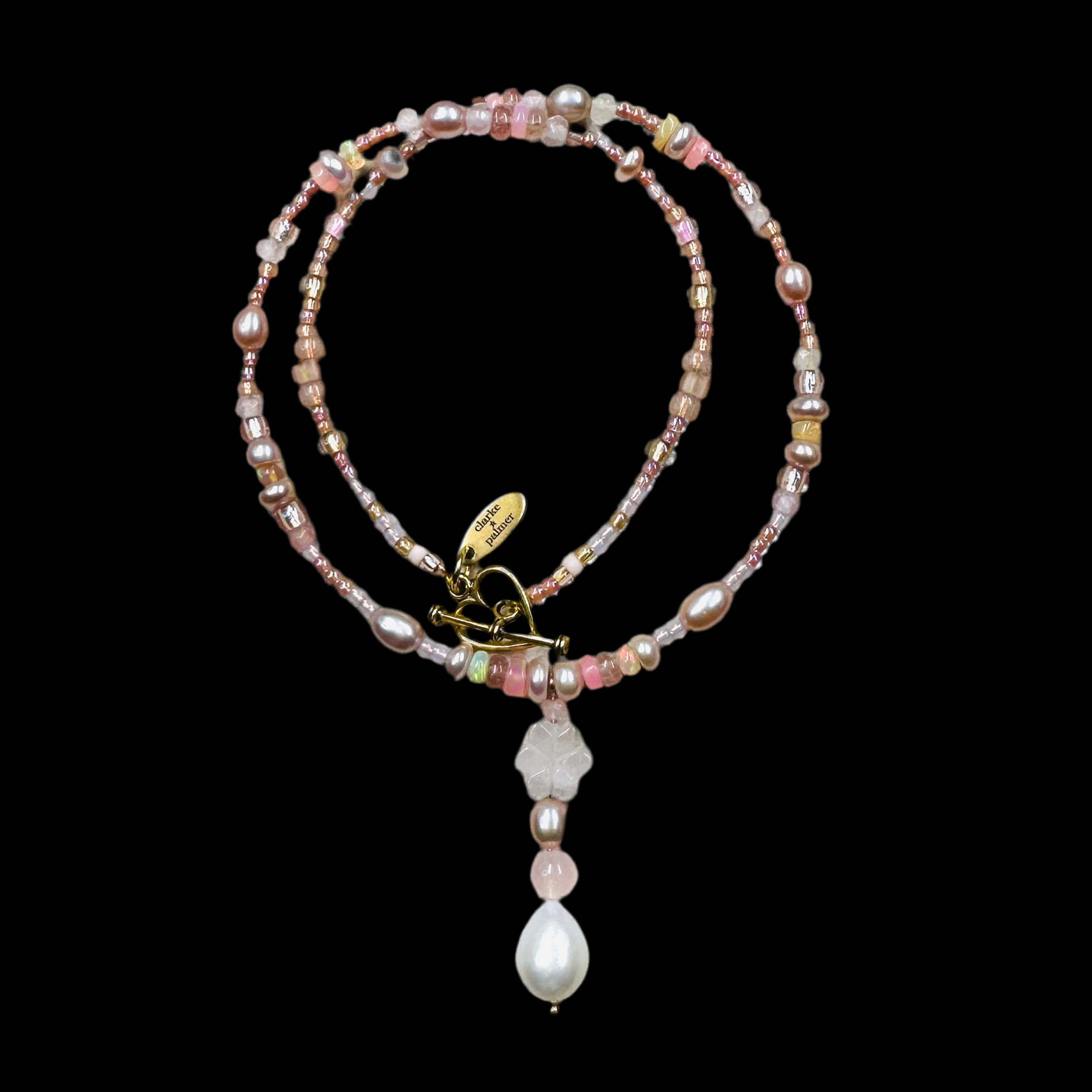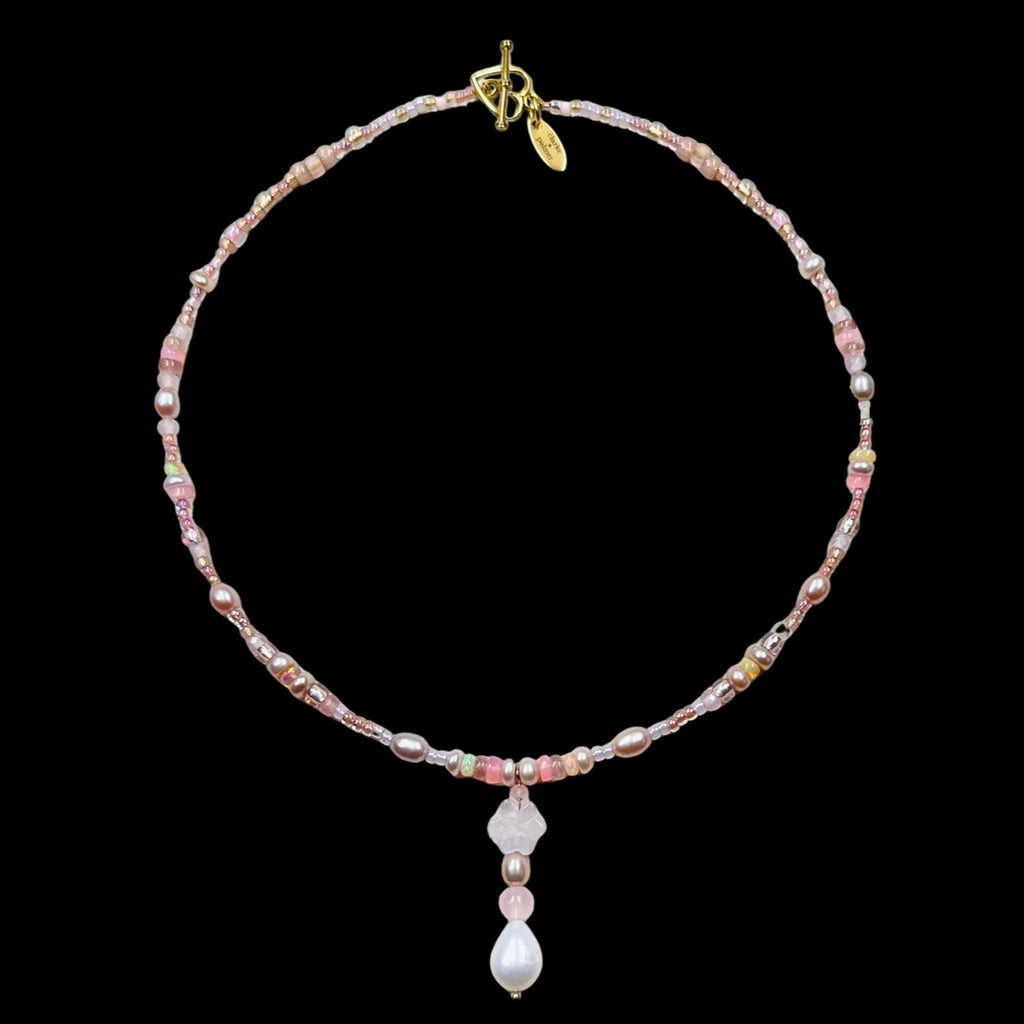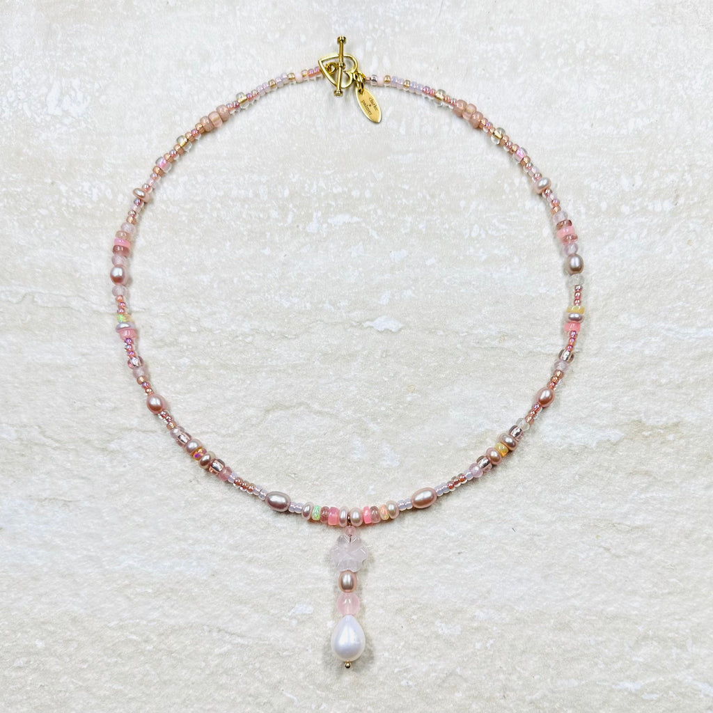 Our 'Angel' Necklace is handmade from glowing palest pink Ethiopian opals, strawberry quartz, lilac rondelle and oval pearls with an opal teardrop pearl pendant and 22 kt gold vermeil lobster clasp.