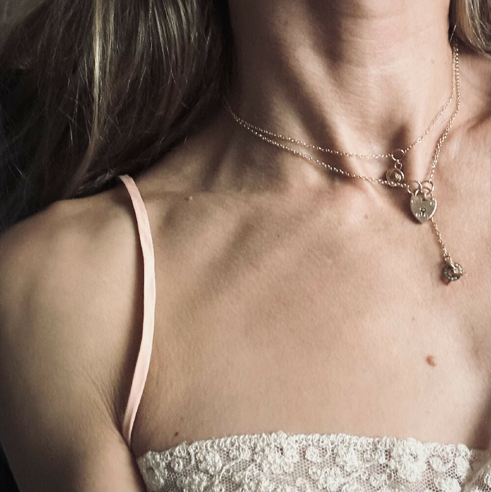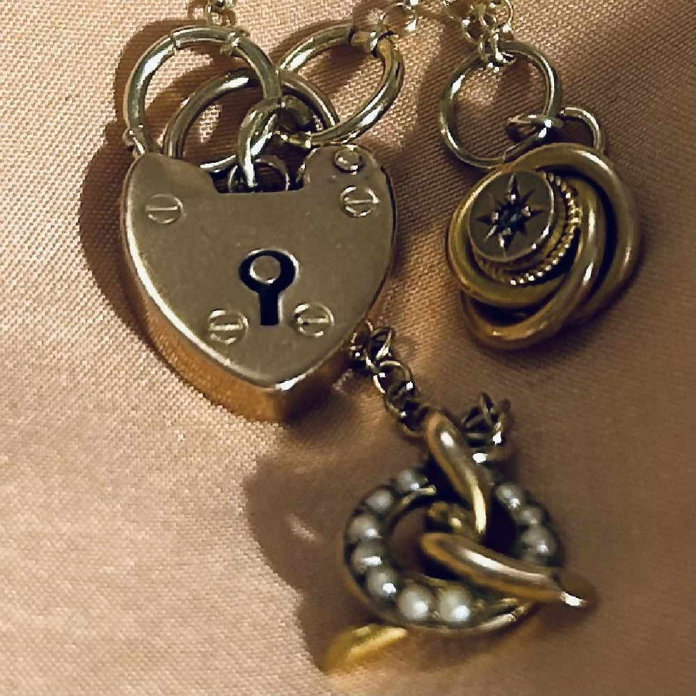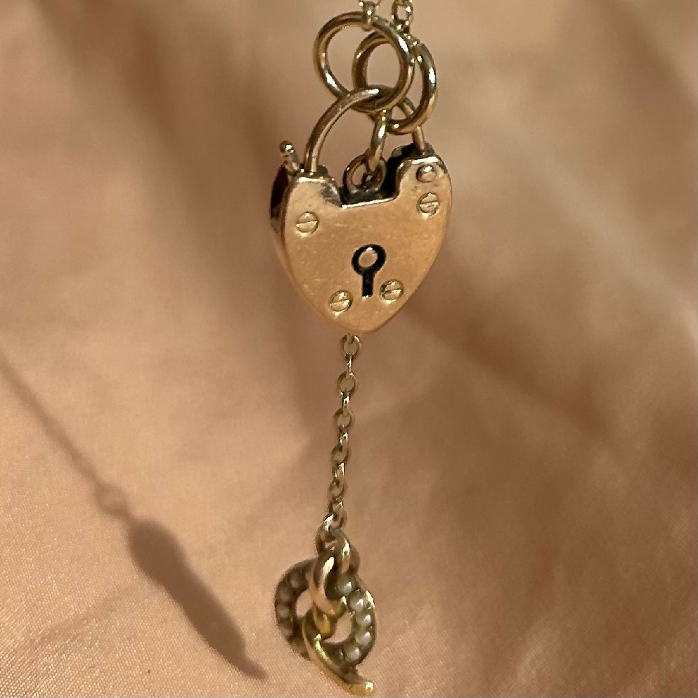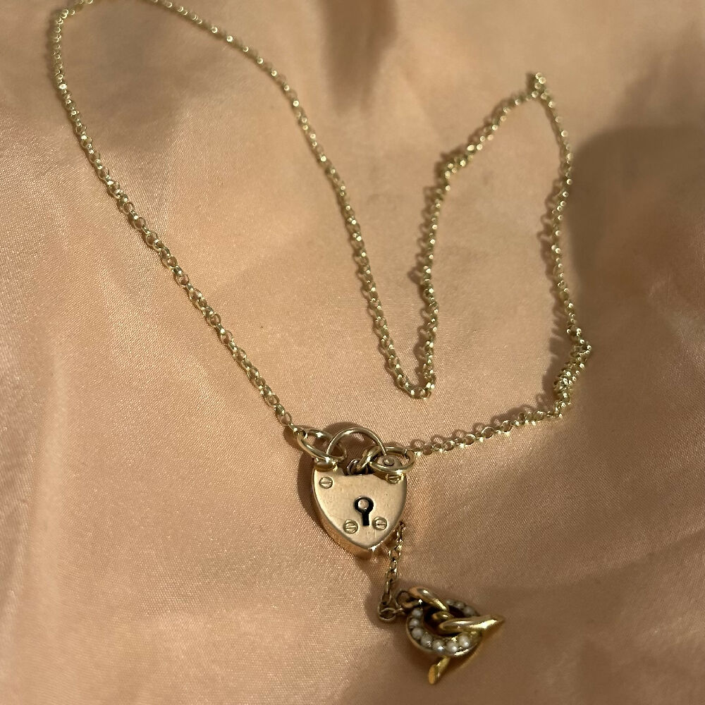 Edwardian Lovers locket fully hallmarked 9ct Birmingham 1907 is paired with a beautiful Victorian seed pearl lovers knot stamped 9ct on reverse. The pair hang beautifully from a modern belcher chain and fasten at the front with the working locket.