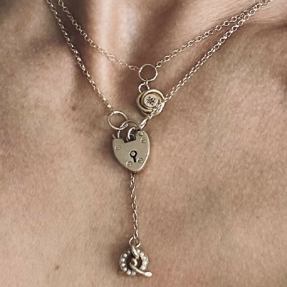 The padlock locket symbolises love , commitment and security in a relationship because it represents locking one's heart or keeping a loved one safe and secure. The motif originated in the Georgian era.