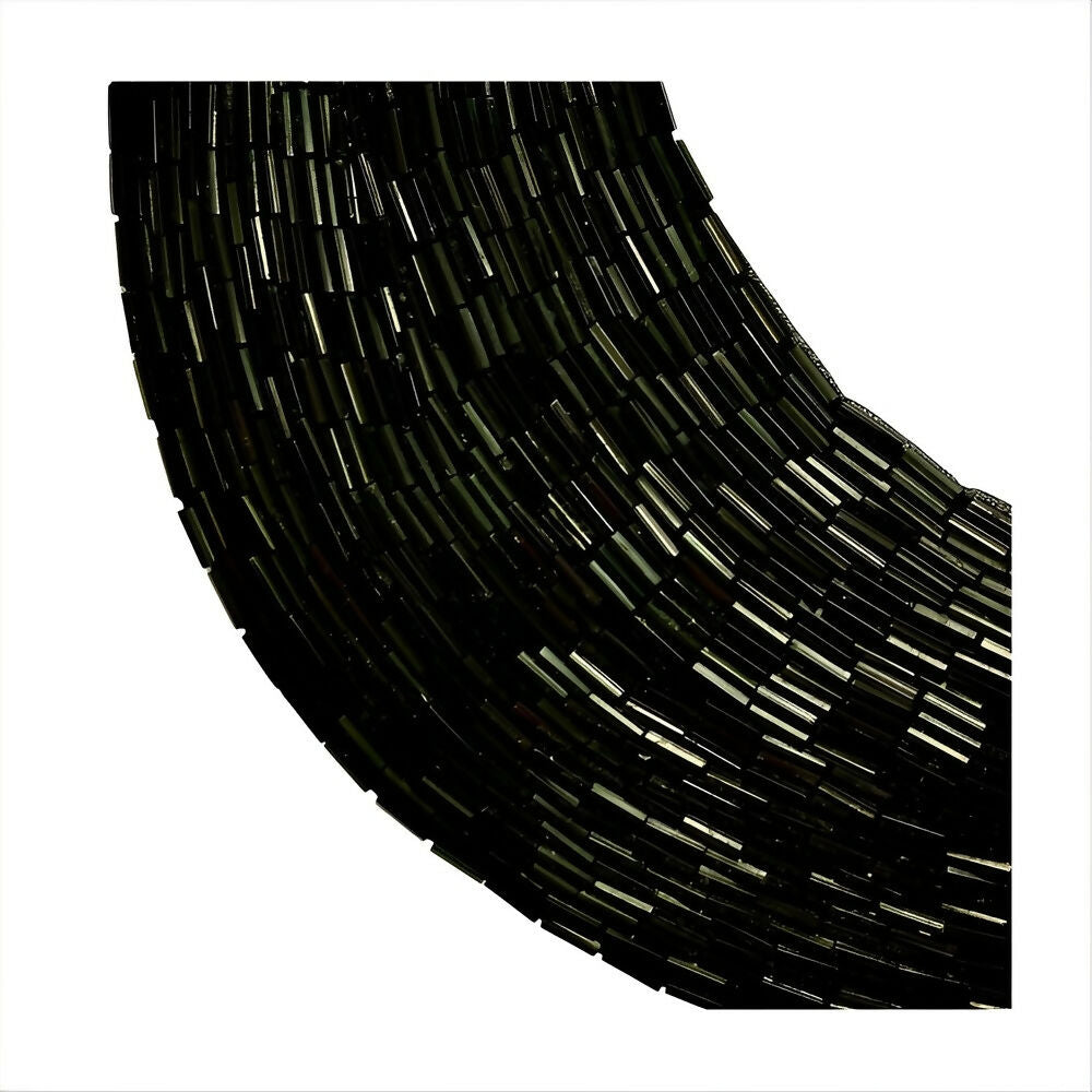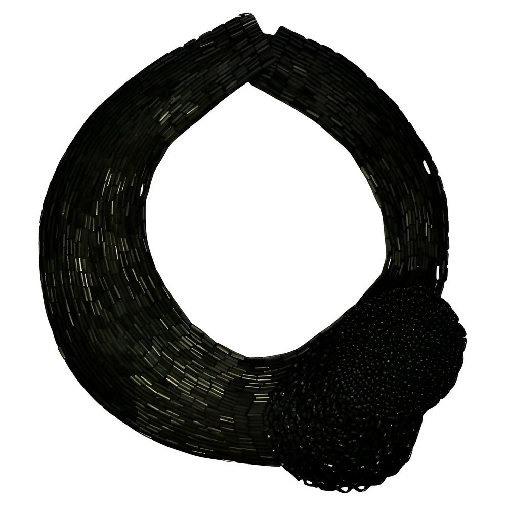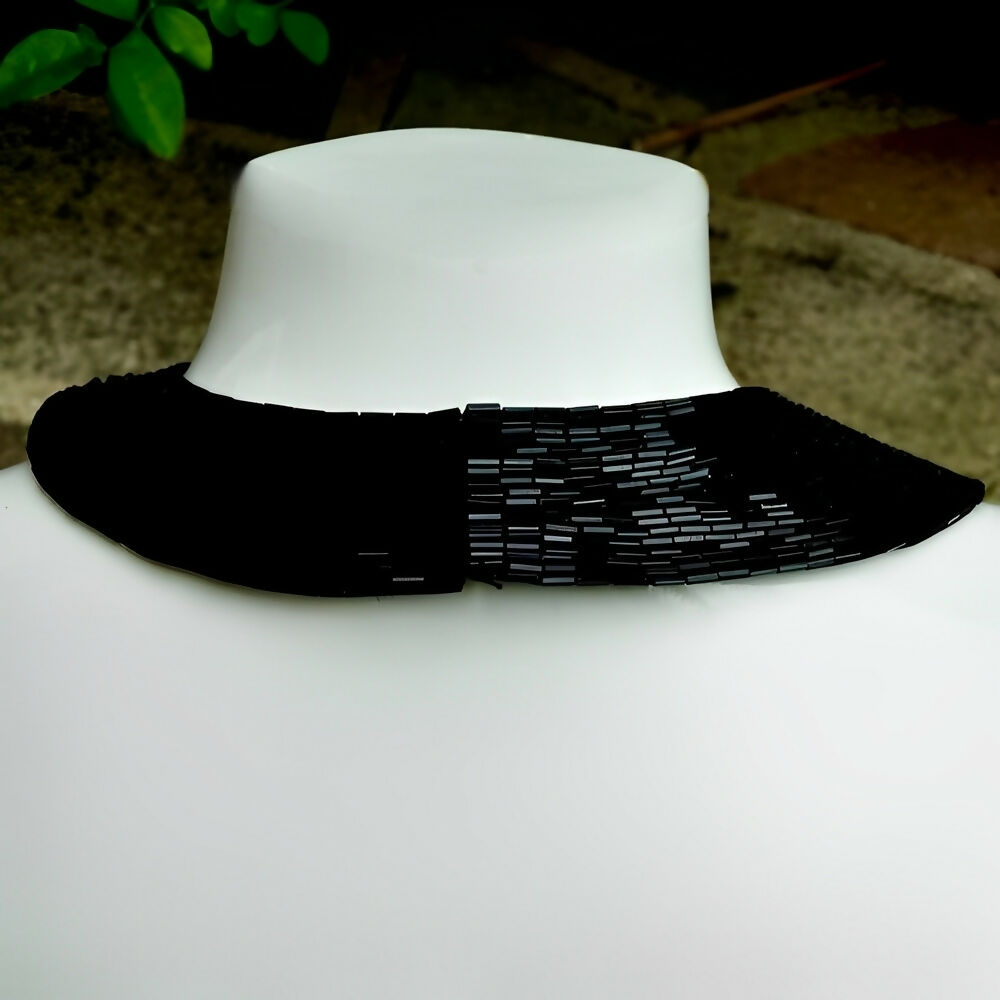 Wonderful black leather and black beaded collar necklace with abstract flower detail.