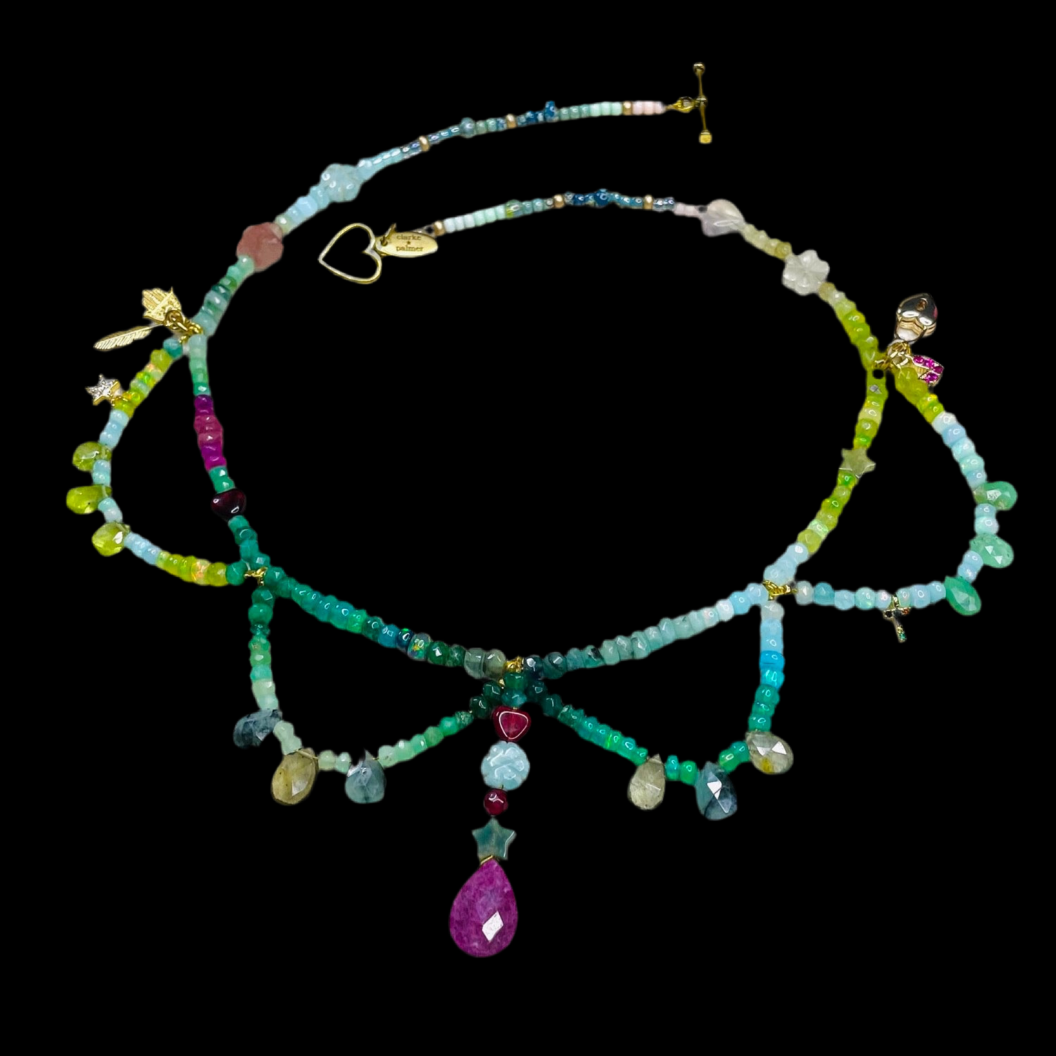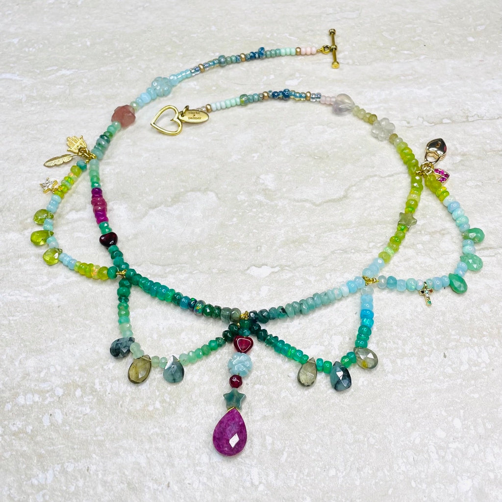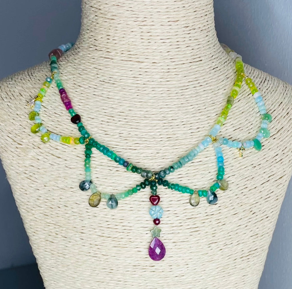 Our Heart of the World Everything chandelier necklace is a homage to the beauty of Mother Nature. It blends ombré  shades of Ethiopian opal, emerald, chrysoprase, moss aquamarine, ruby, peridot, adventurine and strawberry Quartz.