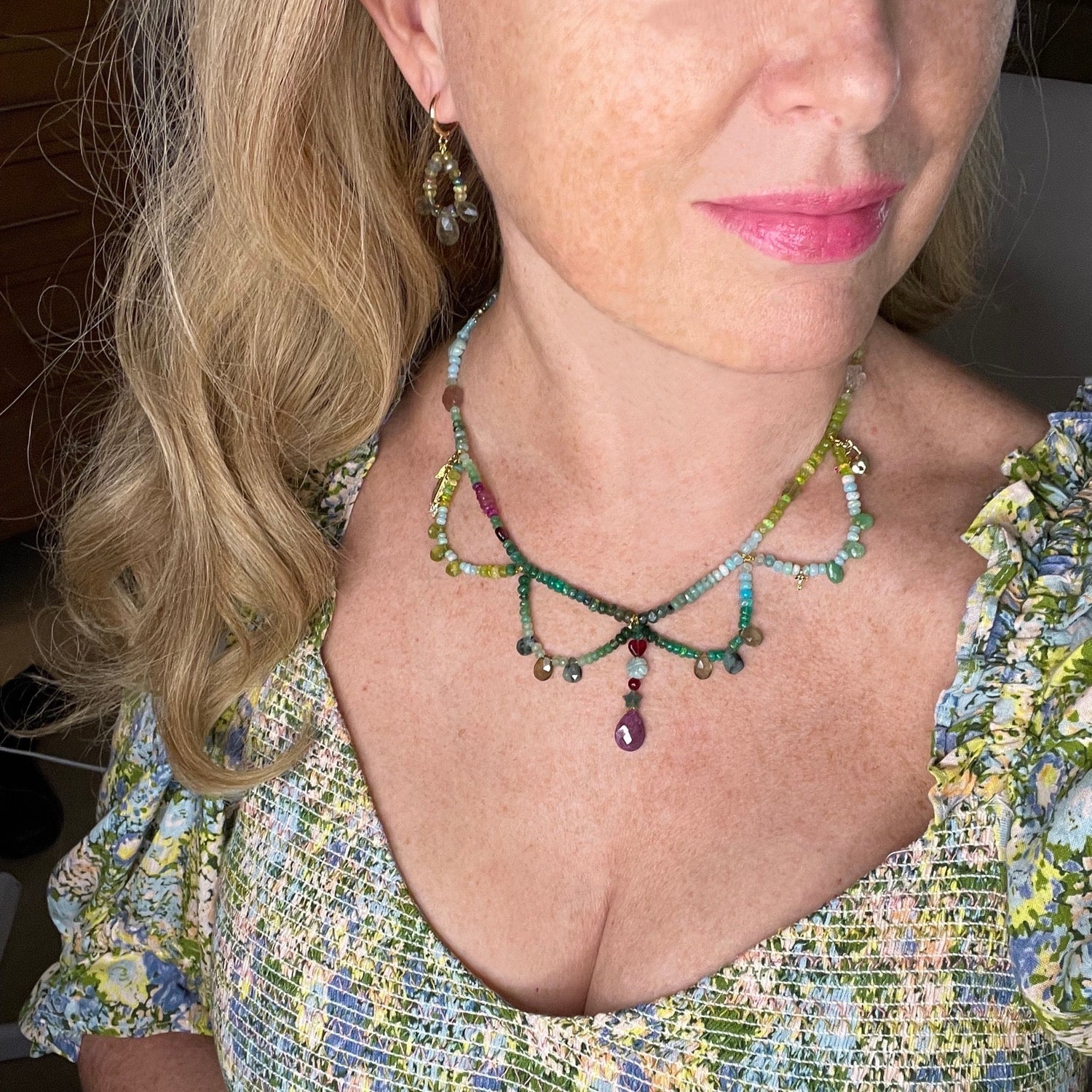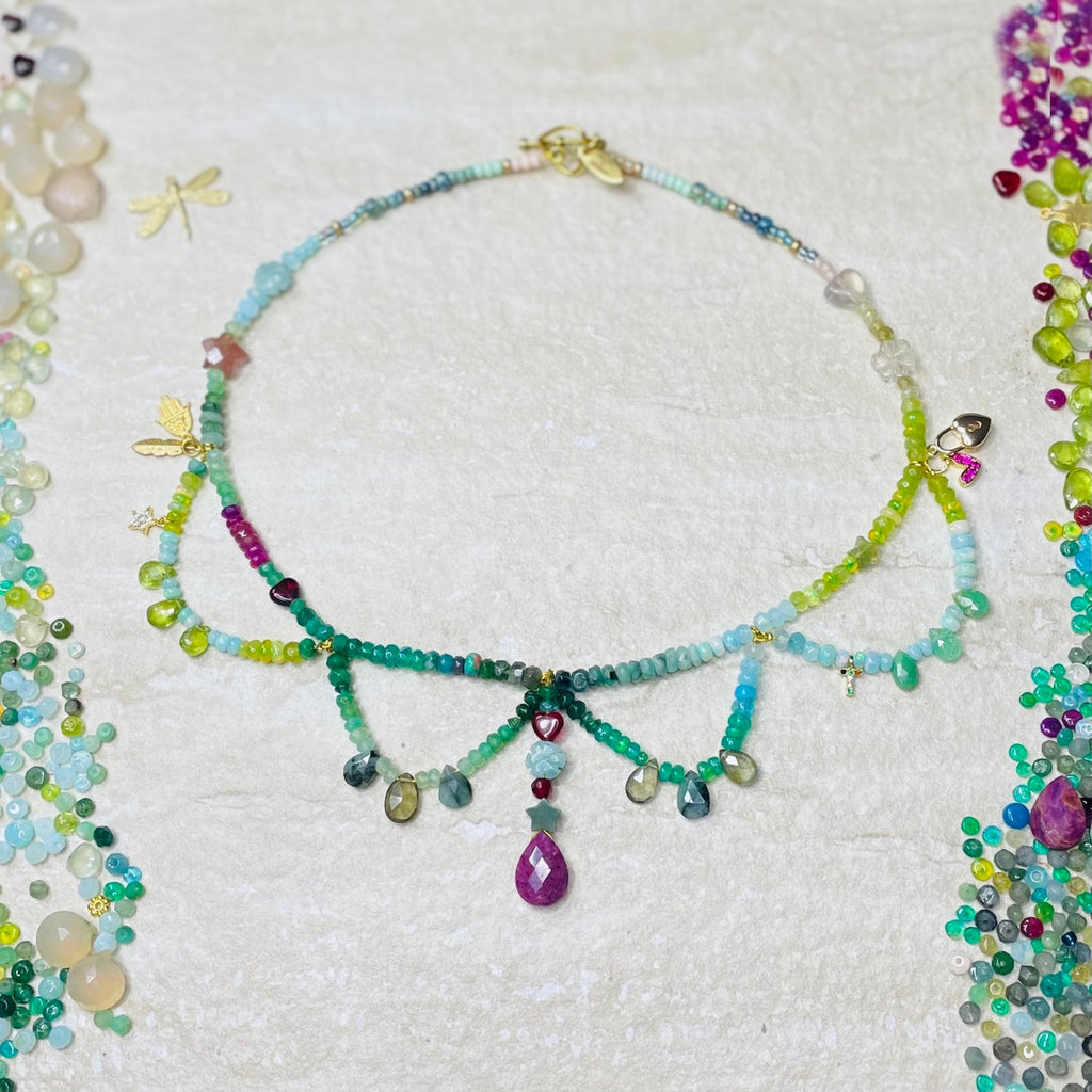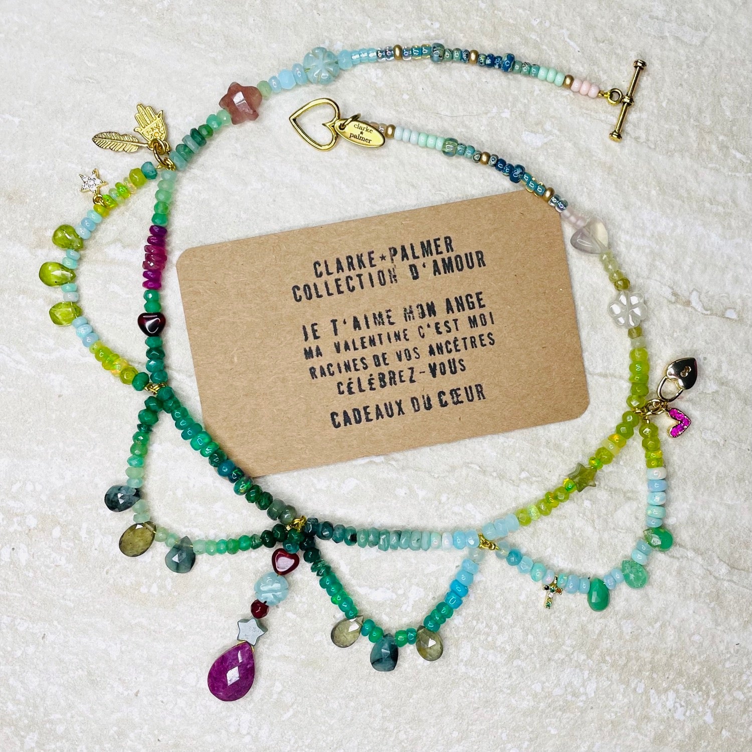 Our Heart of the World Everything chandelier necklace is a homage to the beauty of Mother Nature. It blends ombré  shades of Ethiopian opal, emerald, chrysoprase, moss aquamarine, ruby, peridot, adventurine and strawberry Quartz.