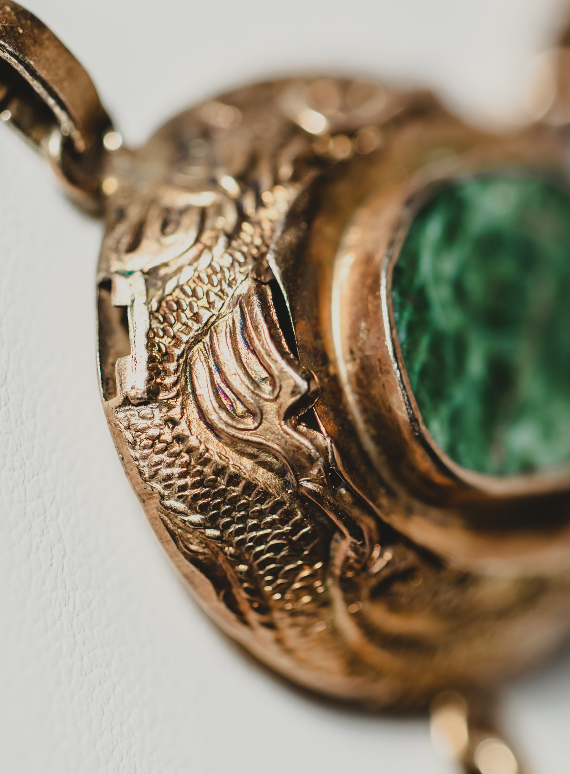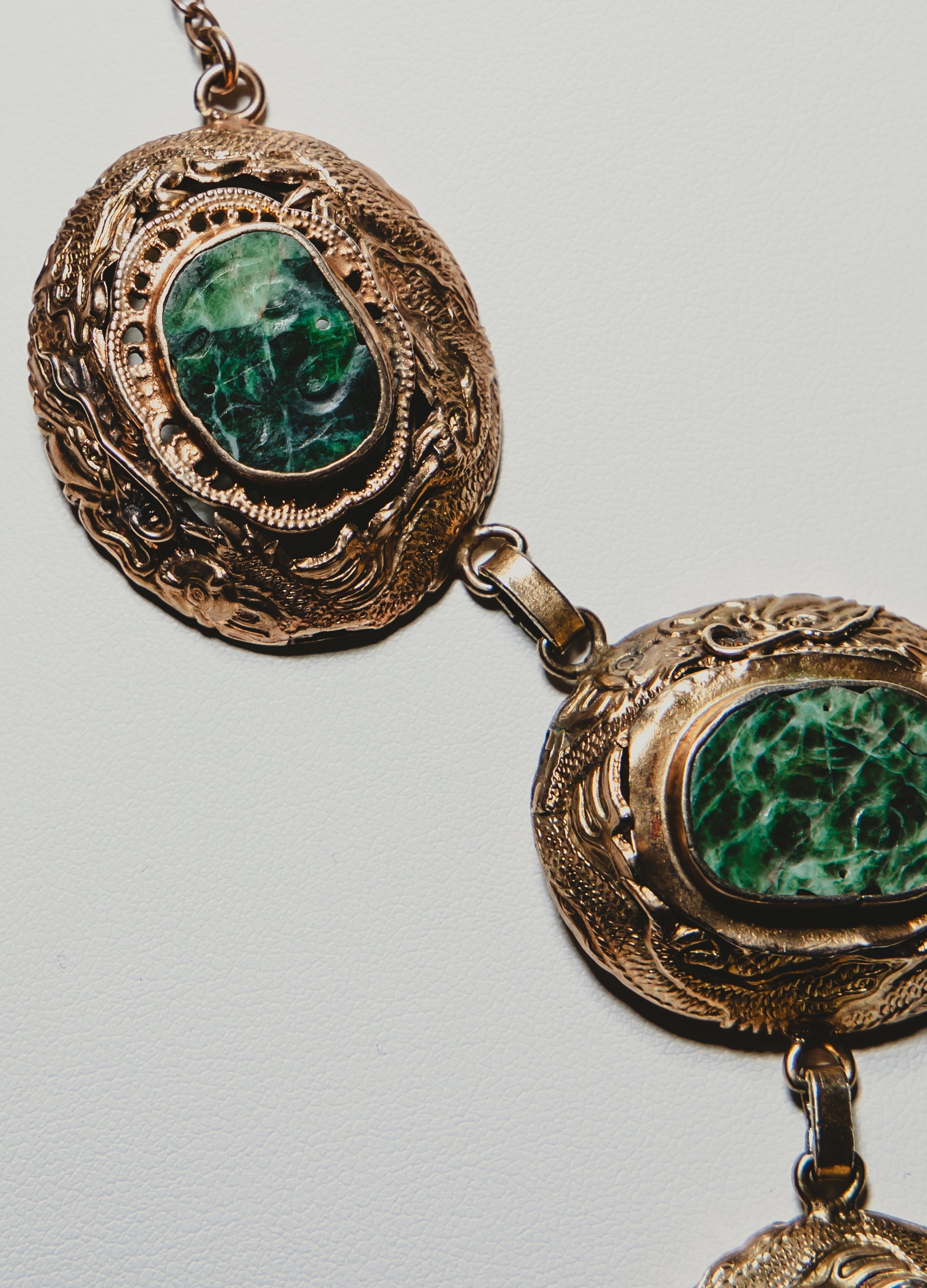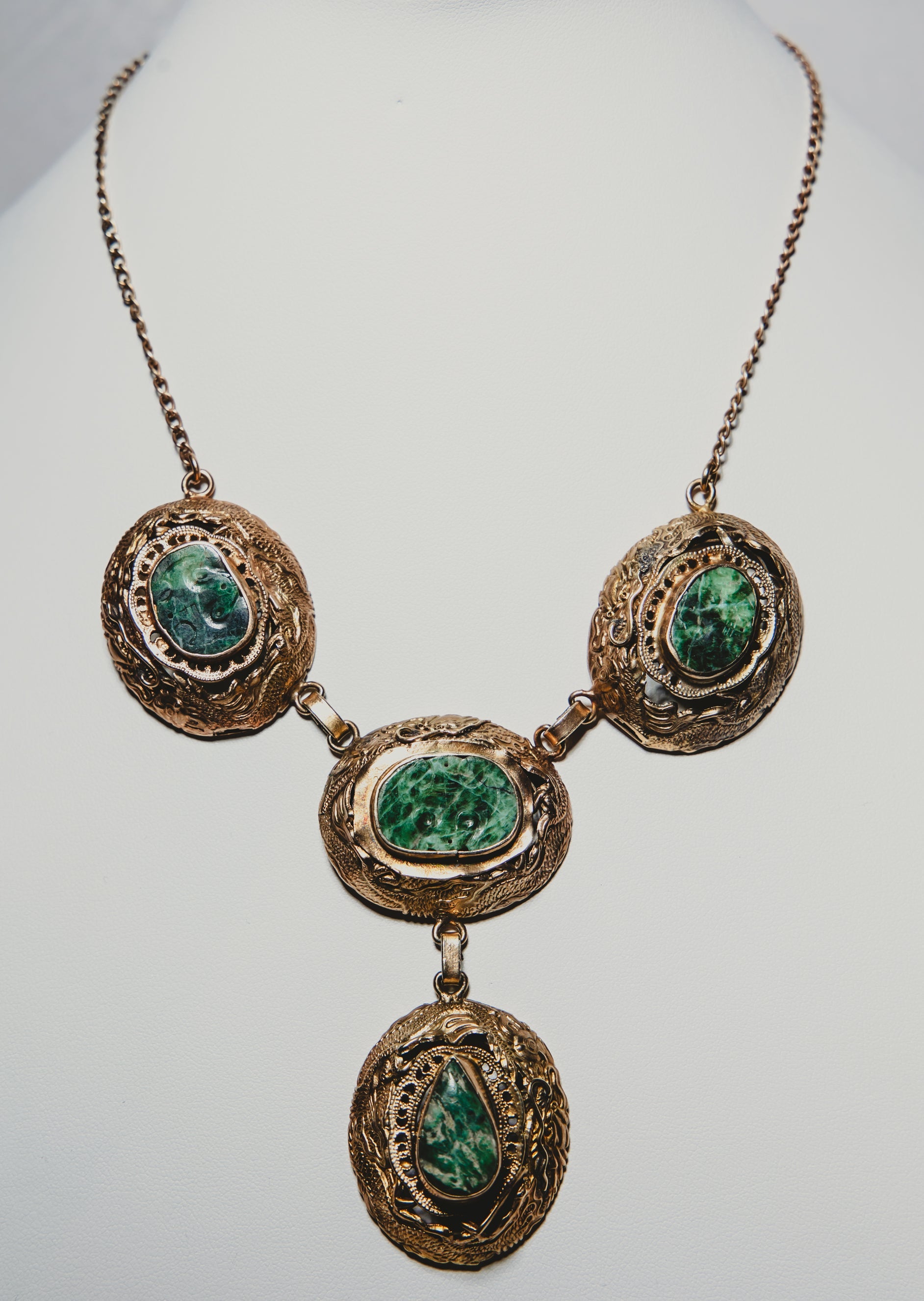 Four pieces of gorgeous, carved green jade are set in dragon bezels, beautifully crafted from sterling silver with a gold wash.