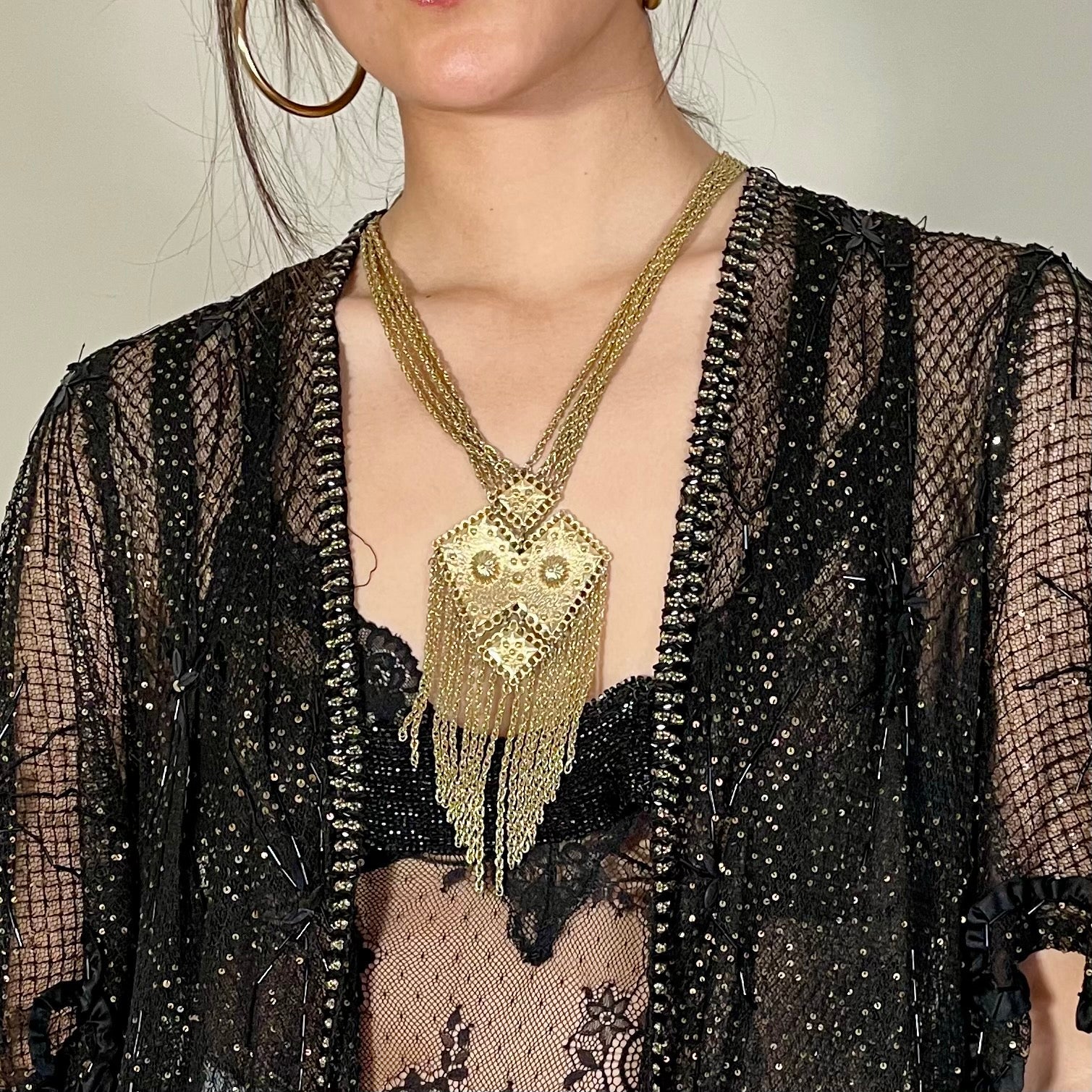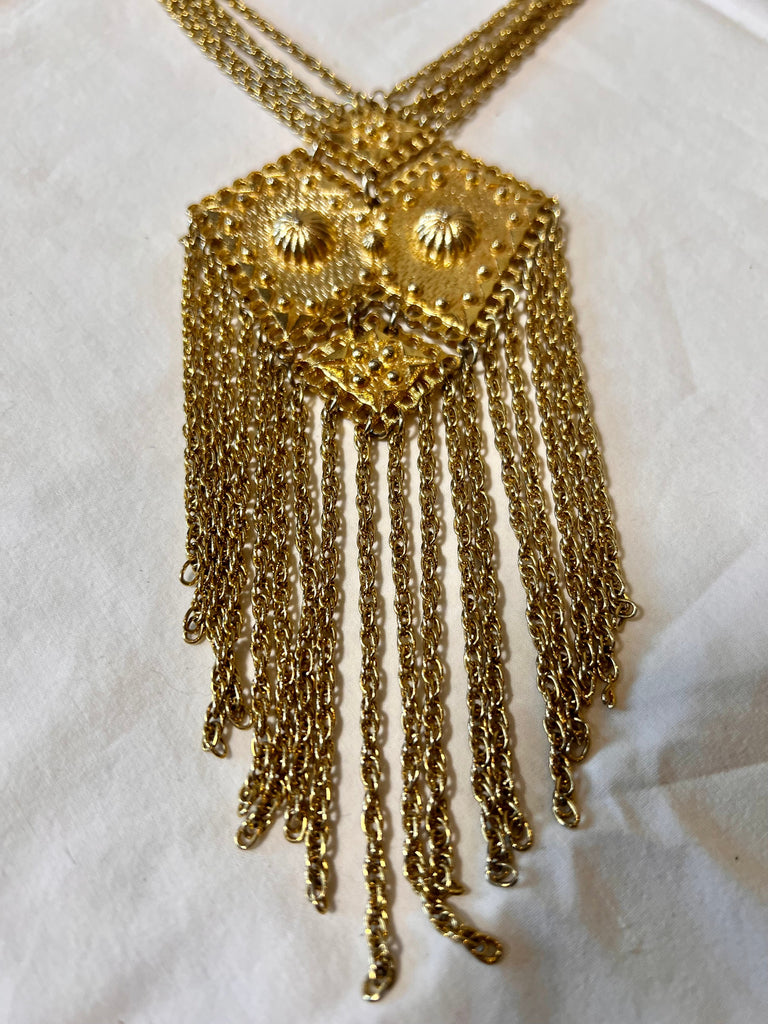 Fabulous gold plated fringed necklace with multi strand chain detail. Has a neat clasp and a central large articulated motif. A great layering piece with so much flair.