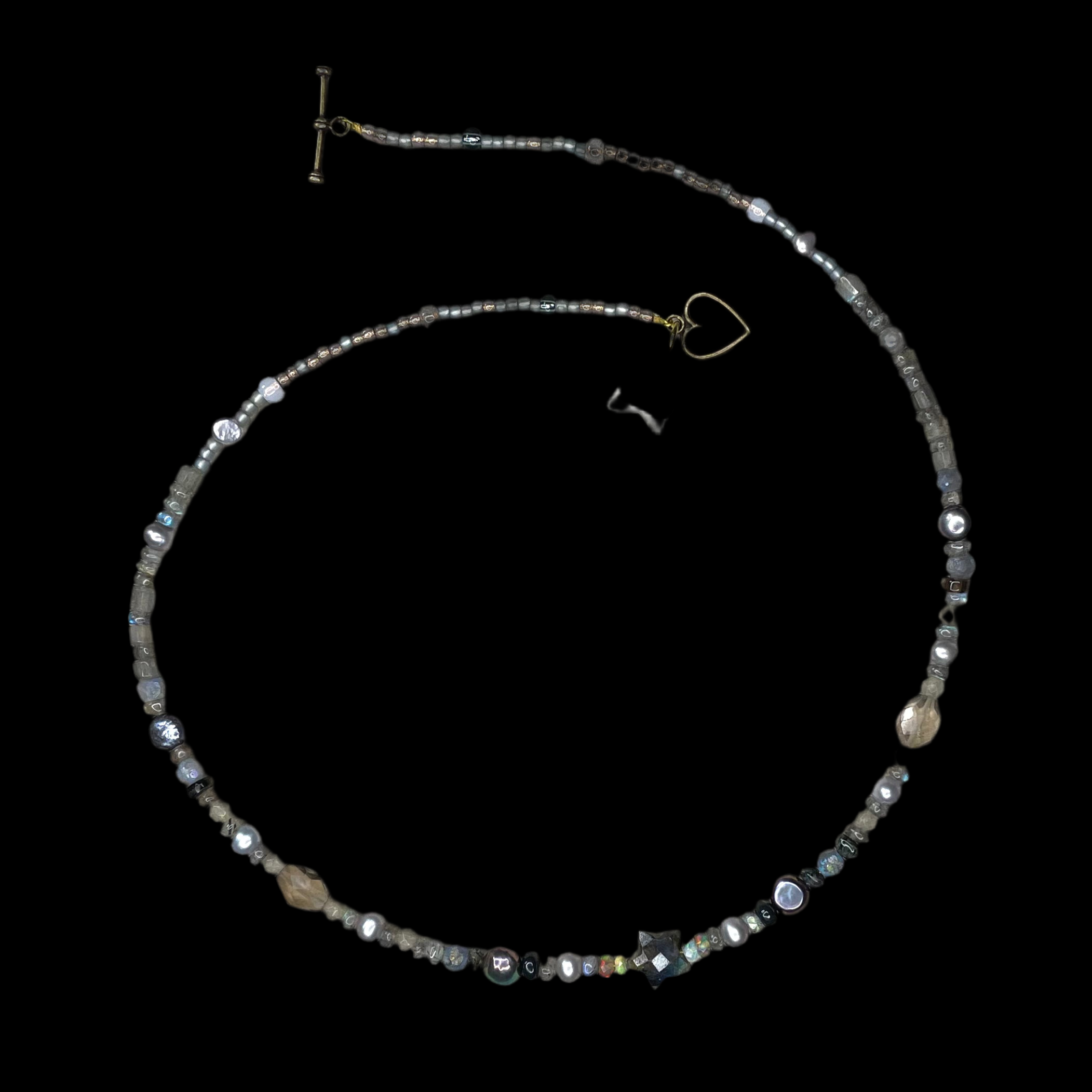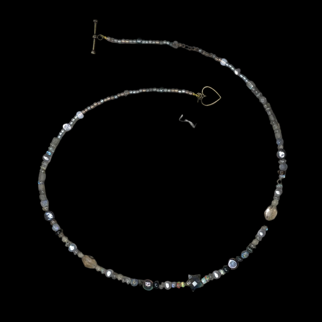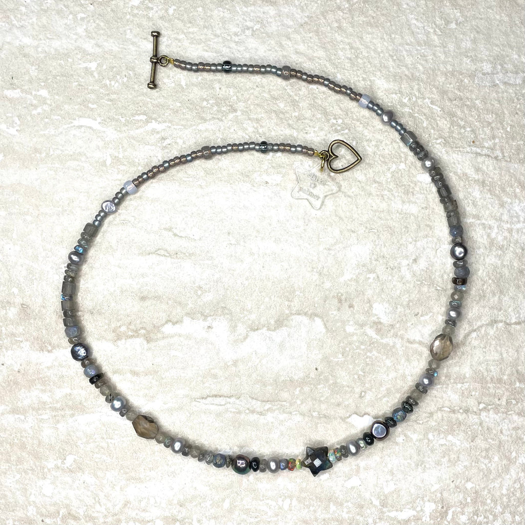 This beautiful necklace is handmade from silver grey pearls, glowing natural shades of Ethiopian opals, smoky Quartz and labradorite sustainably sourced rondelles. It is centred by a hand cut labradorite star. This gorgeous necklace has a 24kt gold vermeil heart toggle clasp and you can choose your preferred length and add tiny cz letters in the options.