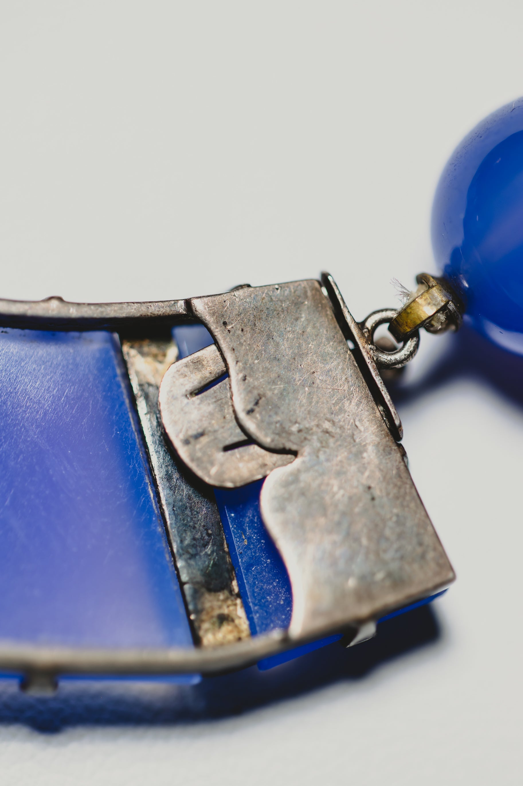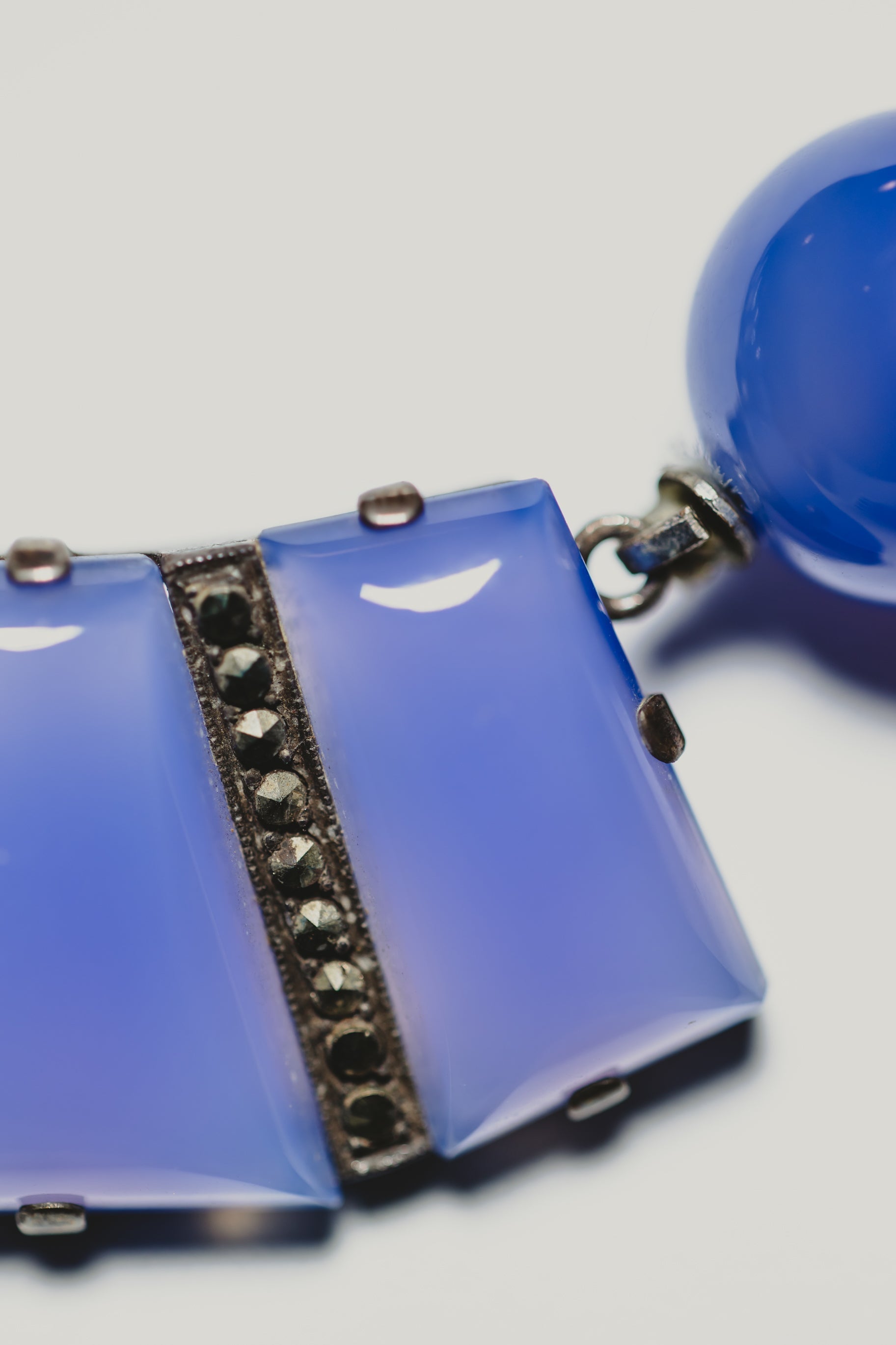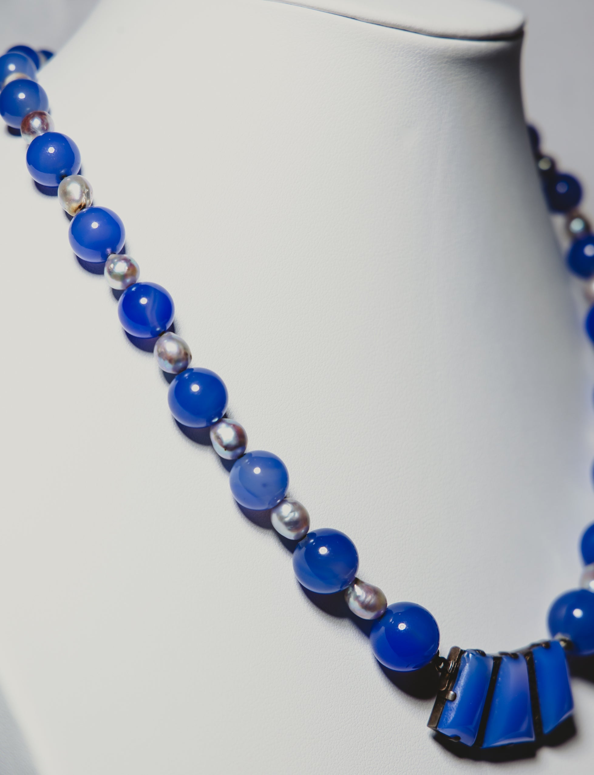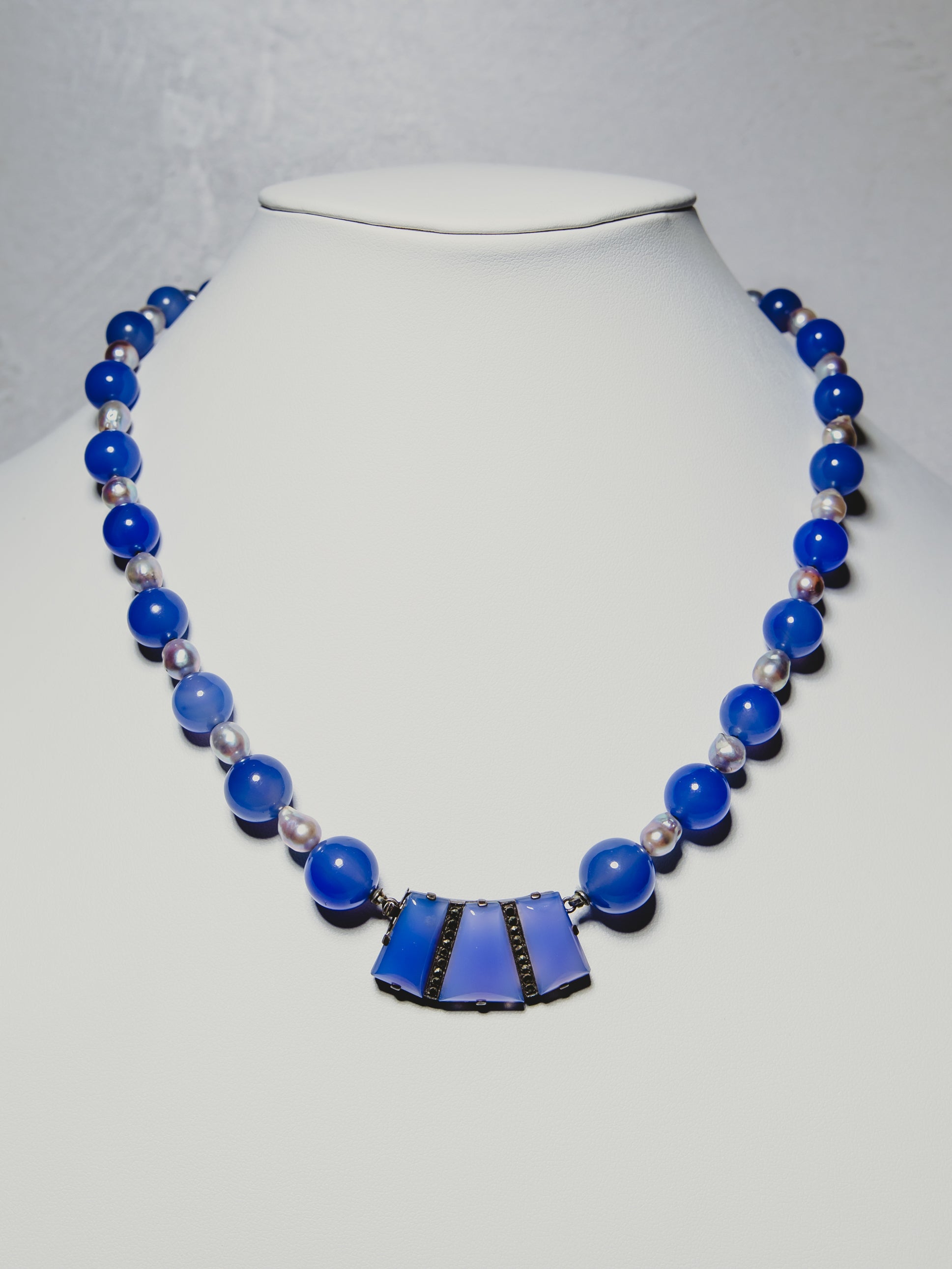 - Materials: Dyed lavender agate, marcasite, blue baroque pearls.
