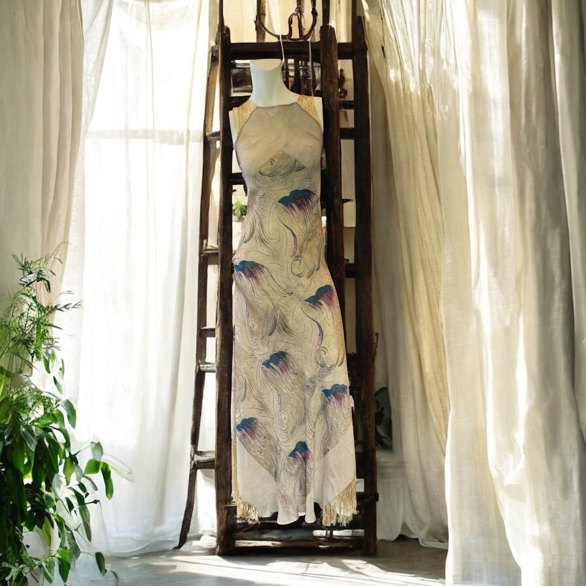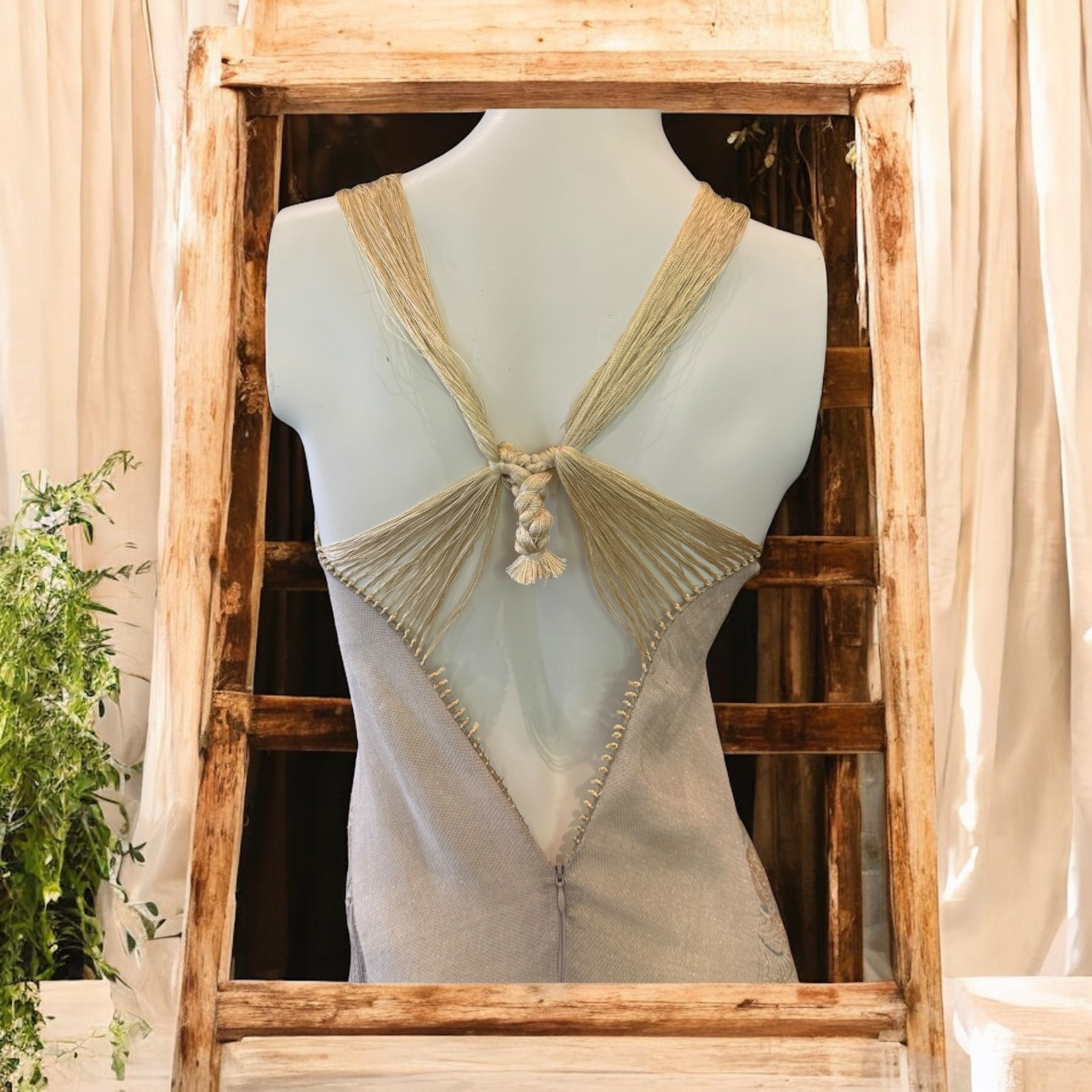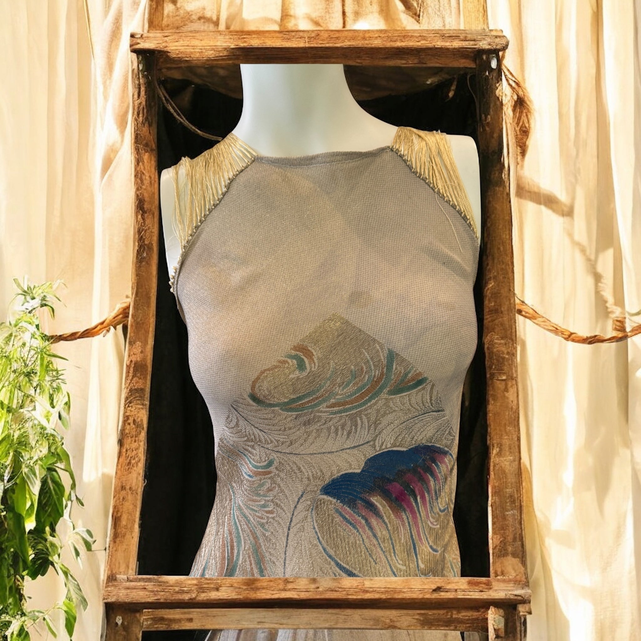 This unique reworked 1920s gold silk lamé dress features an elegant bias cut and a distinctive macramé shoulder strap that fastens at the back. Designed with a concealed zip, it offers a streamlined silhouette, while the delicate fringe along the hem adds authentic vintage movement and charm. Perfect for those seeking a one-of-a-kind statement piece with expert craftsmanship and timeless appeal.