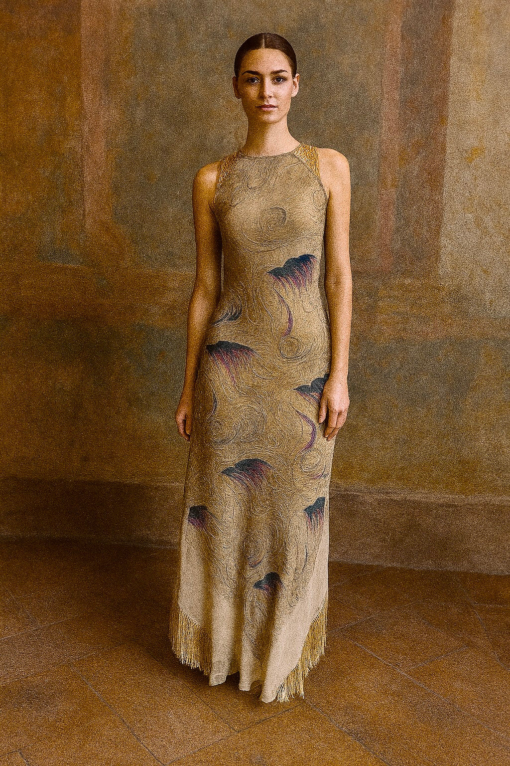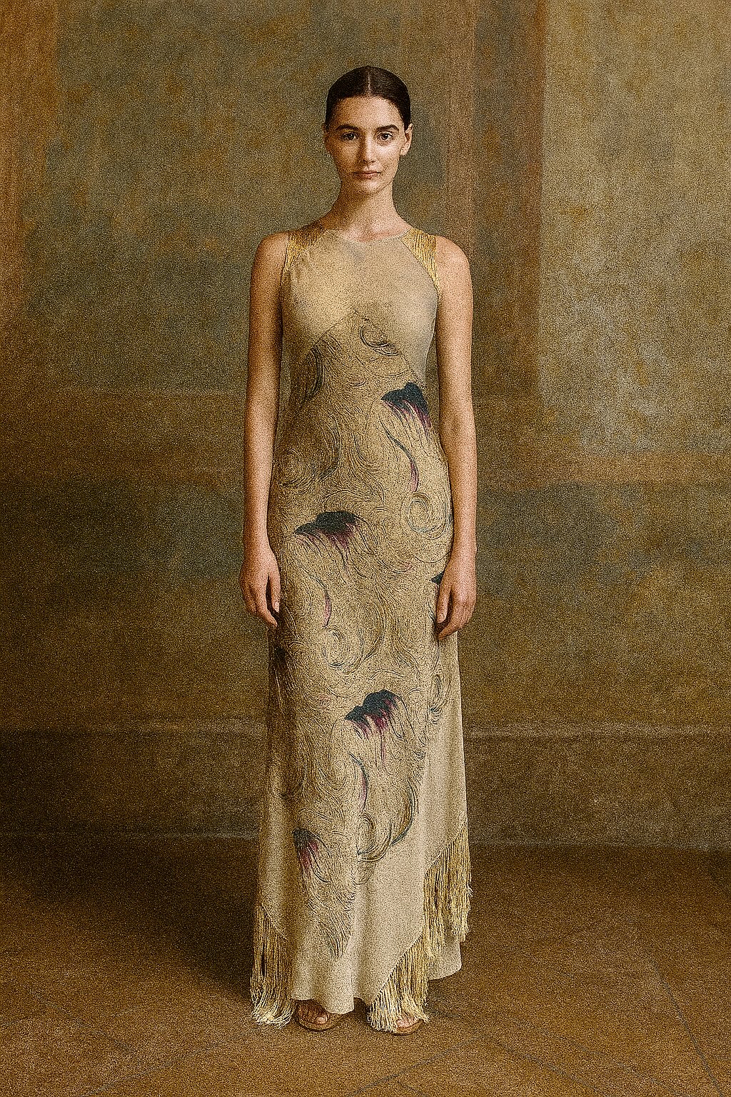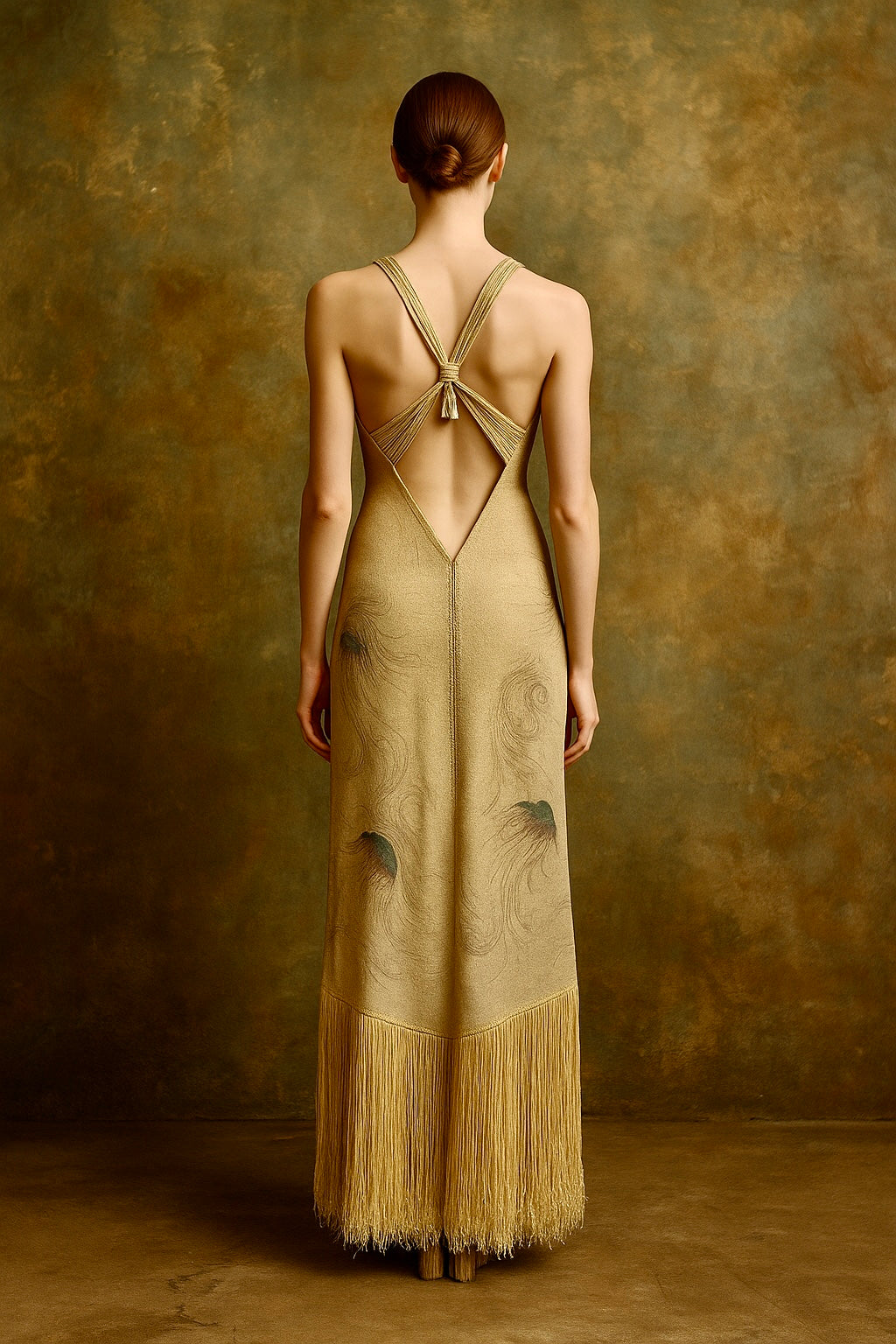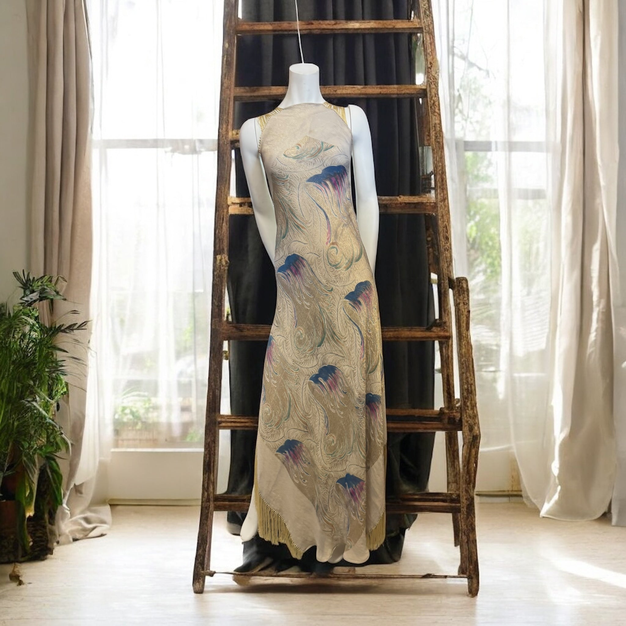 This unique reworked 1920s gold silk lamé dress features an elegant bias cut and a distinctive macramé shoulder strap that fastens at the back. Designed with a concealed zip, it offers a streamlined silhouette, while the delicate fringe along the hem adds authentic vintage movement and charm. Perfect for those seeking a one-of-a-kind statement piece with expert craftsmanship and timeless appeal.