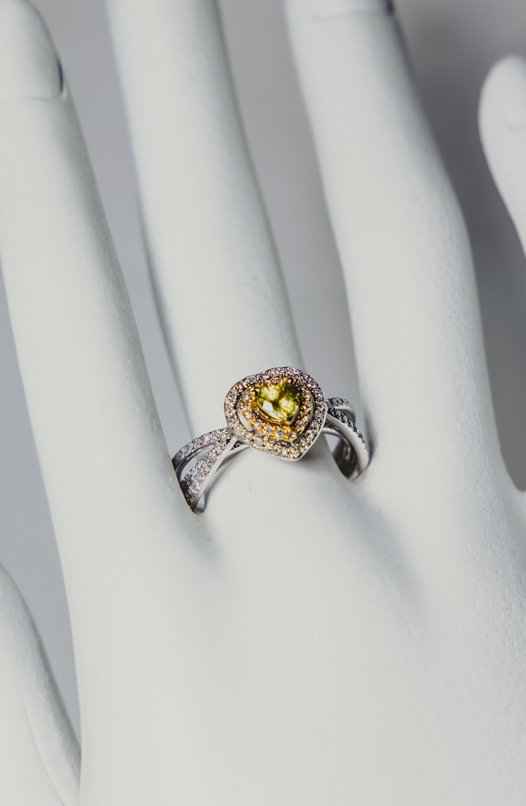 This heart-shaped ring showcases a vivid yellow sapphire held securely among an array of diamonds in a heart shaped setting and interlocking white diamond bands. Set in 14K white gold, it makes a stunning addition to any jewelry collection.