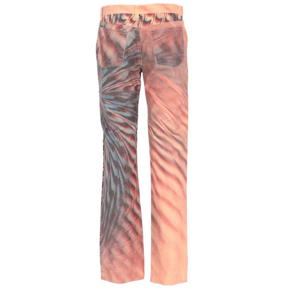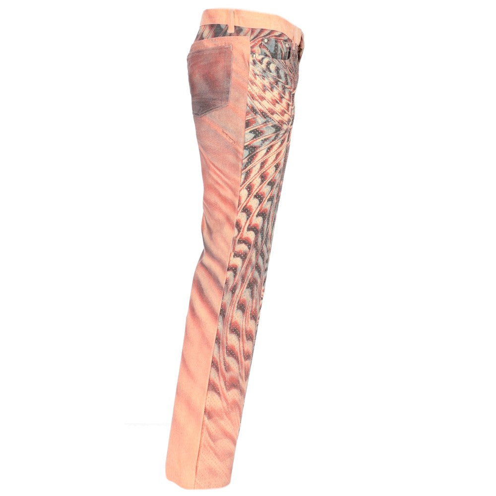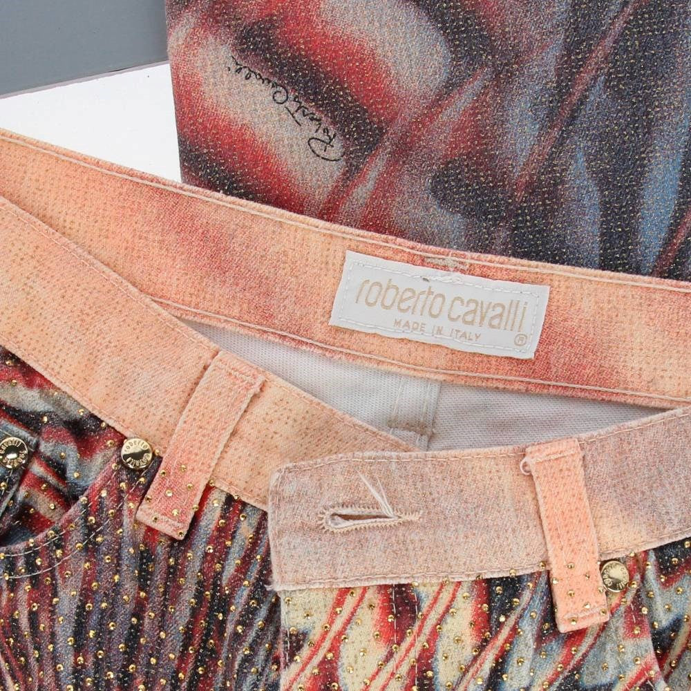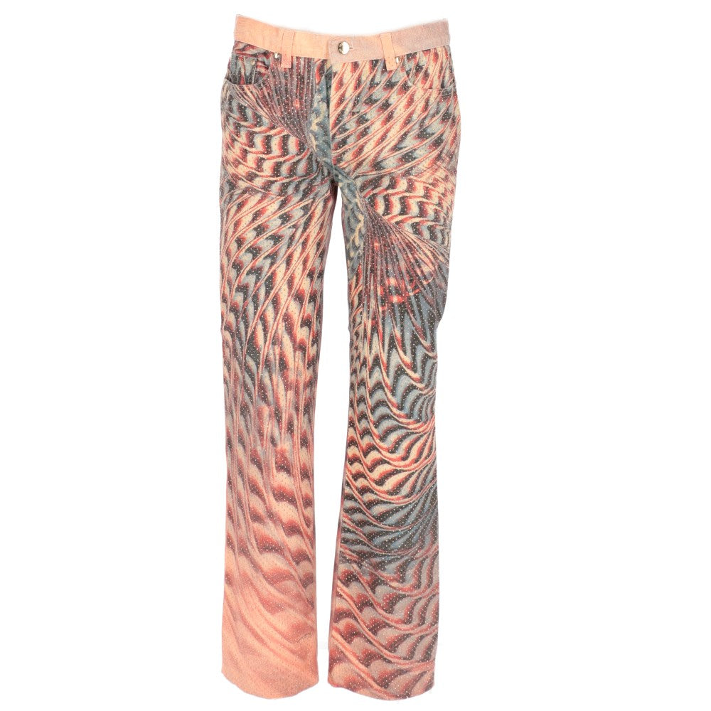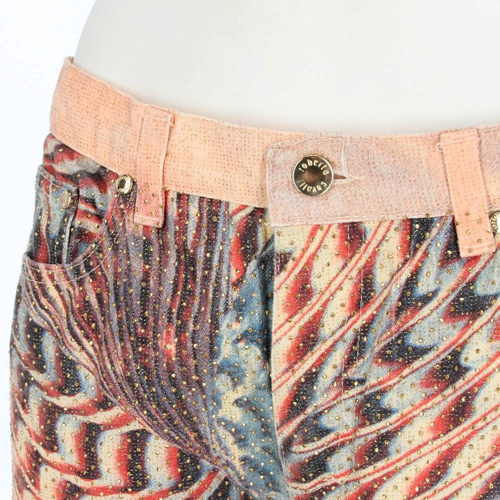 Roberto Cavalli 2000s cotton five-pocket stretch trousers with abstract print in shades of pink and lilac embellished all-over with frontal micro gold applications. Belt loops. Front logoed button and concealed zip fastening.