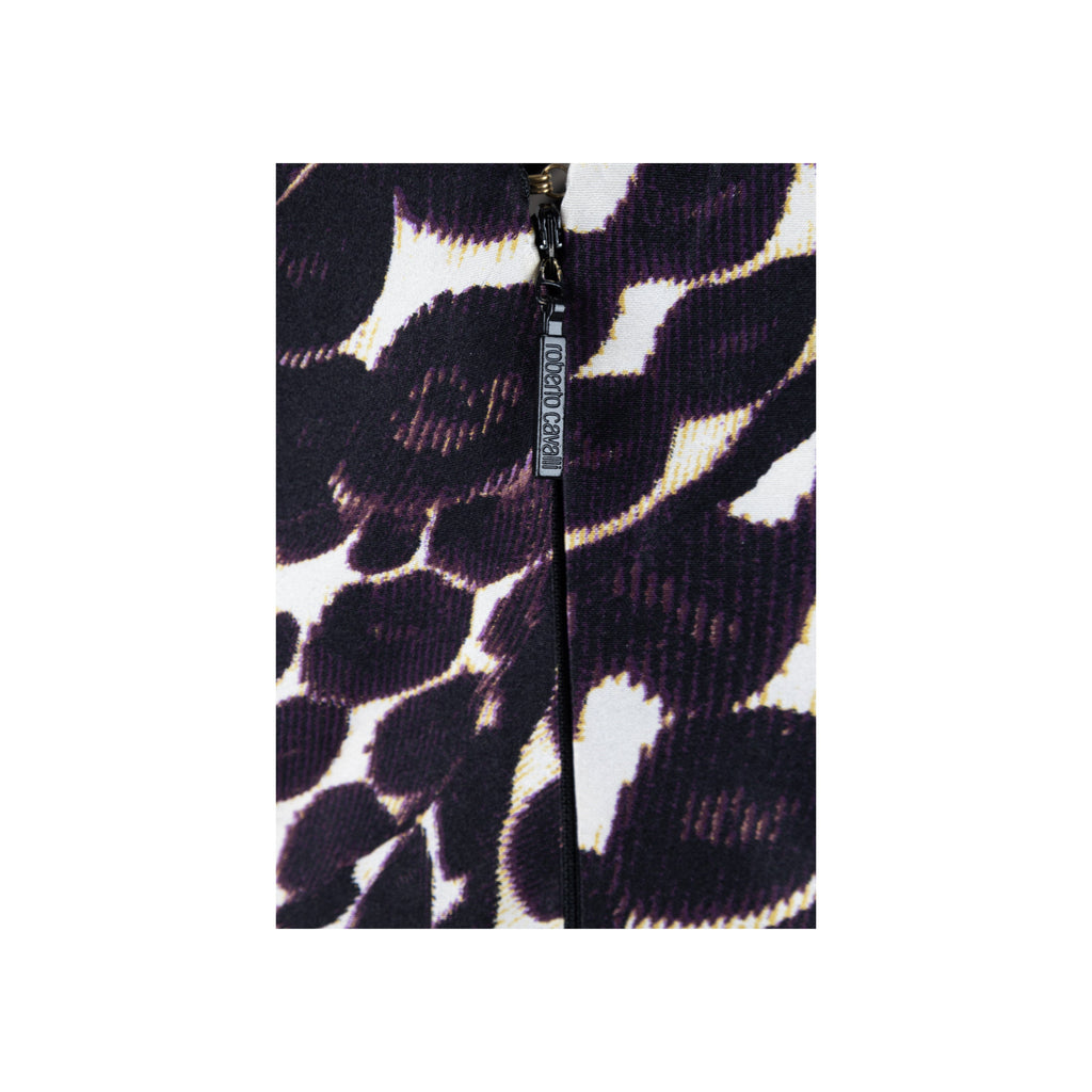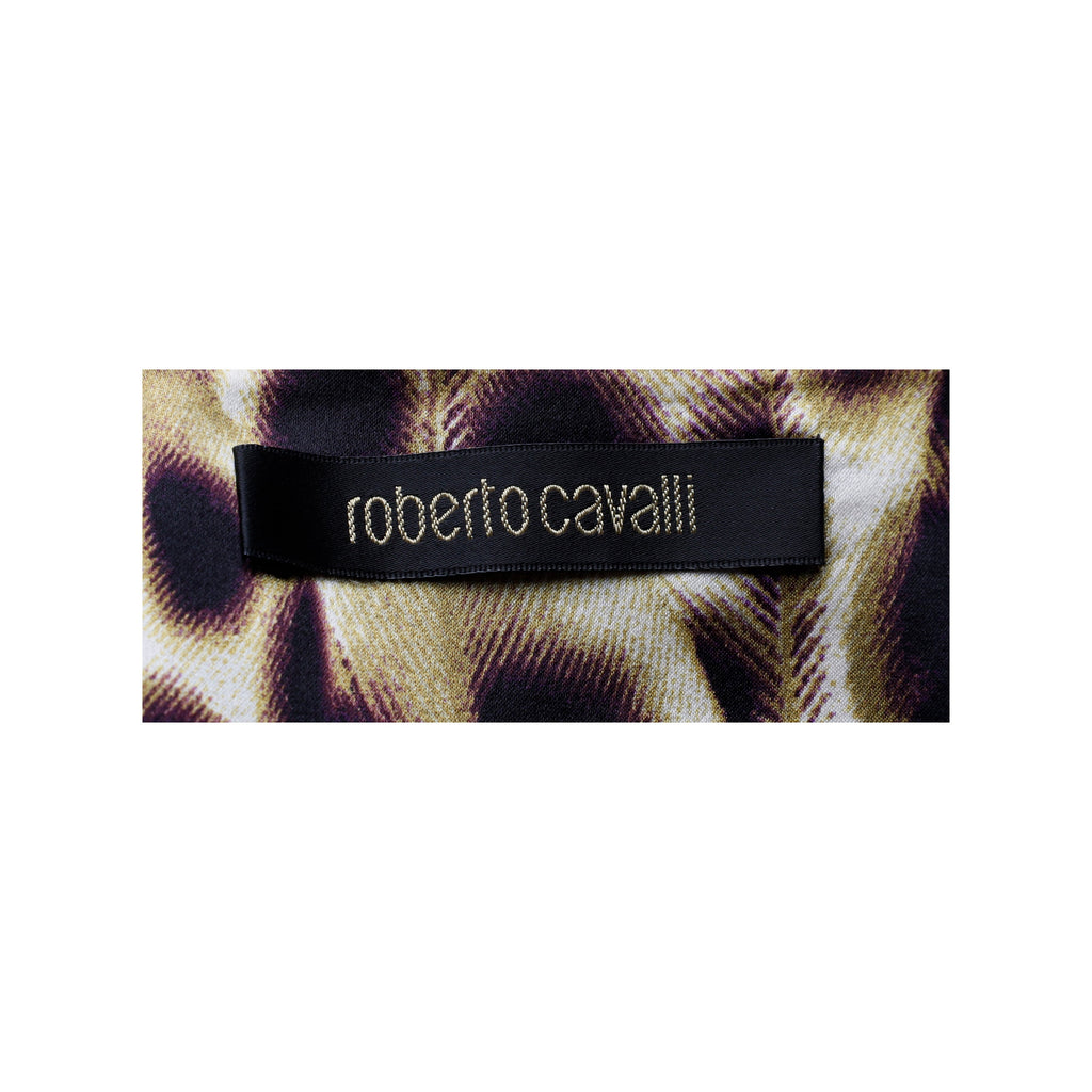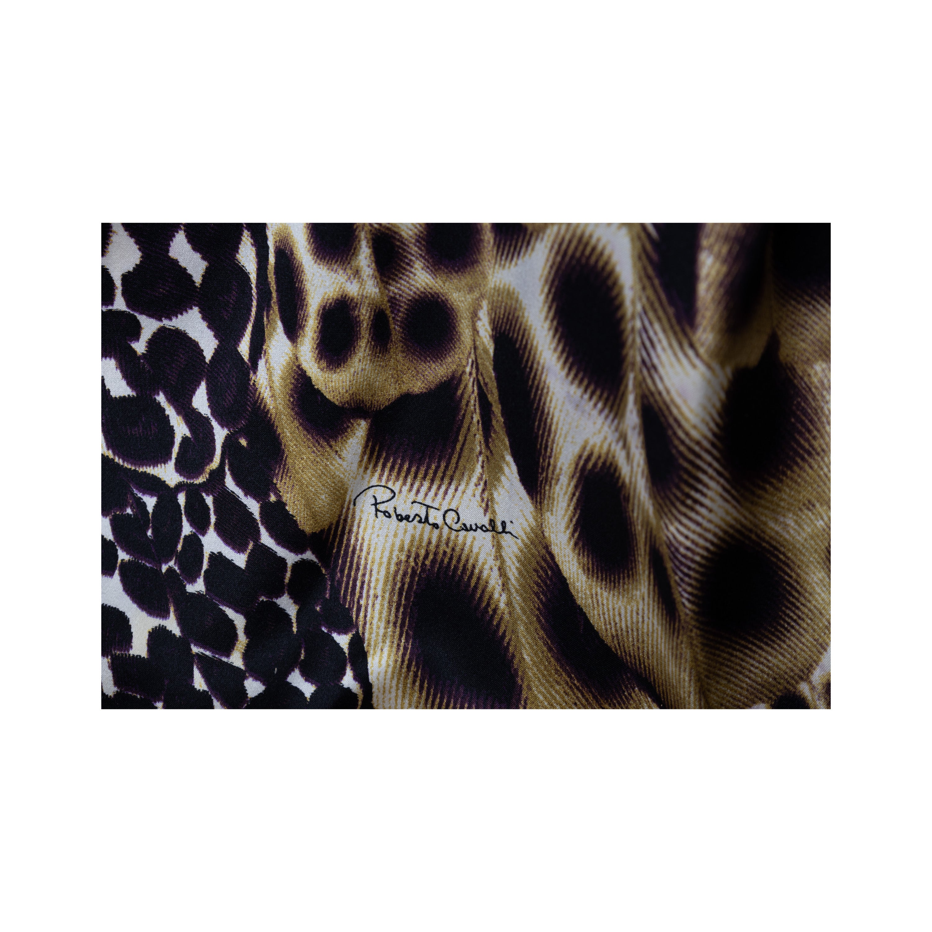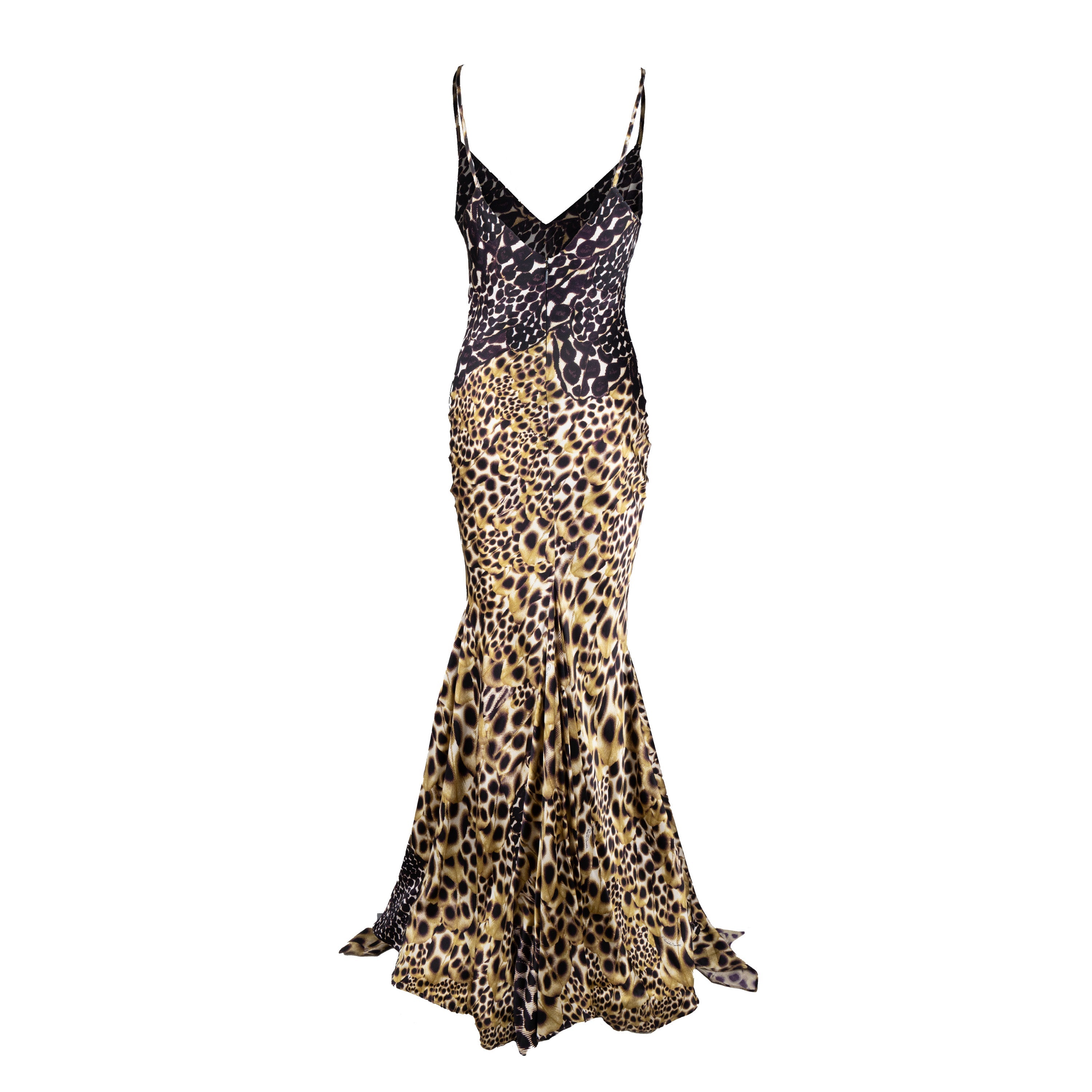 This vintage dress, designed by Roberto Cavalli, features a signature animalier print with feather accent. It features a flattering deep V-neck with thin straps and a fitted silhouette that flares slightly to an asymmetric hem. The back is finished with a deep cut and zipper closure.