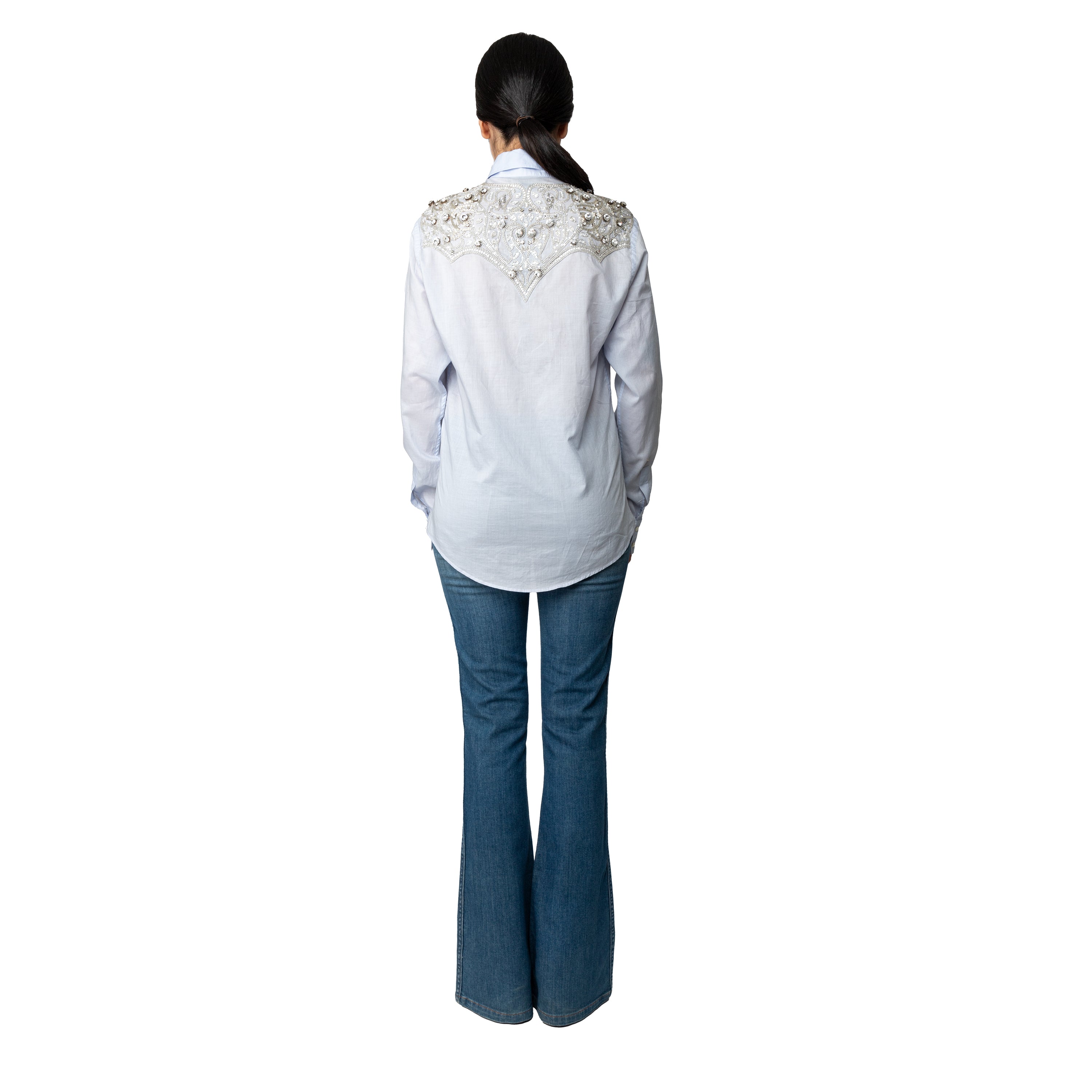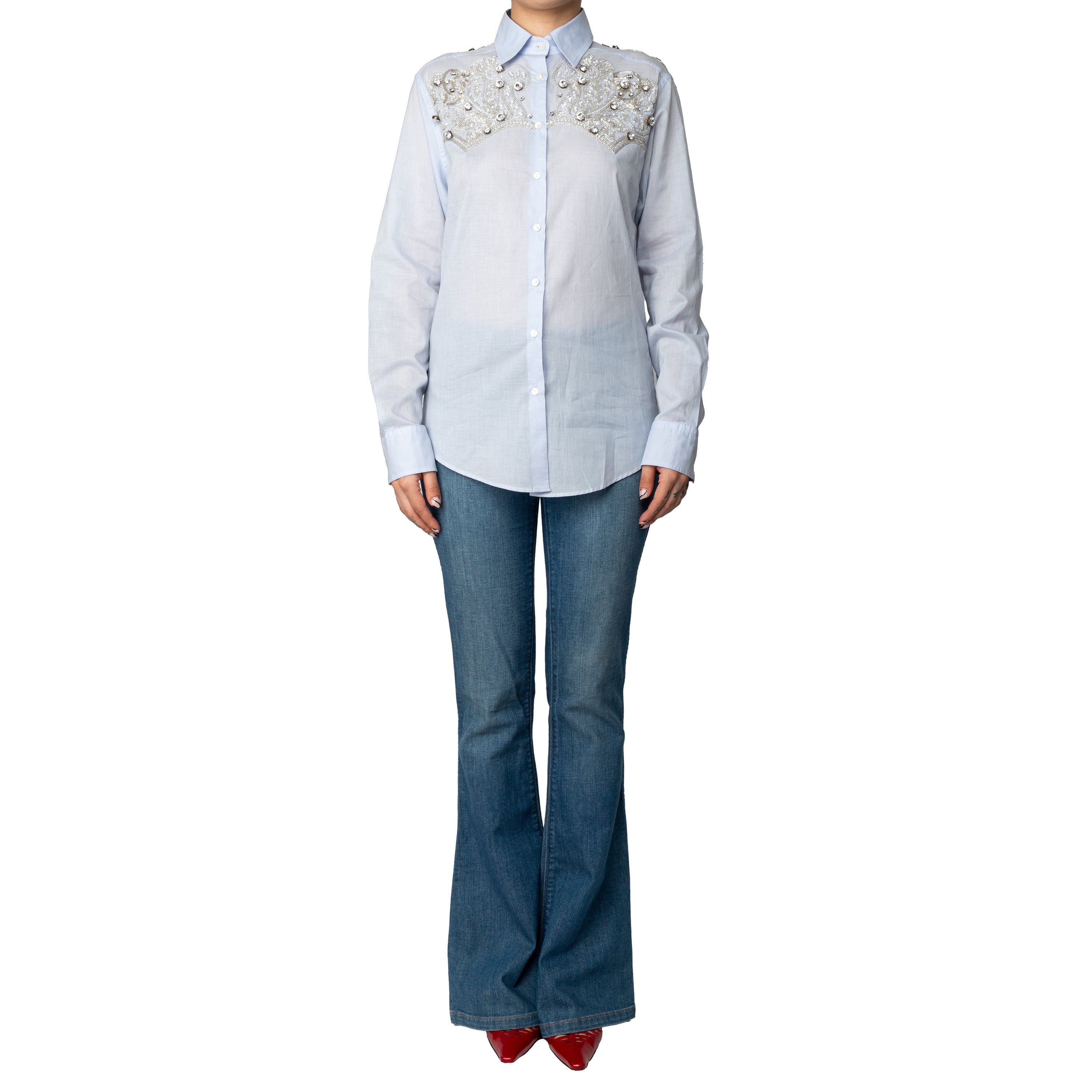 Elevate your shirt game with the Roberto Cavalli Crystal Embellished Shirt. Made of pure cotton in a light blue color, this classic button down features the brand's signature design with crystal embellishments. Complete with logo-engraved mother of pearl buttons, it's the perfect blend of luxurious and chic.