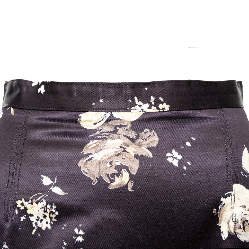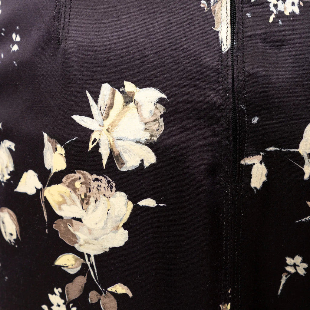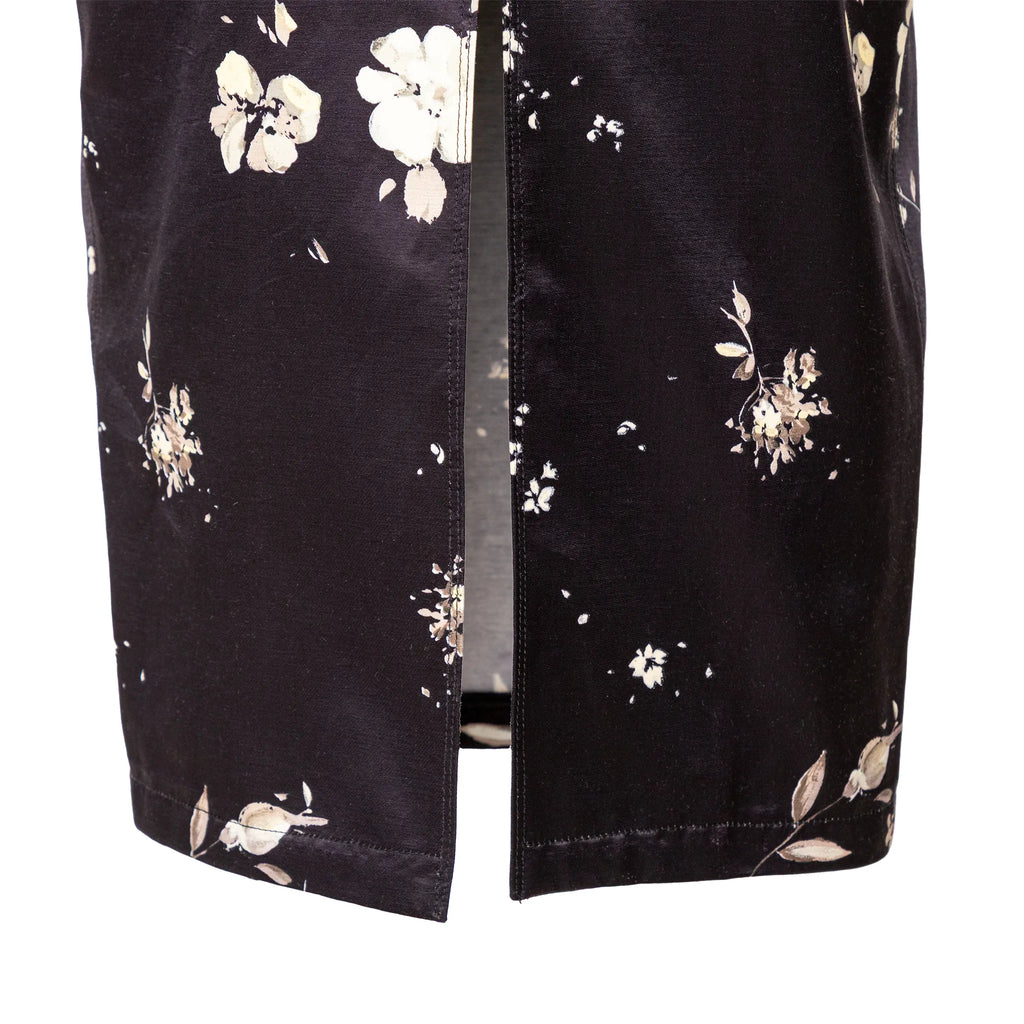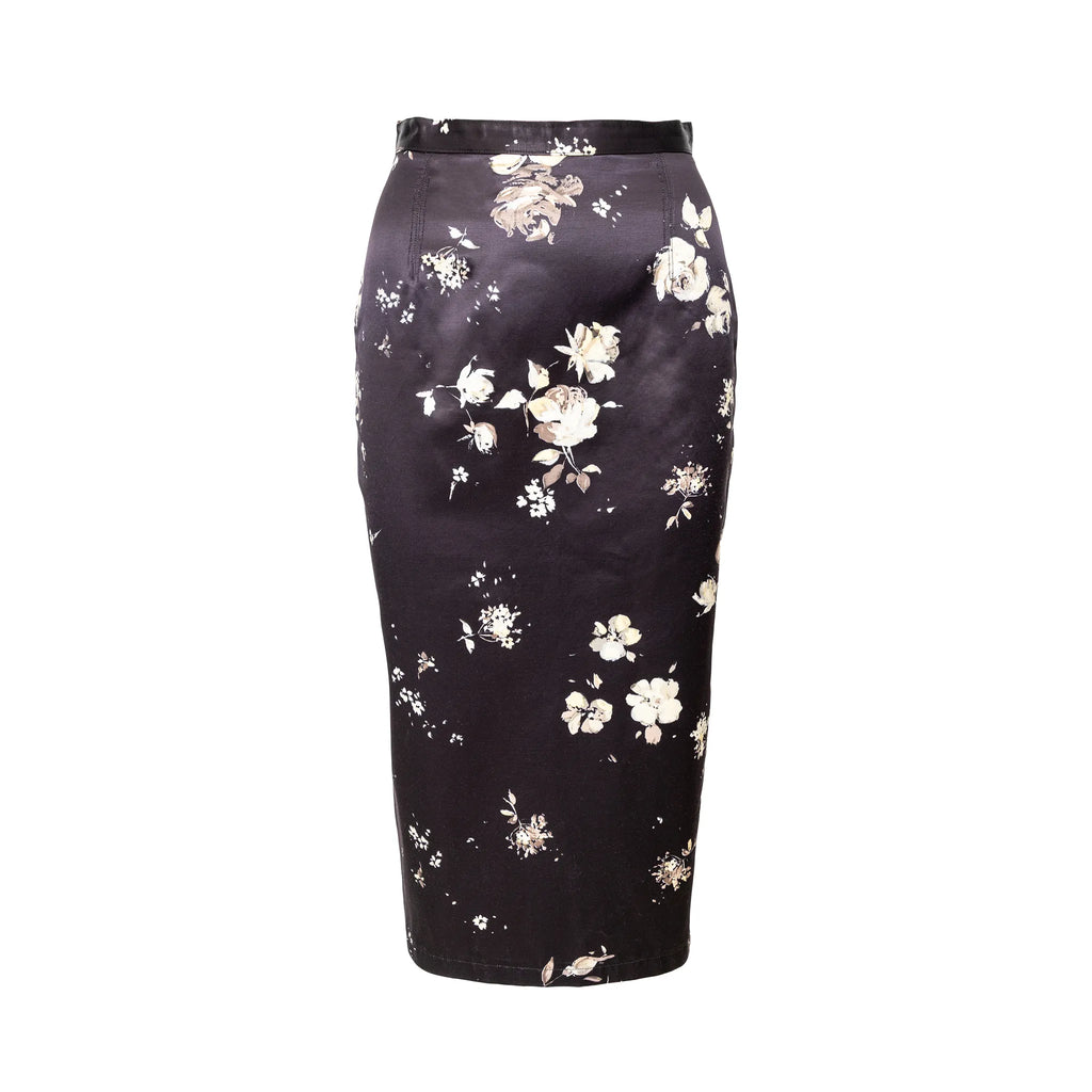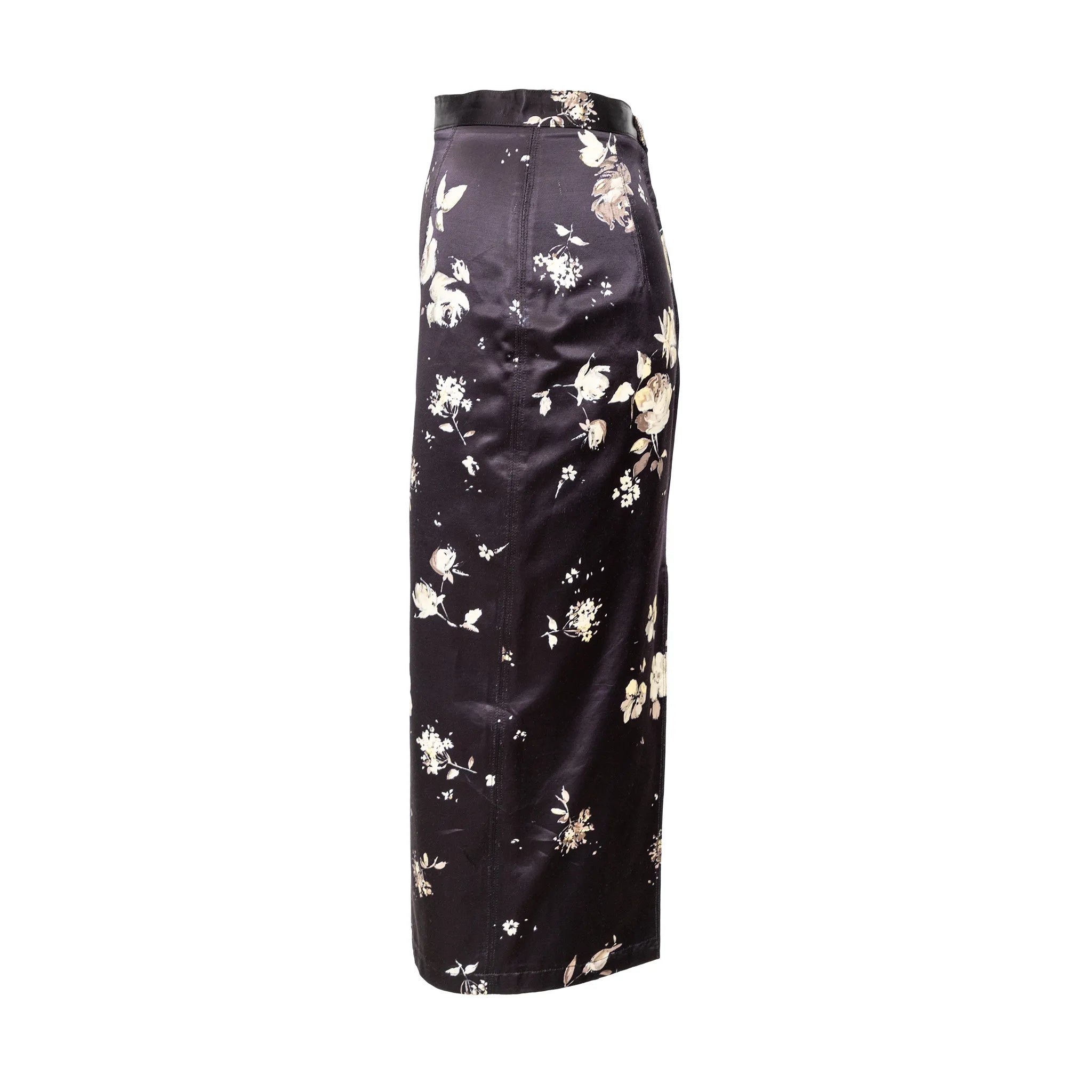 Bring back the floral glamour with the Roberto Cavalli black flower-printed skirt from the archive sample collection of the brand. The midi length skirt features a fitted silhouette with a slit on the back.