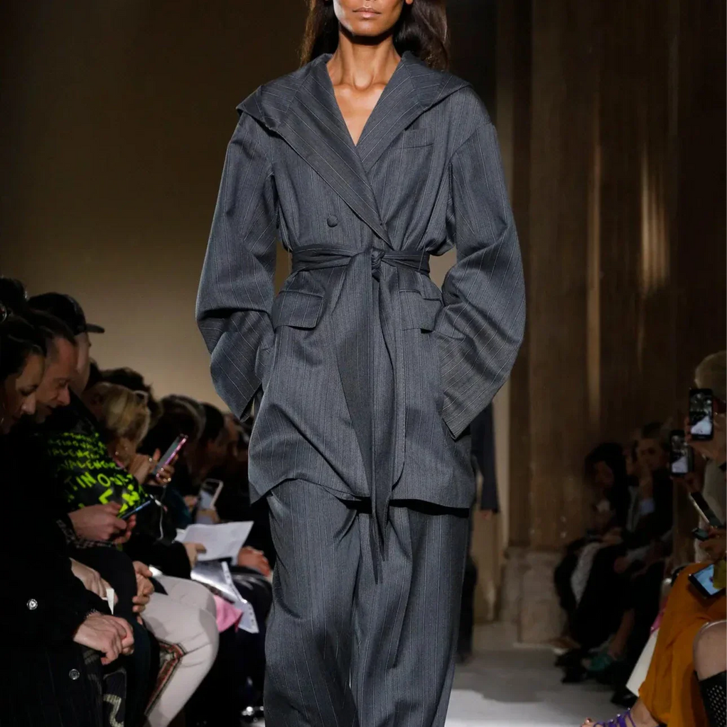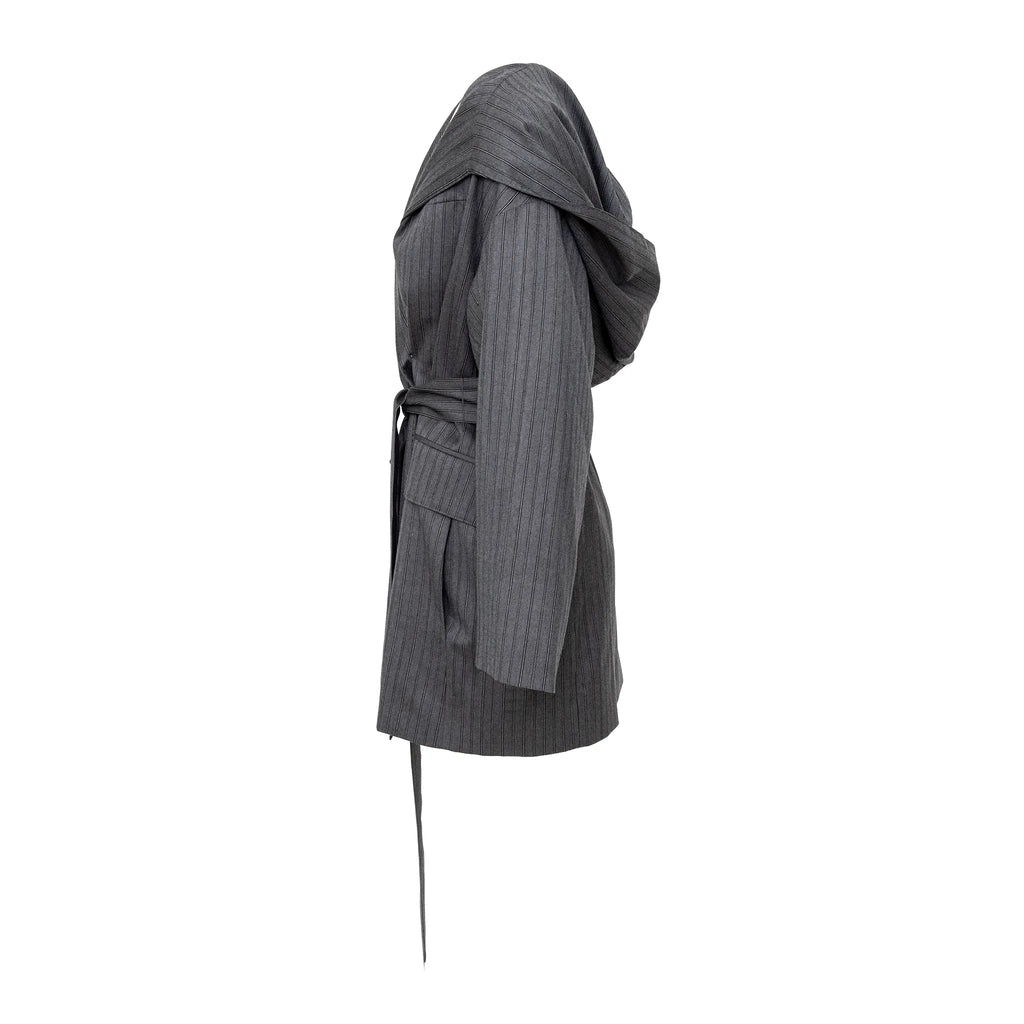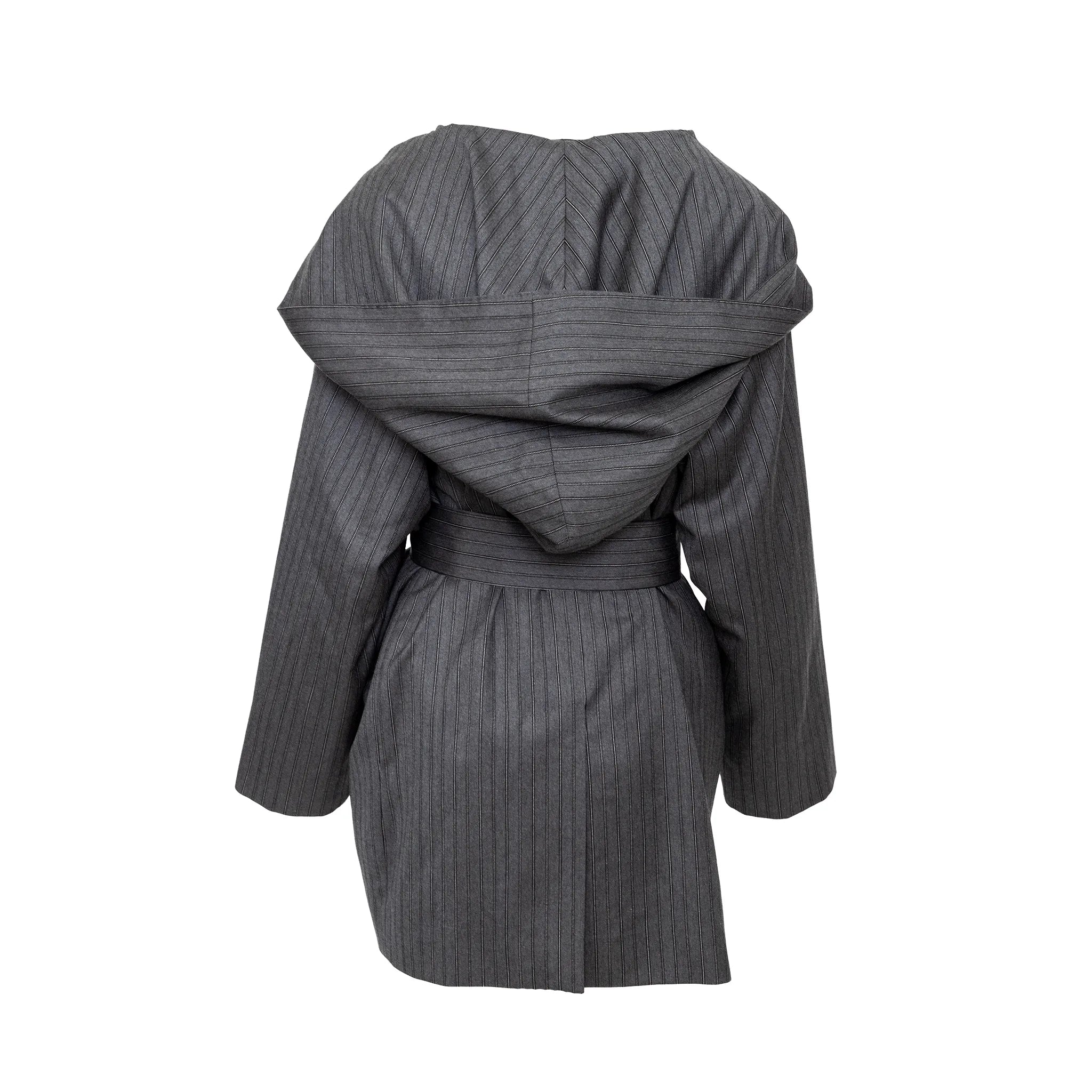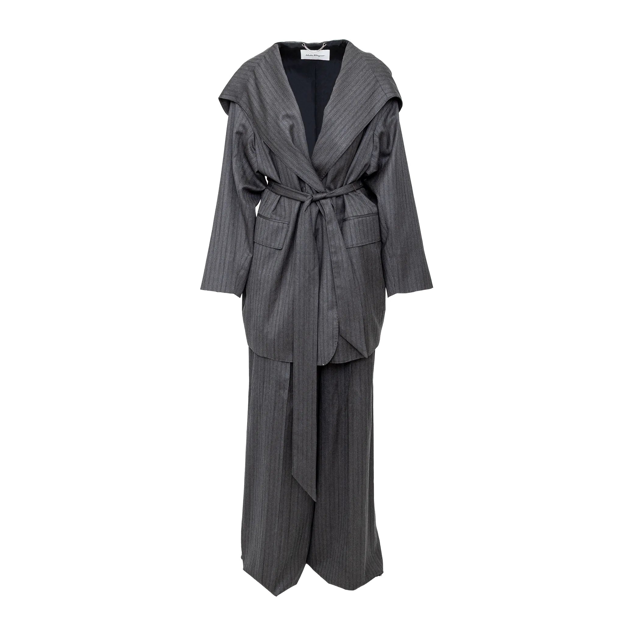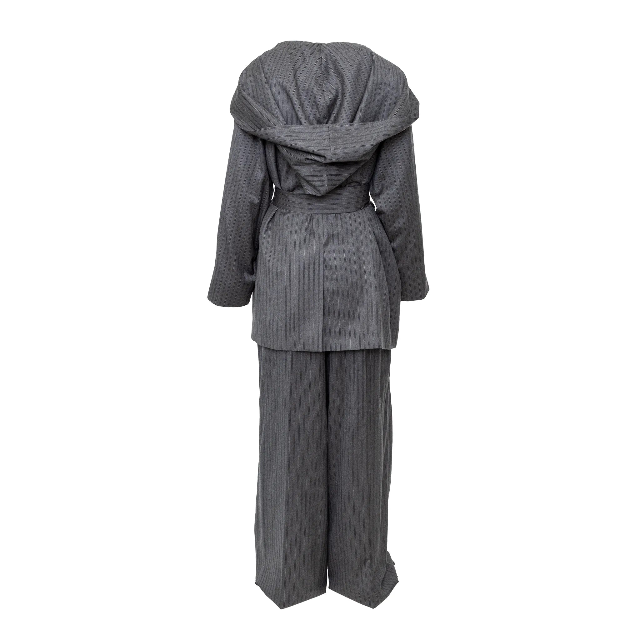 Pinstripe suit in grey virgin wool from Fall 2019 runway. Features a belted hooded jacket and pleated high-waisted wide-leg pants for a bold, refined silhouette.
