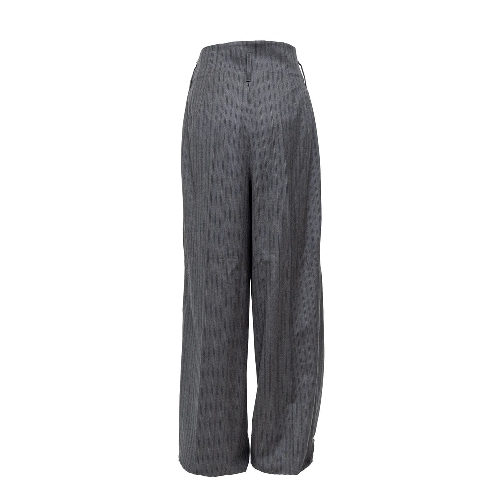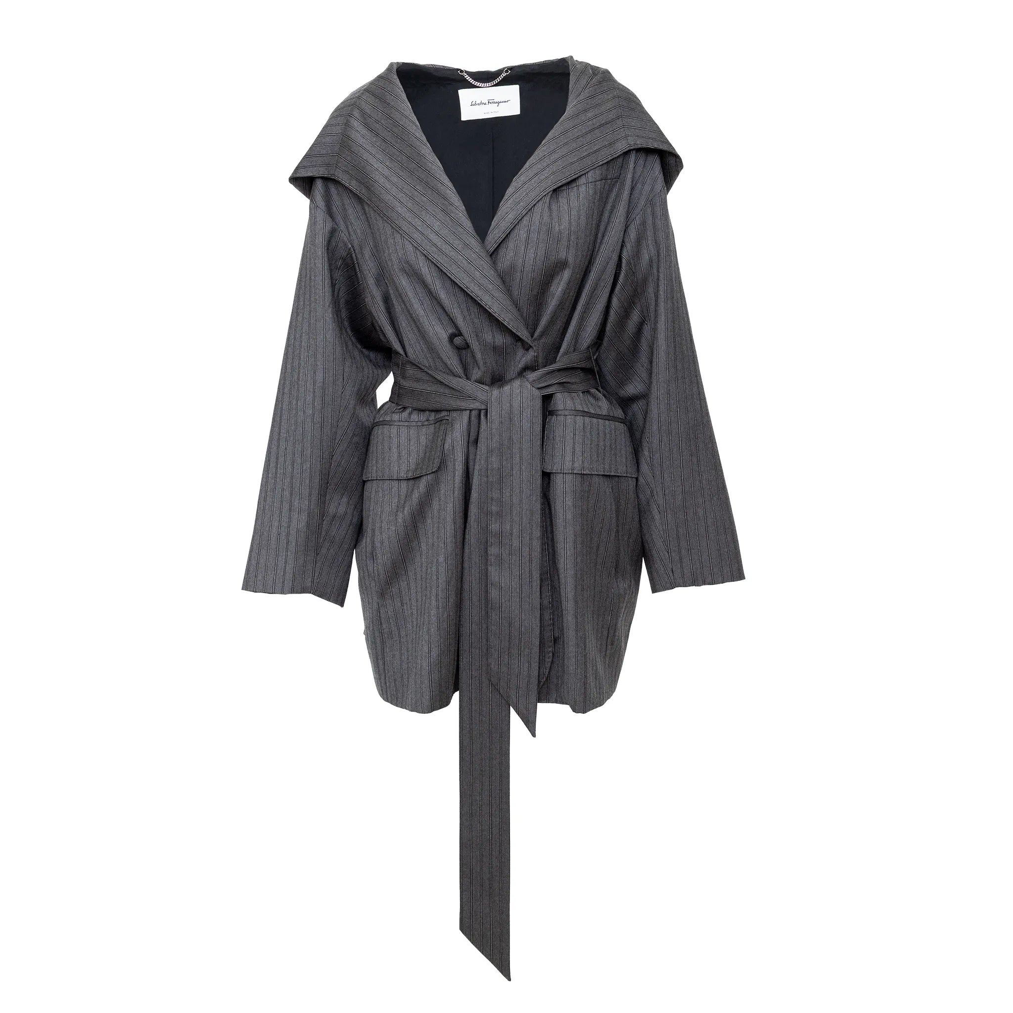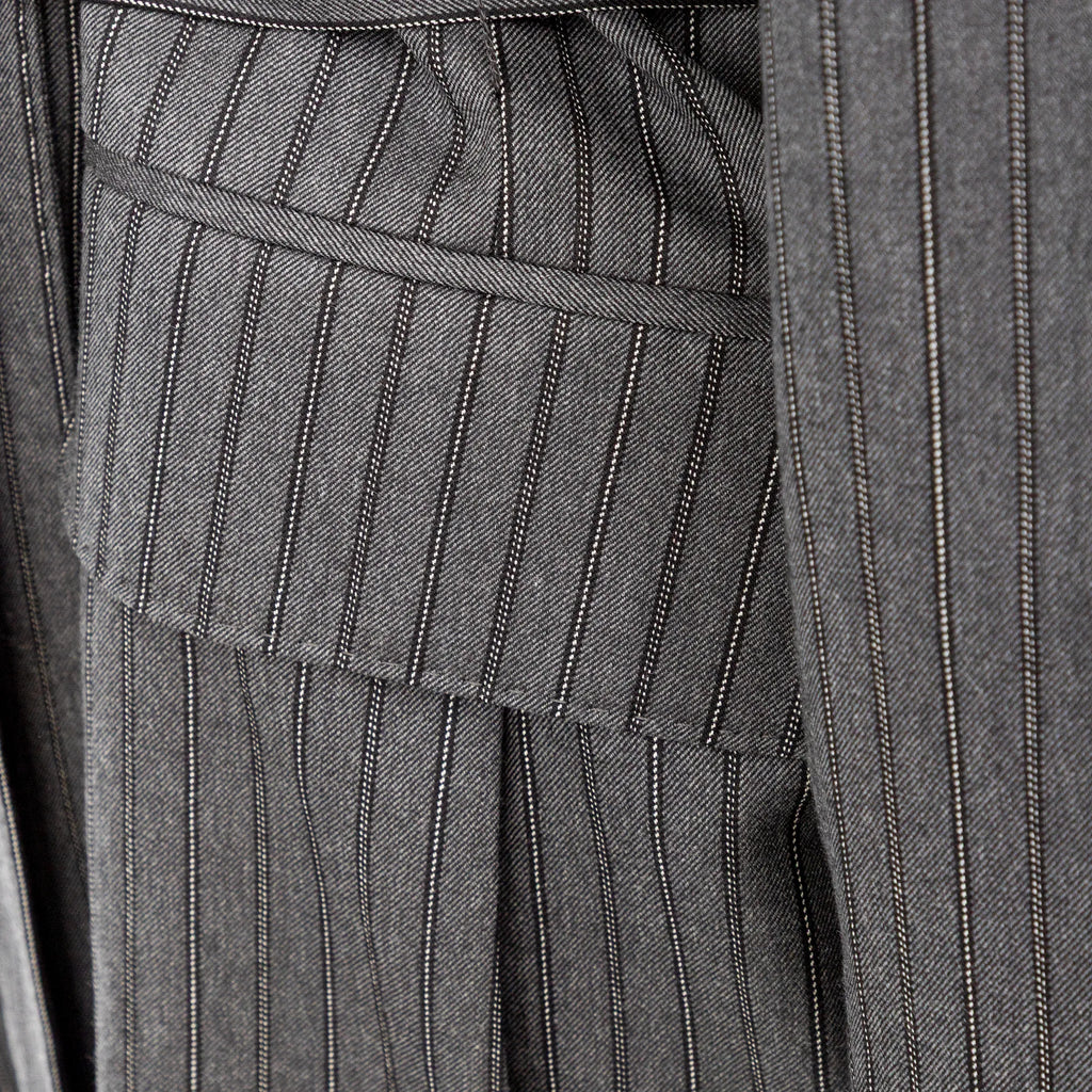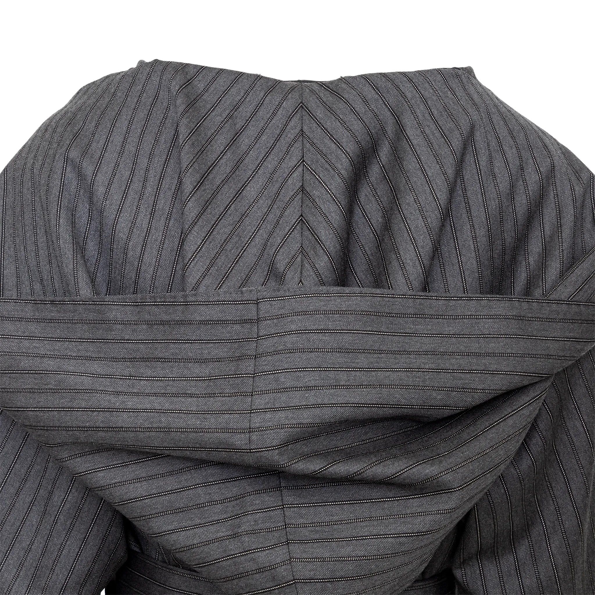 Pinstripe suit in grey virgin wool from Fall 2019 runway. Features a belted hooded jacket and pleated high-waisted wide-leg pants for a bold, refined silhouette.