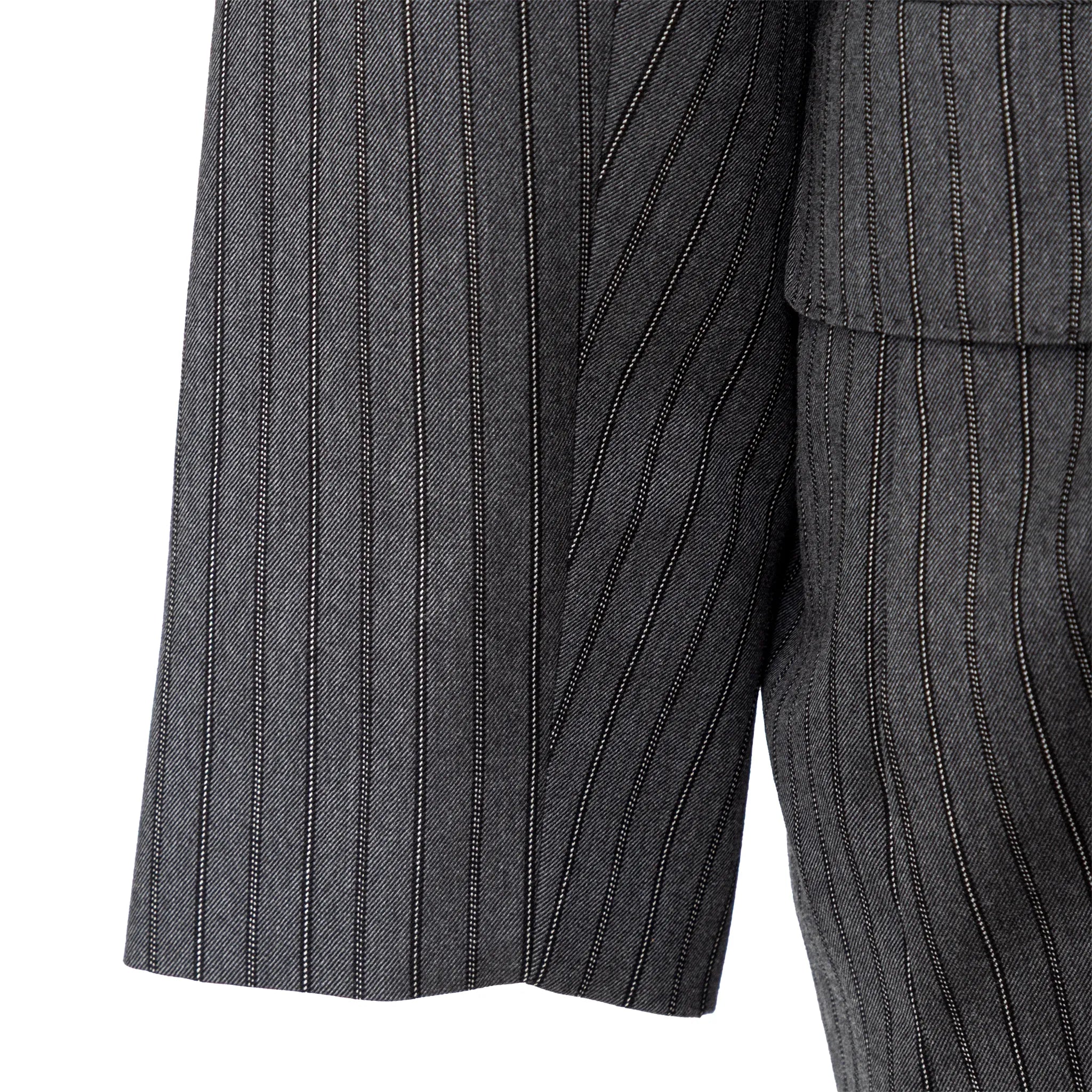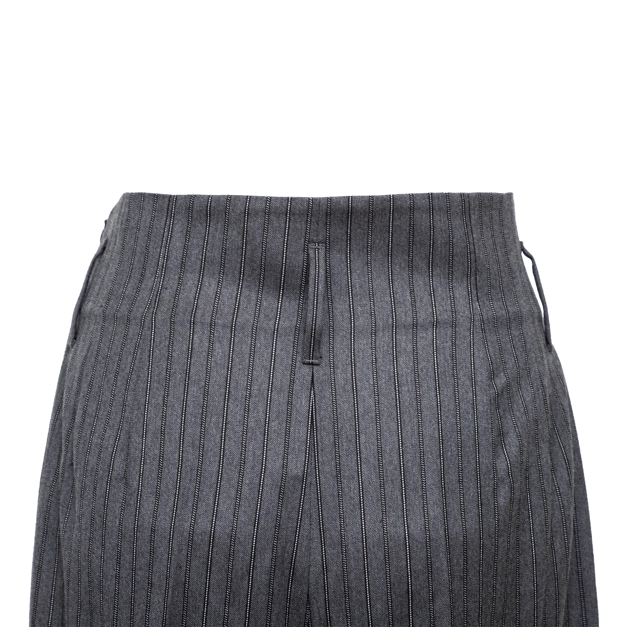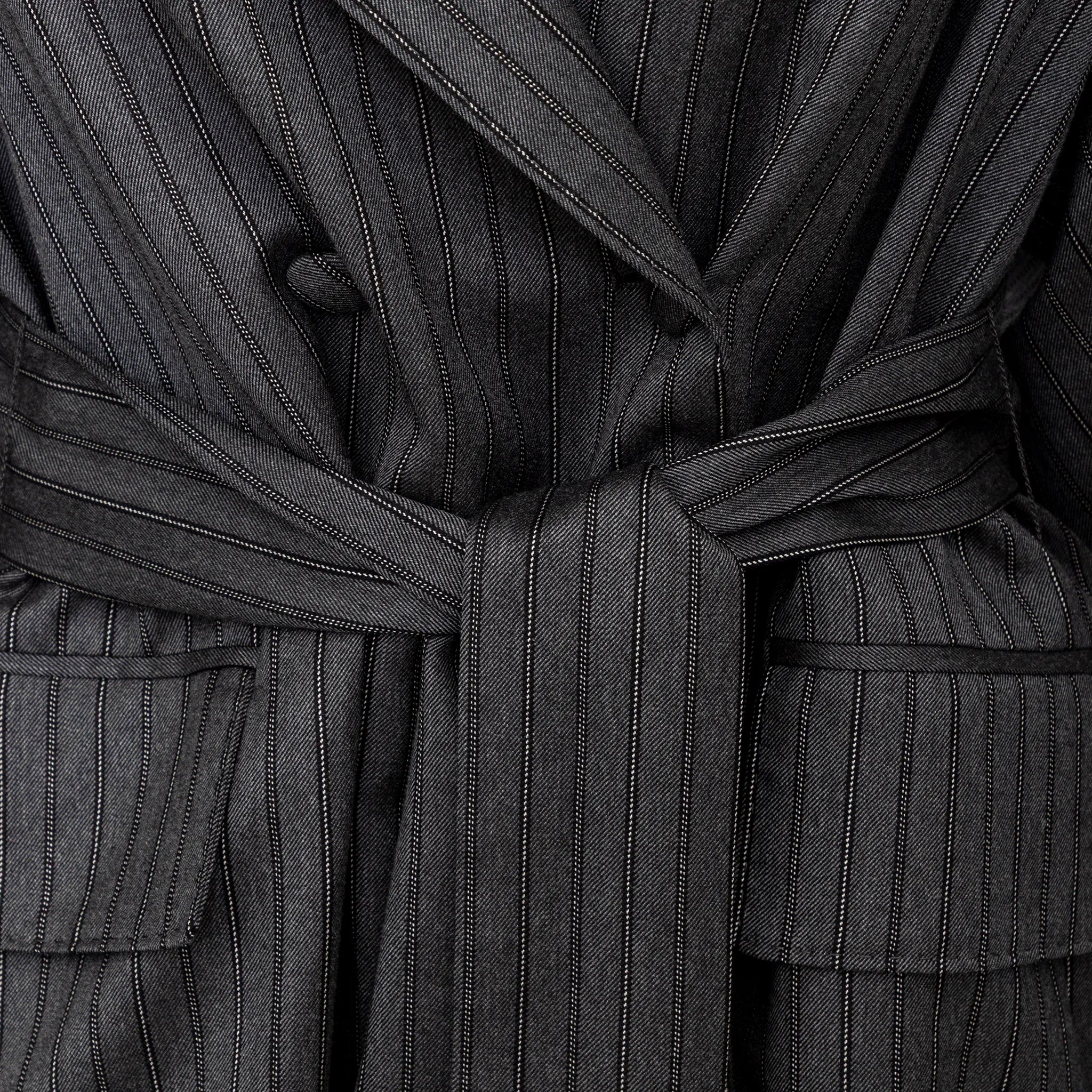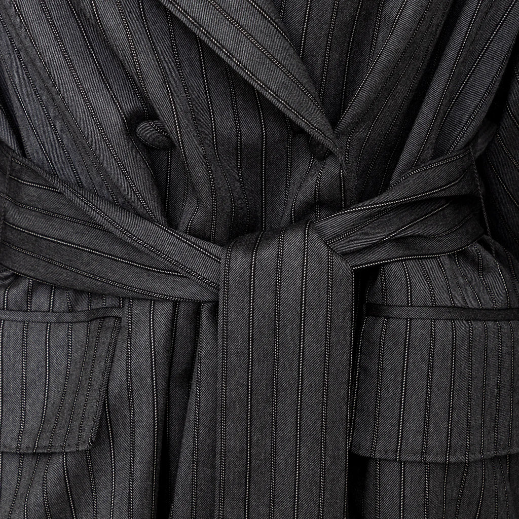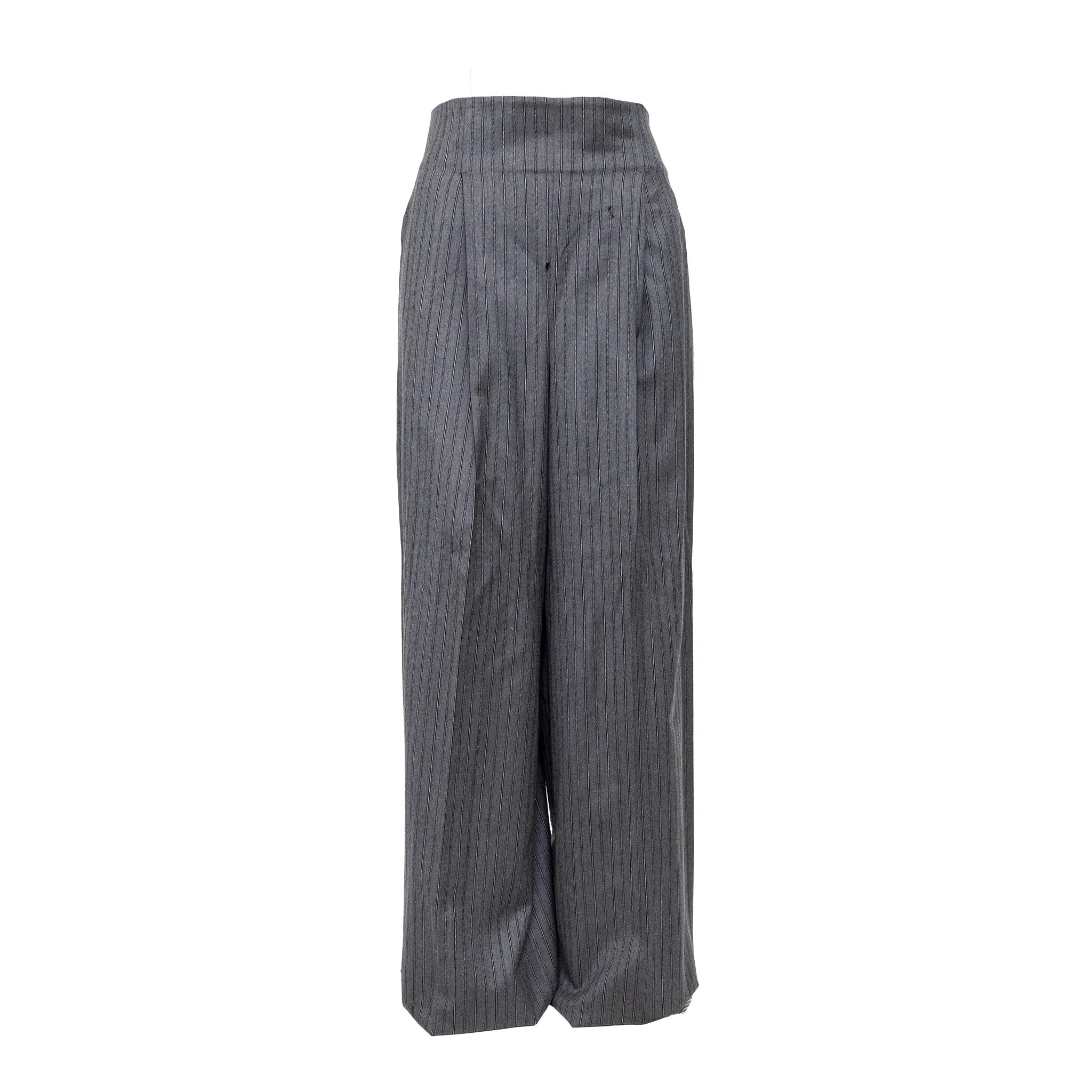 Pinstripe suit in grey virgin wool from Fall 2019 runway. Features a belted hooded jacket and pleated high-waisted wide-leg pants for a bold, refined silhouette.