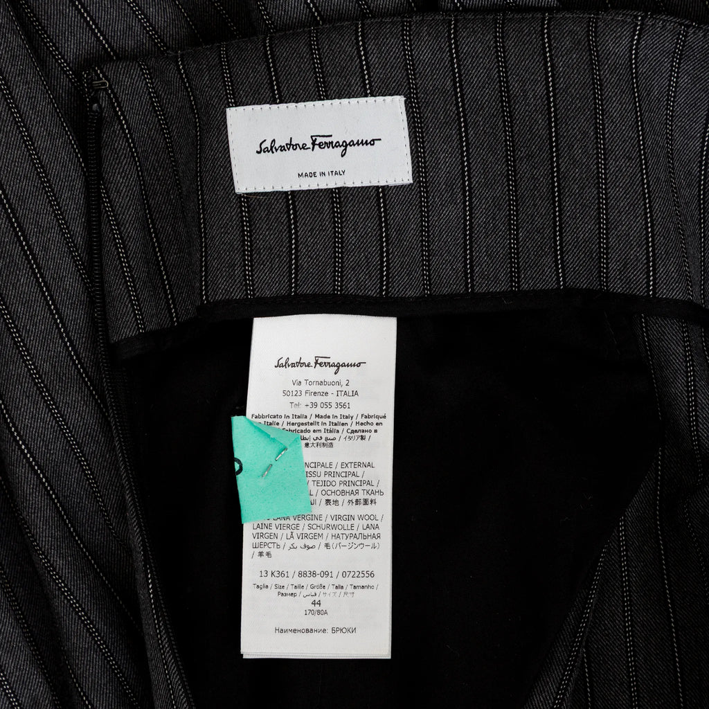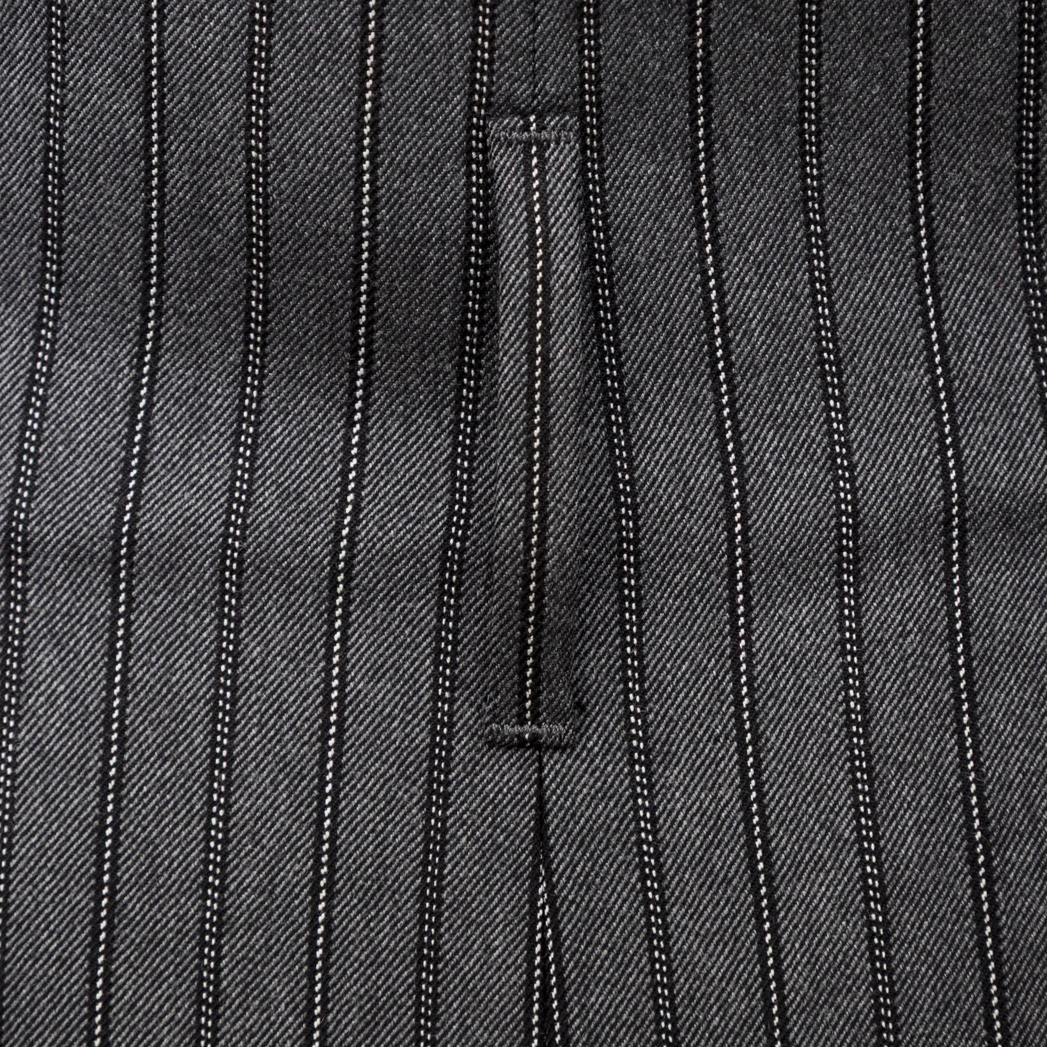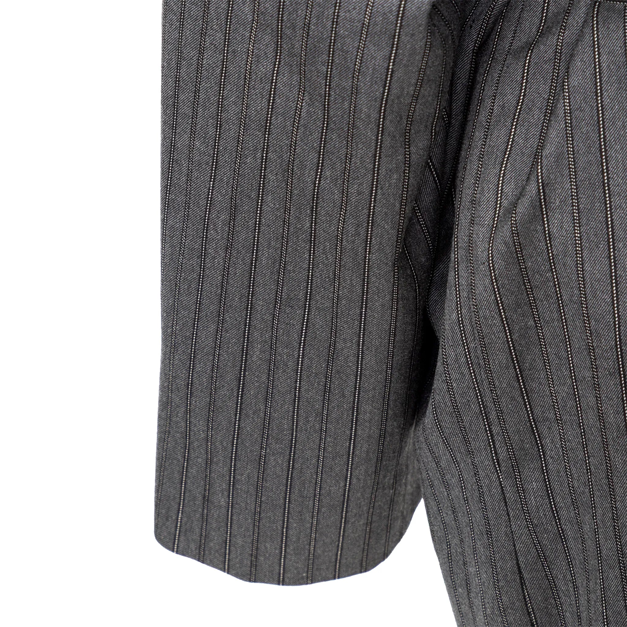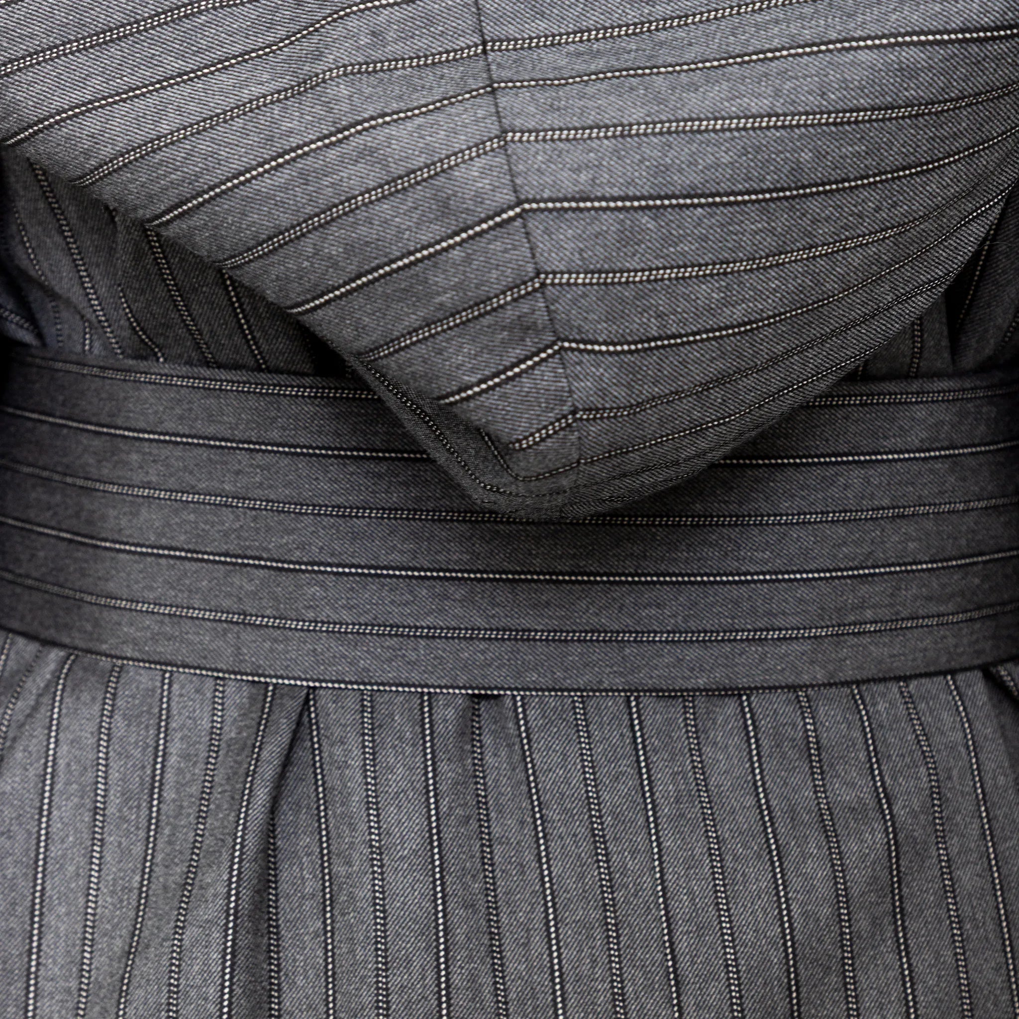 Pinstripe suit in grey virgin wool from Fall 2019 runway. Features a belted hooded jacket and pleated high-waisted wide-leg pants for a bold, refined silhouette.