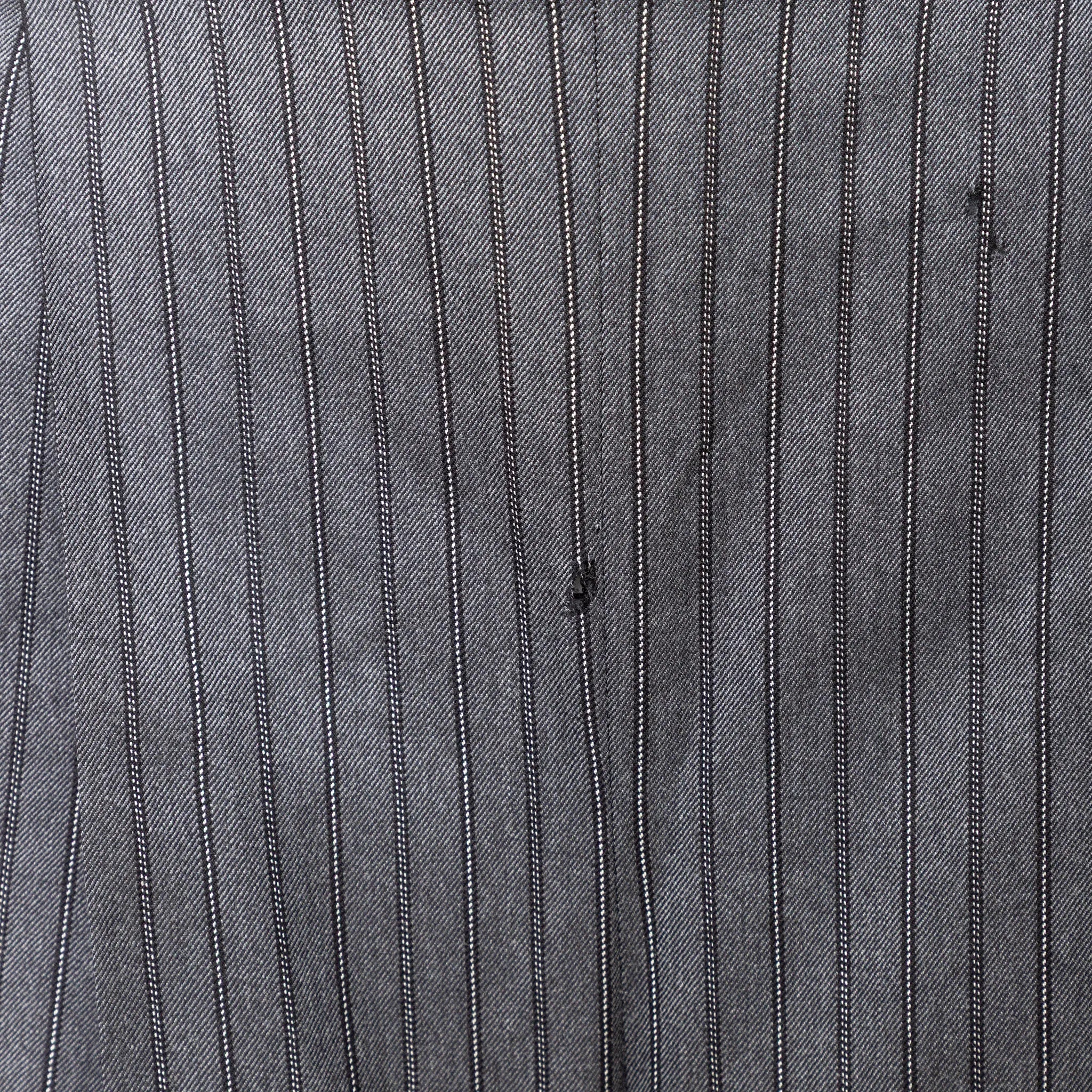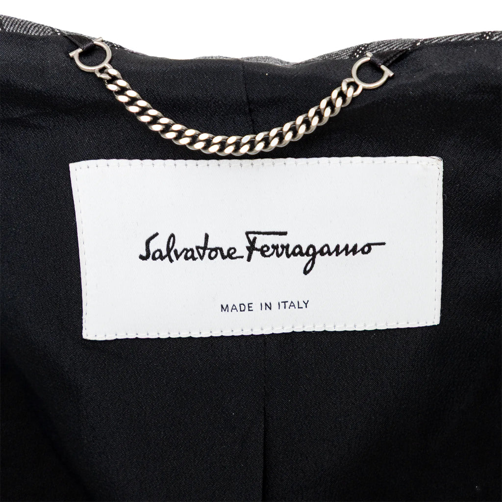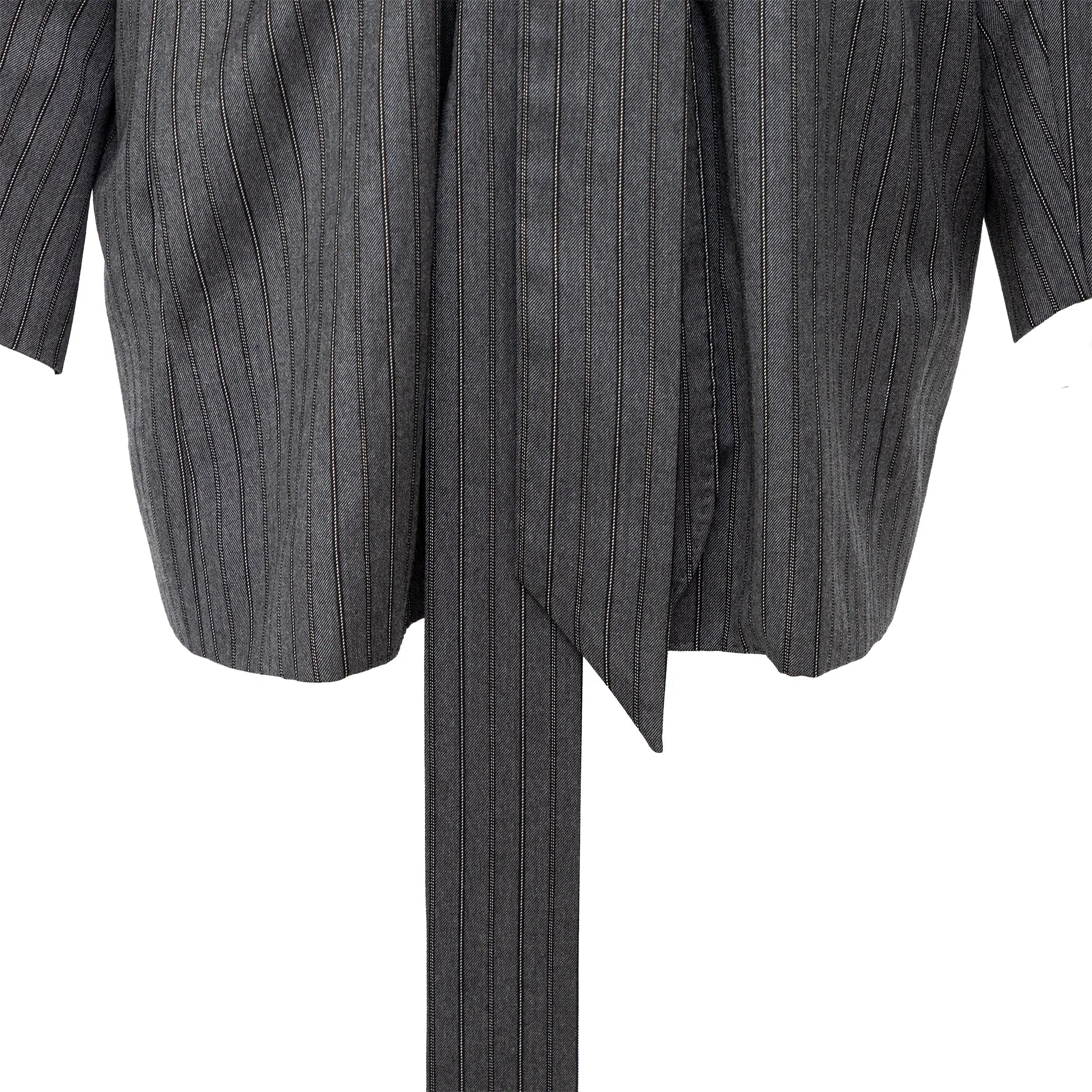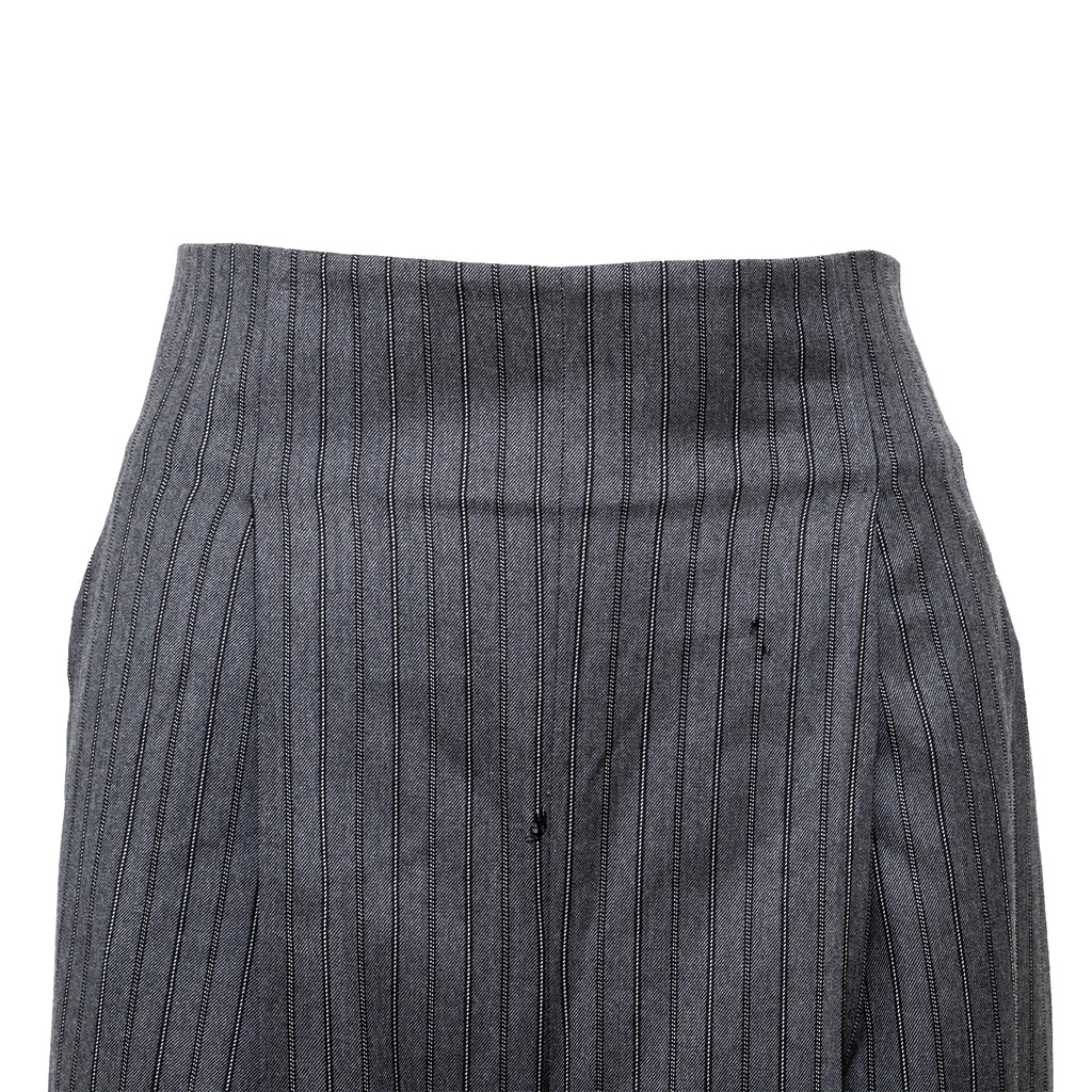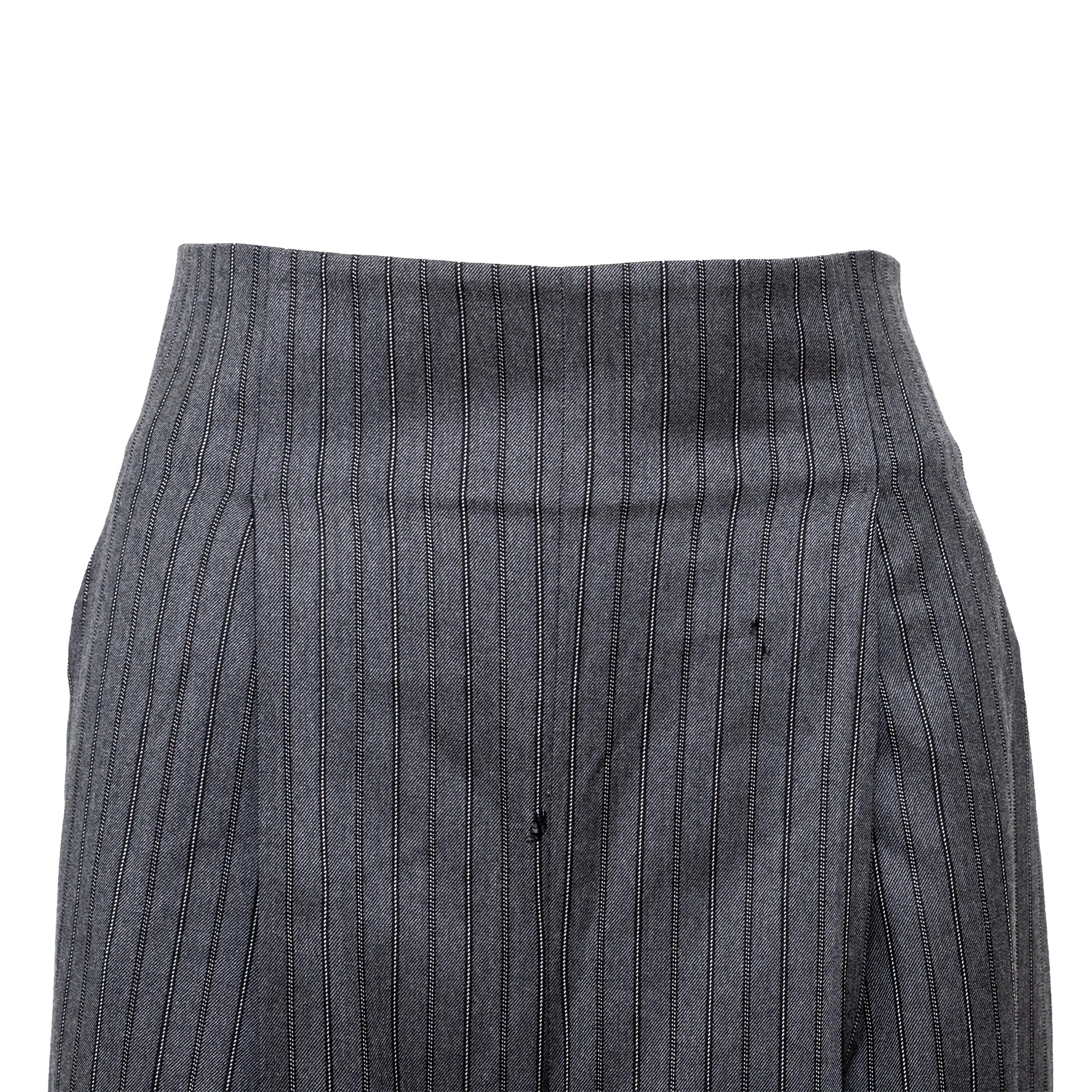 Pinstripe suit in grey virgin wool from Fall 2019 runway. Features a belted hooded jacket and pleated high-waisted wide-leg pants for a bold, refined silhouette.