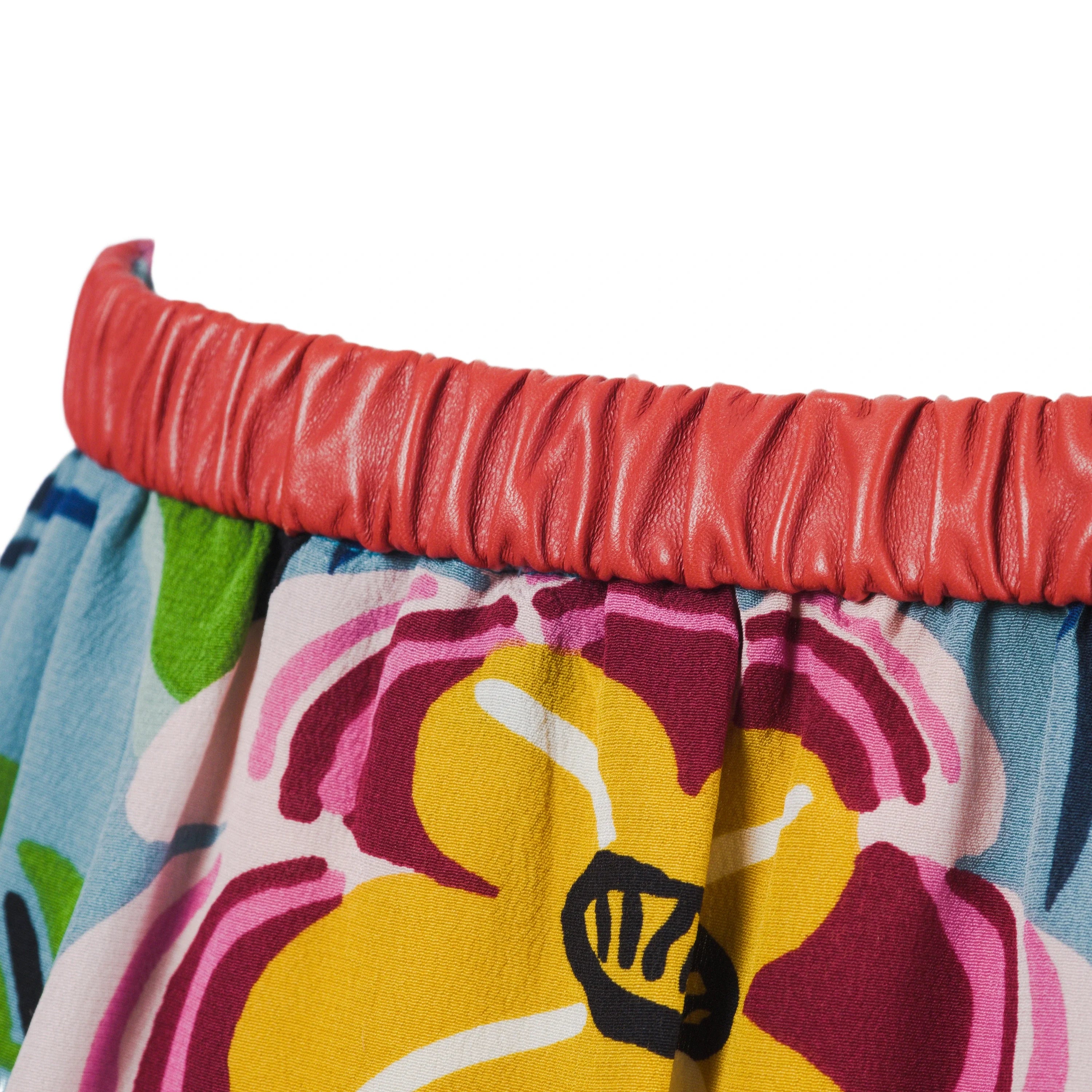 The silhouette is soft and feminine, finished with a delicate ruffled hem that enhances movement. A red leather elastic waistband adds contrast and structure, creating a distinctive and recognisable design detail.