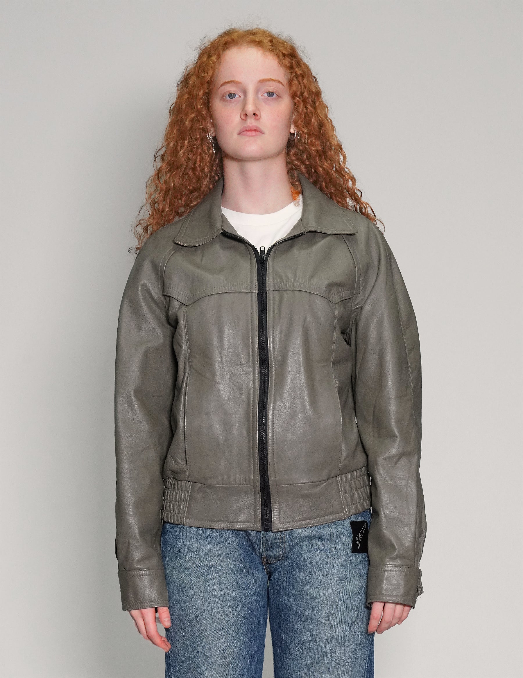 Vintage Vass Leather jacket in Light Grey. 100% Leather. Zip fastening front, inside breast pockets, slit waist pockets and button fastening cuffs. Beautifully soft leather, great for autumnal layering fits.