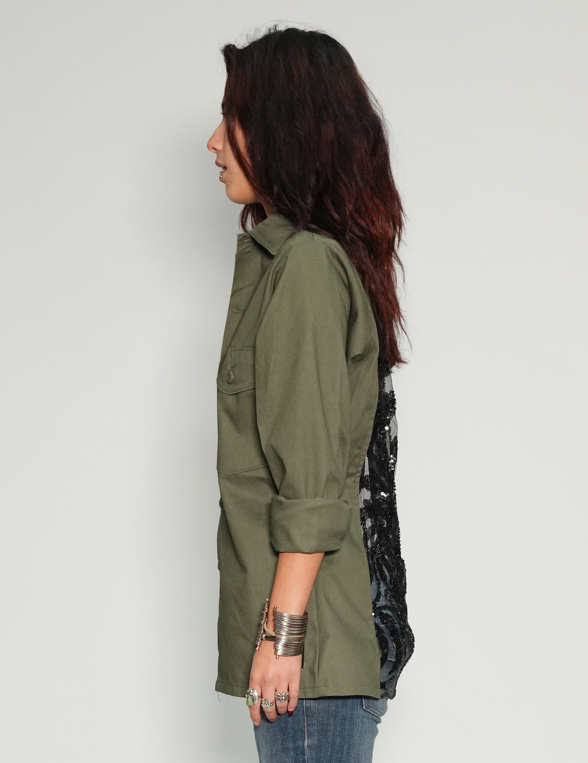 Vintage US Army khaki long sleeve shirt customised with black sequin, art-deco style sheer back panel. Features two button-fastened breast pockets, and ST logo branded patch. Model is 5'8" wearing size M.