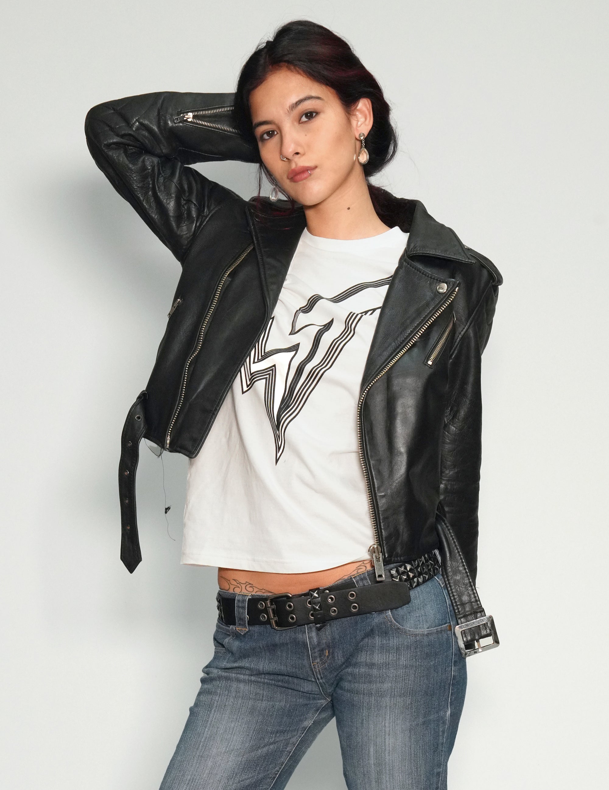 Iconic vintage leather biker jacket, made famous by Marlon Brando in the film "The Wild One" . Featuring pop-adjustable collars, zip front, diagonal zip breast pocket, inside breast pocket, dual zip waist pockets and adjustable belt on the waist.