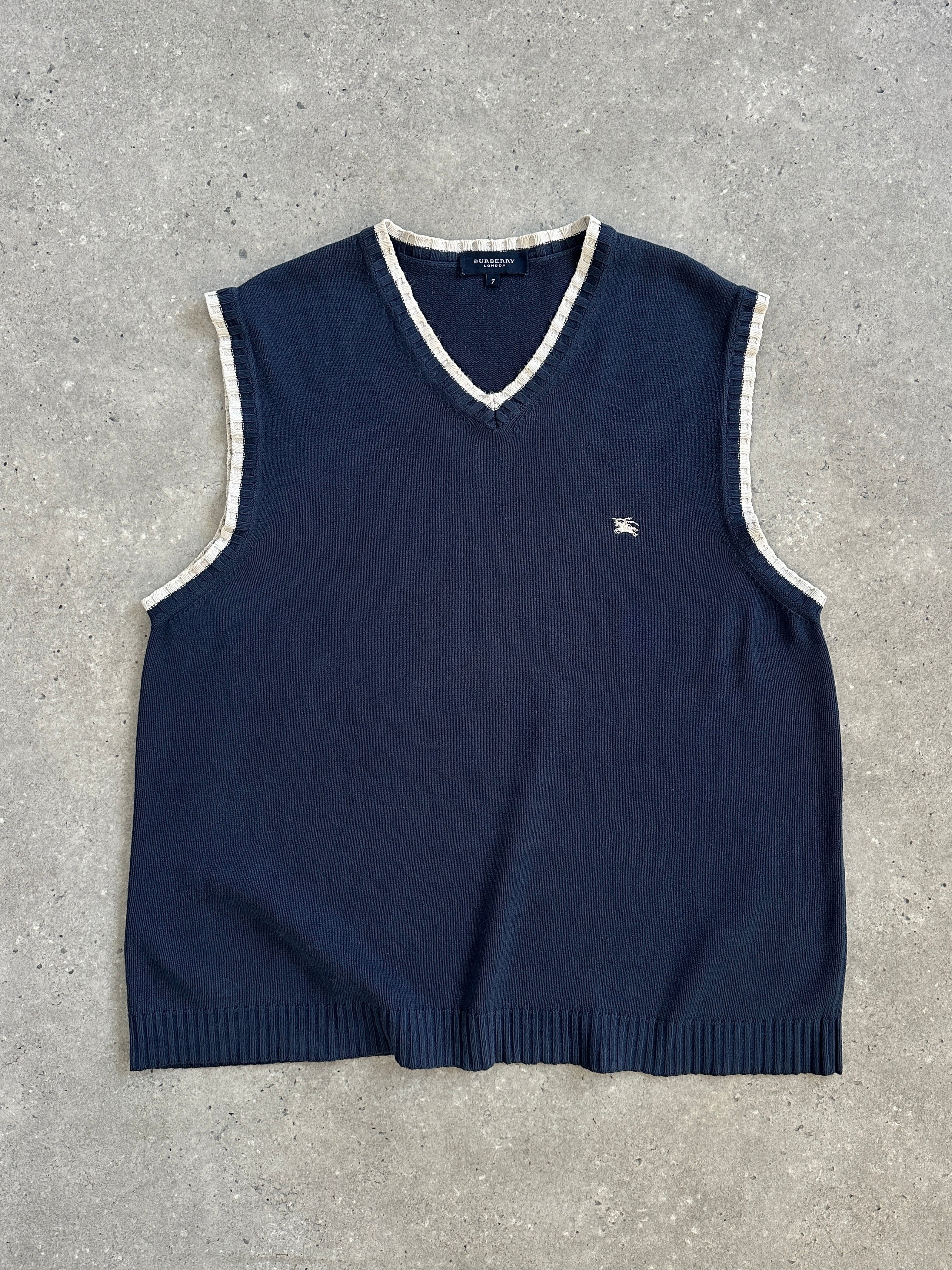 Burberry 1990s lightweight blue knitted vest with a soft handle, featuring contrast white ribbed trim and subtle Equestrian Knight logo embroidery.