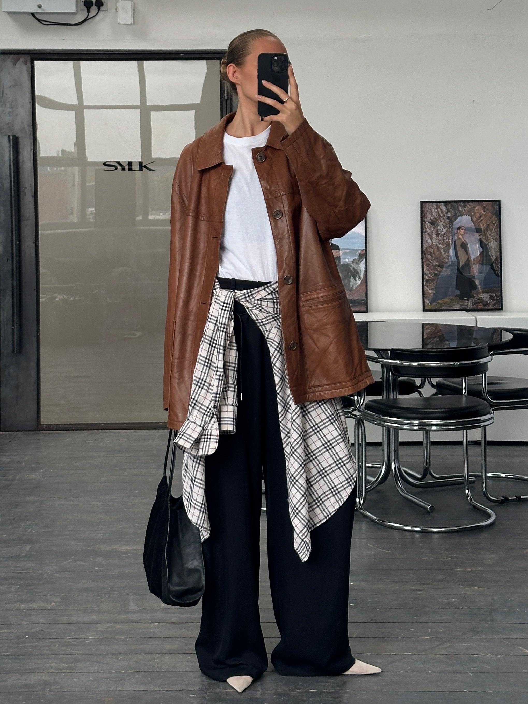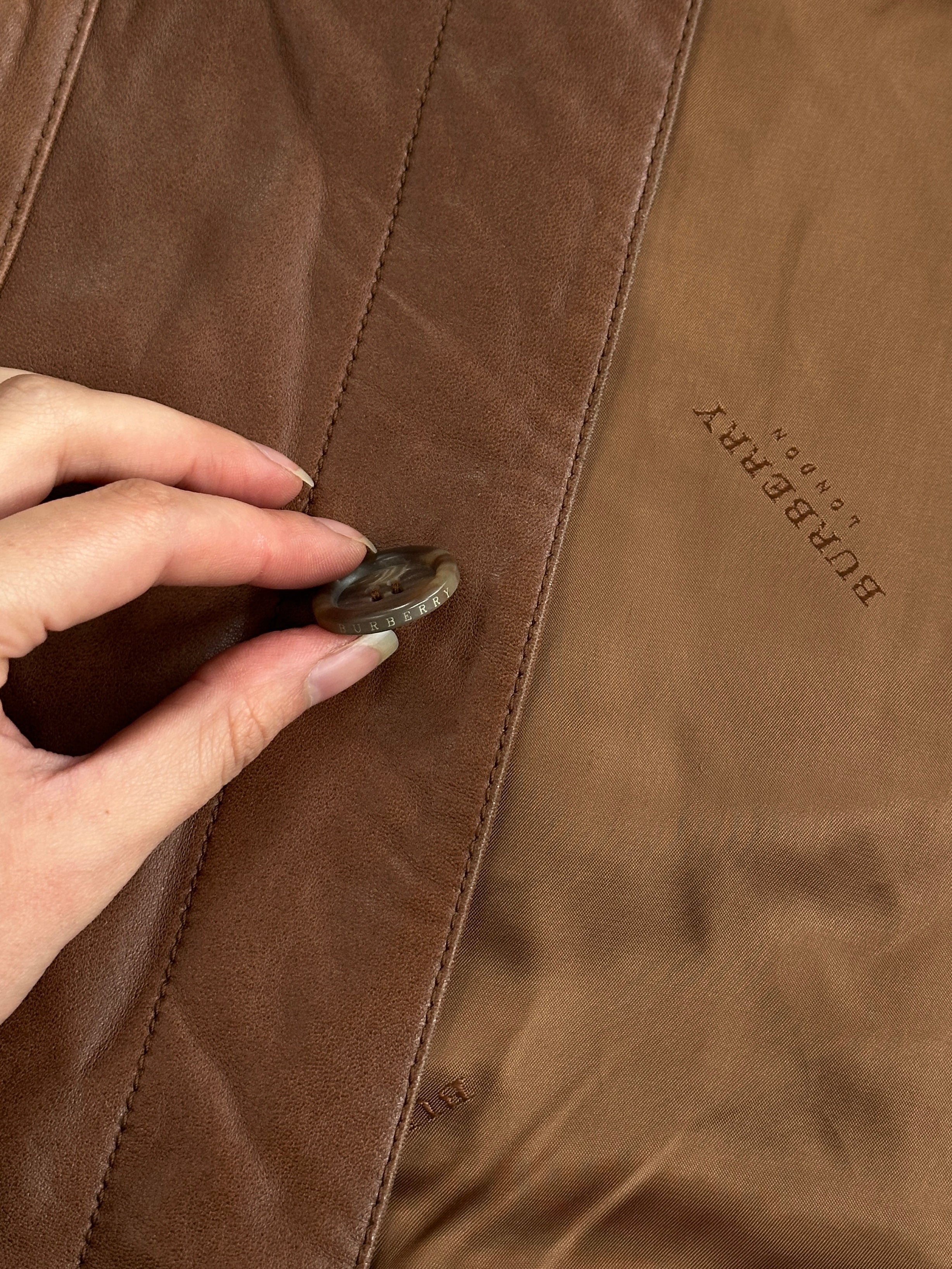 Burberry London 2000s leather jacket with engraved buttons and signature EKD jacquard lining, crafted from soft leather.