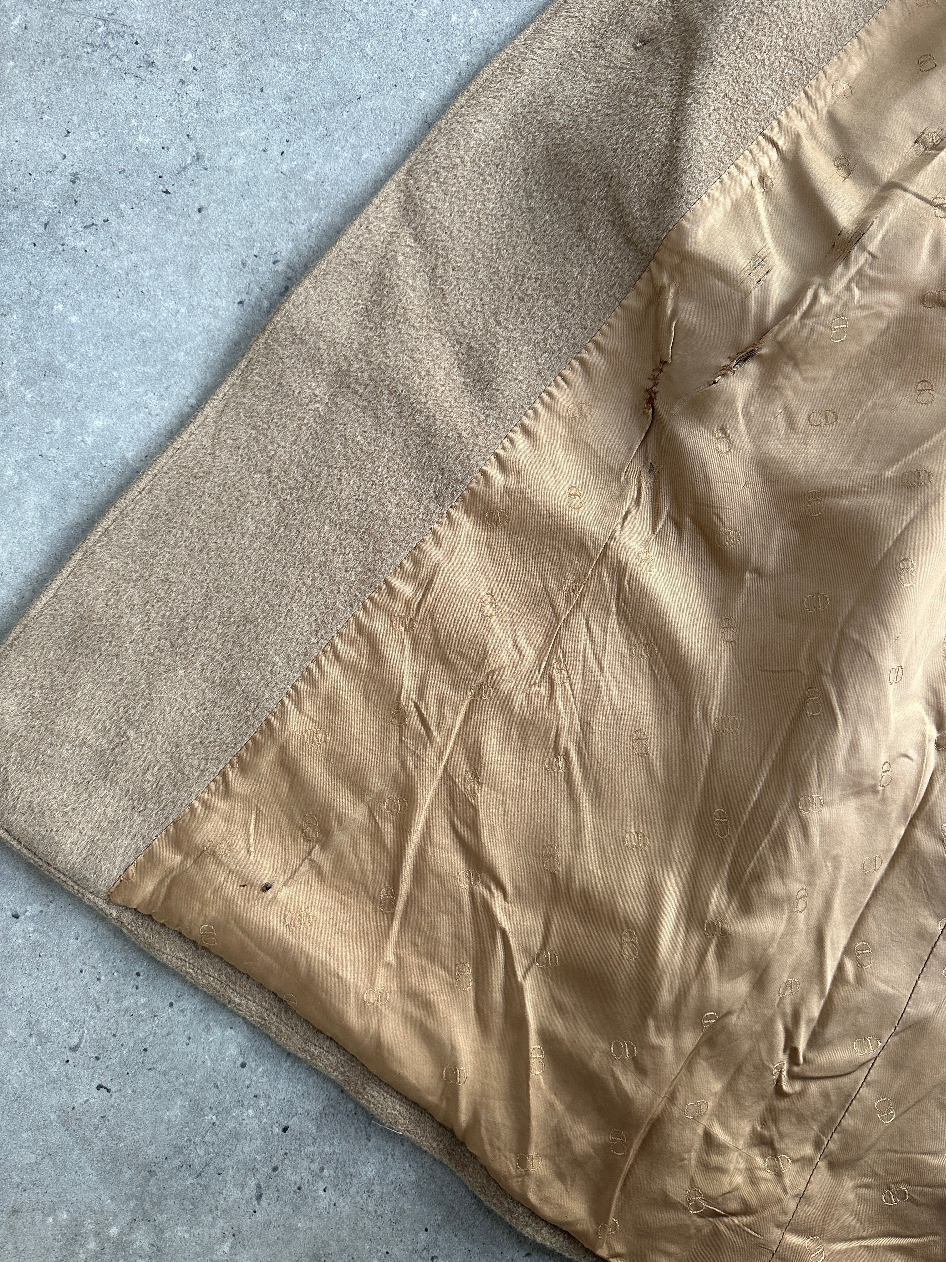 A vintage beautifully structured Christian Dior Monsieur coat in a warm tan brown tone. Crafted in Italy from a premium wool and camelhair blend, featuring a clean single button neckline and subtle CD monogram lining for a refined minimalist finish.
