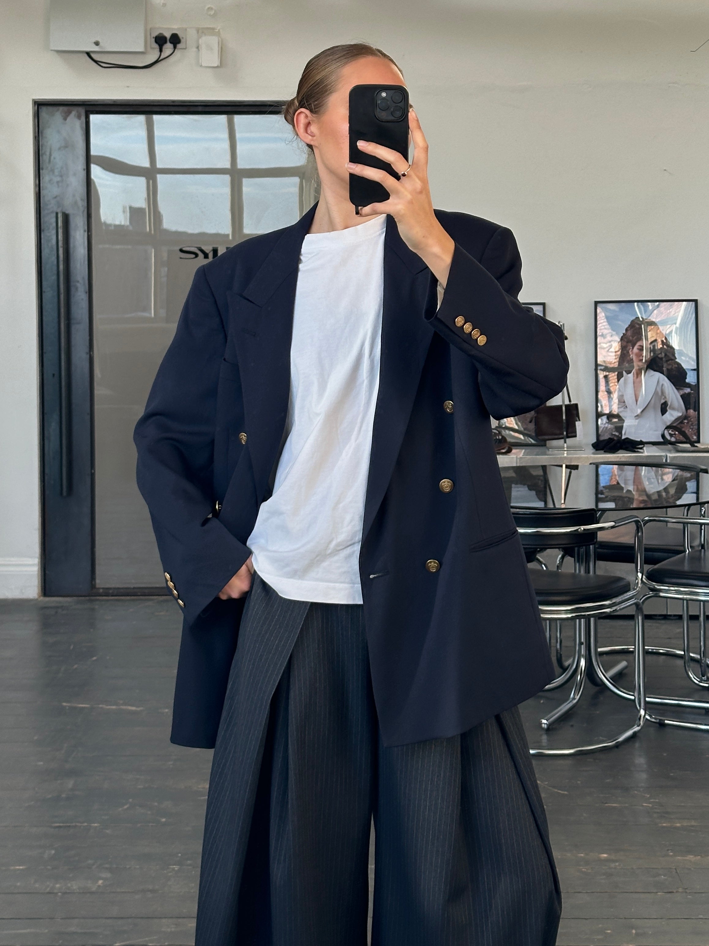 Vintage 1980s navy double breasted Christian Dior Monsieur blazer featuring bold gold bespoke buttons and a structured tailored silhouette. Finished with a smooth lining and strong shoulders for a refined and timeless look.