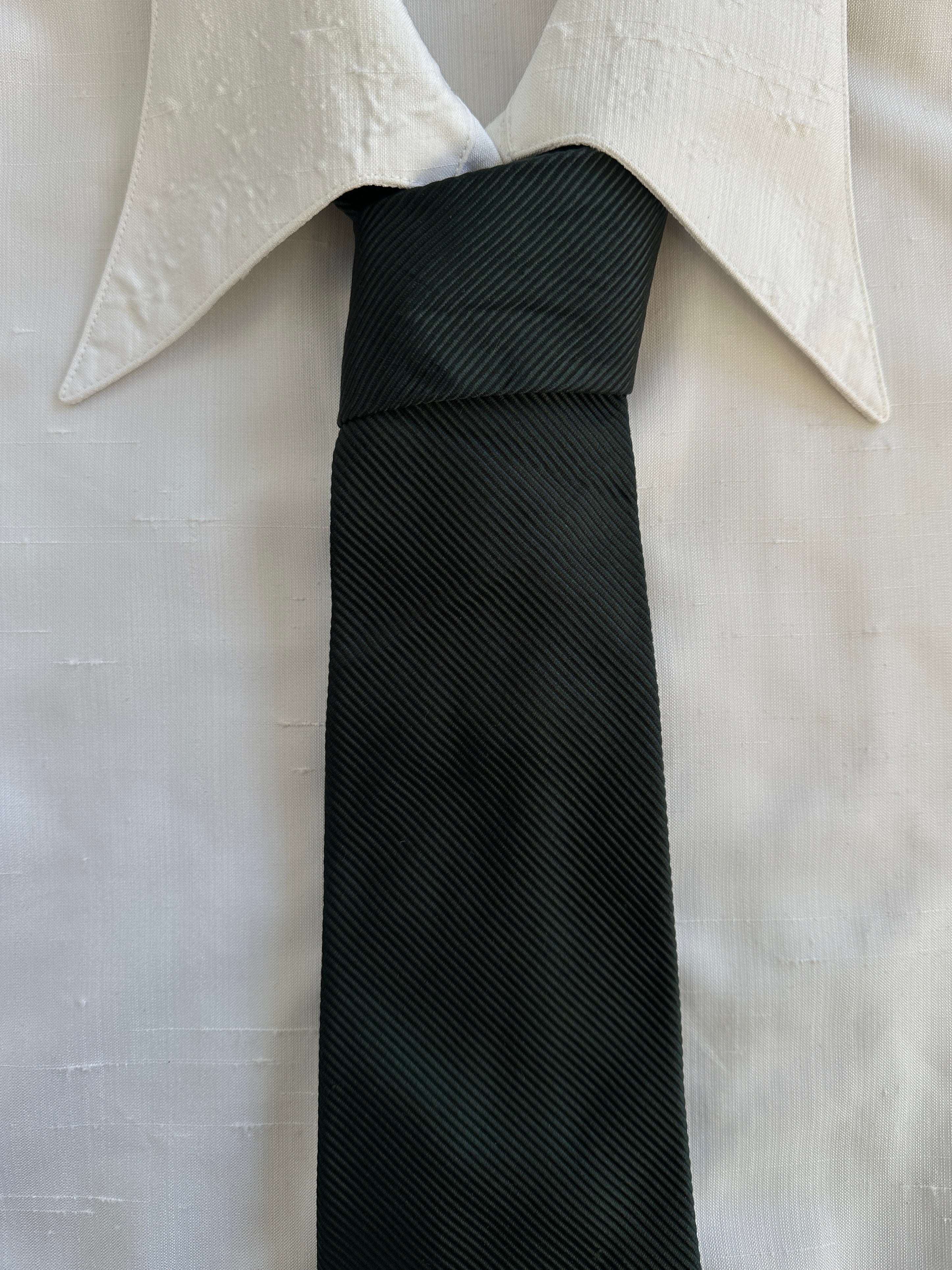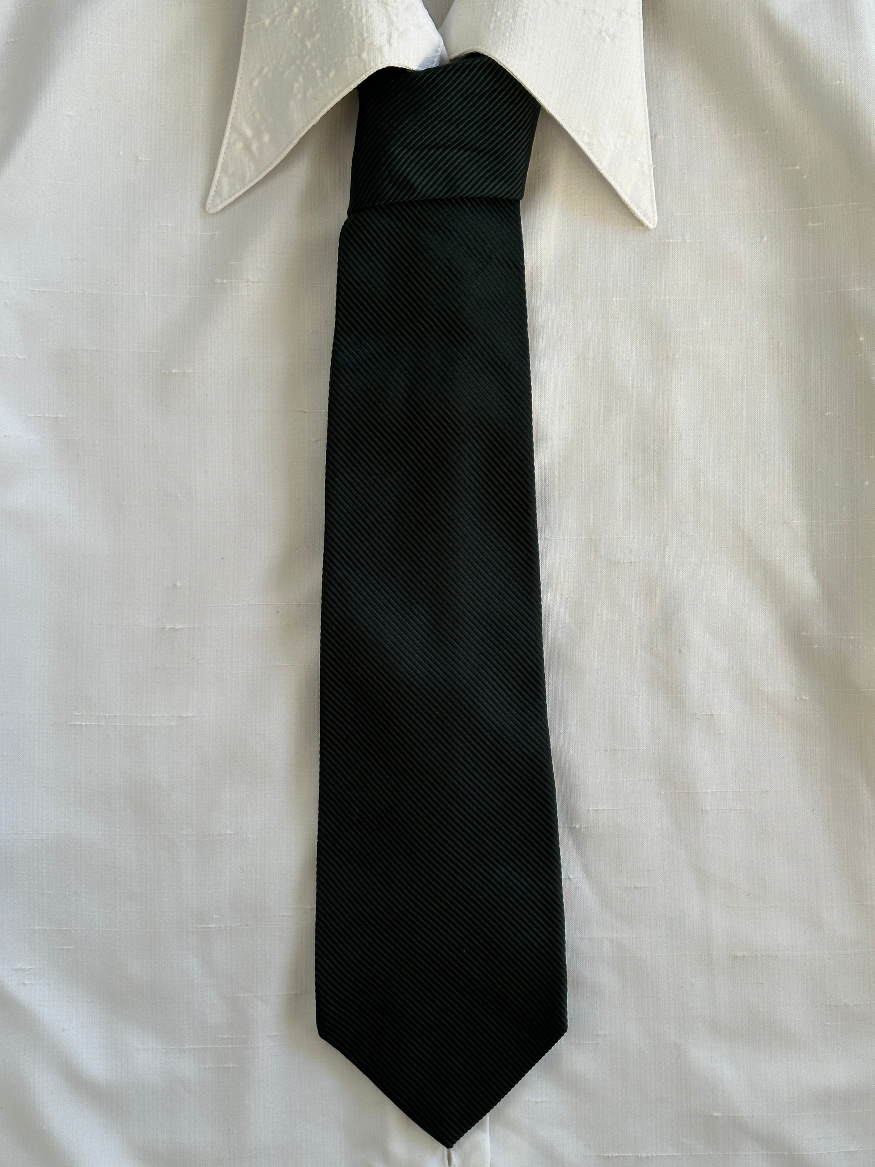 Vintage 1990s Dunhill tie in a deep green tone with a subtle diagonal stripe. A refined handmade accessory with a soft structured handle.