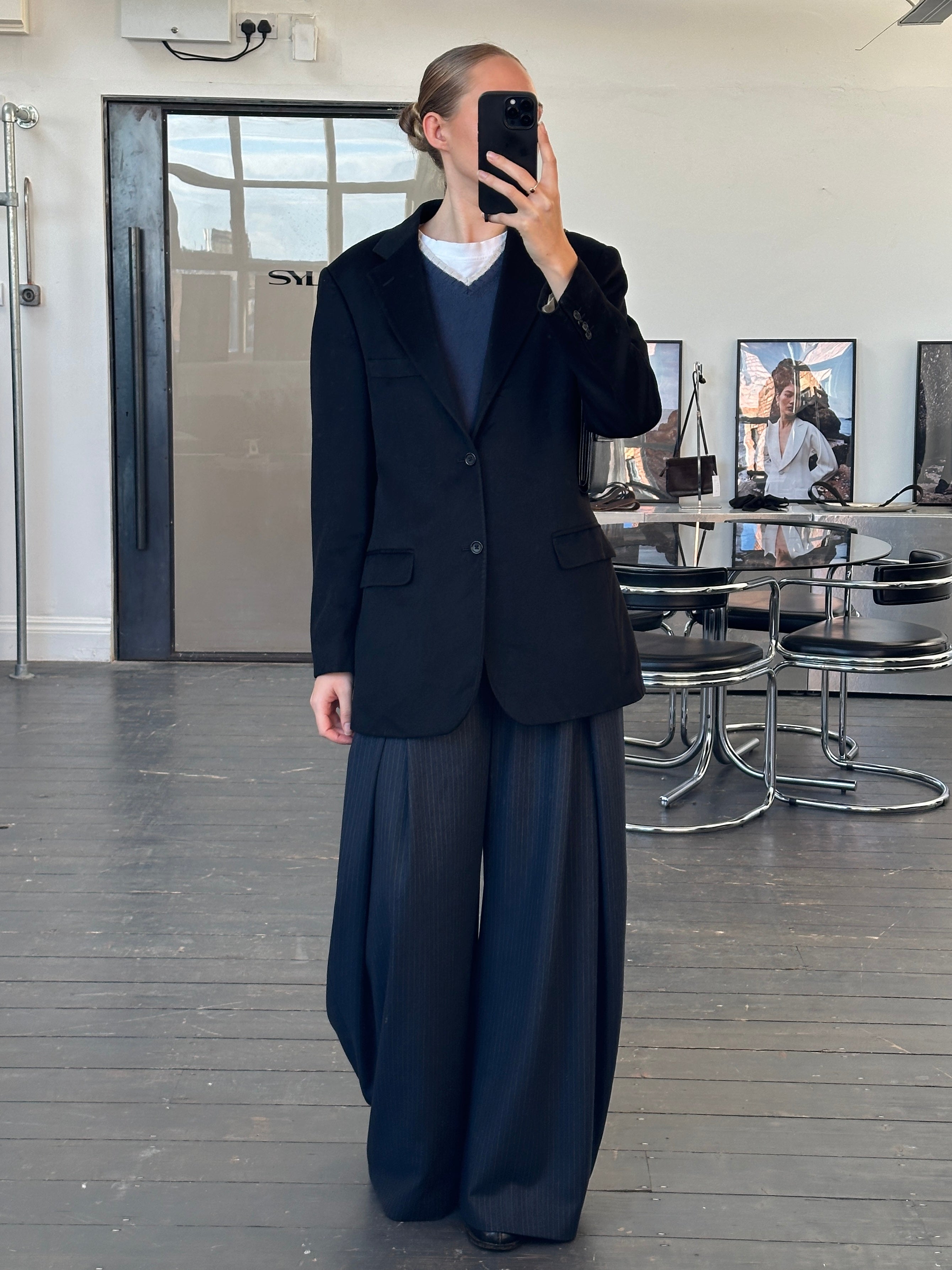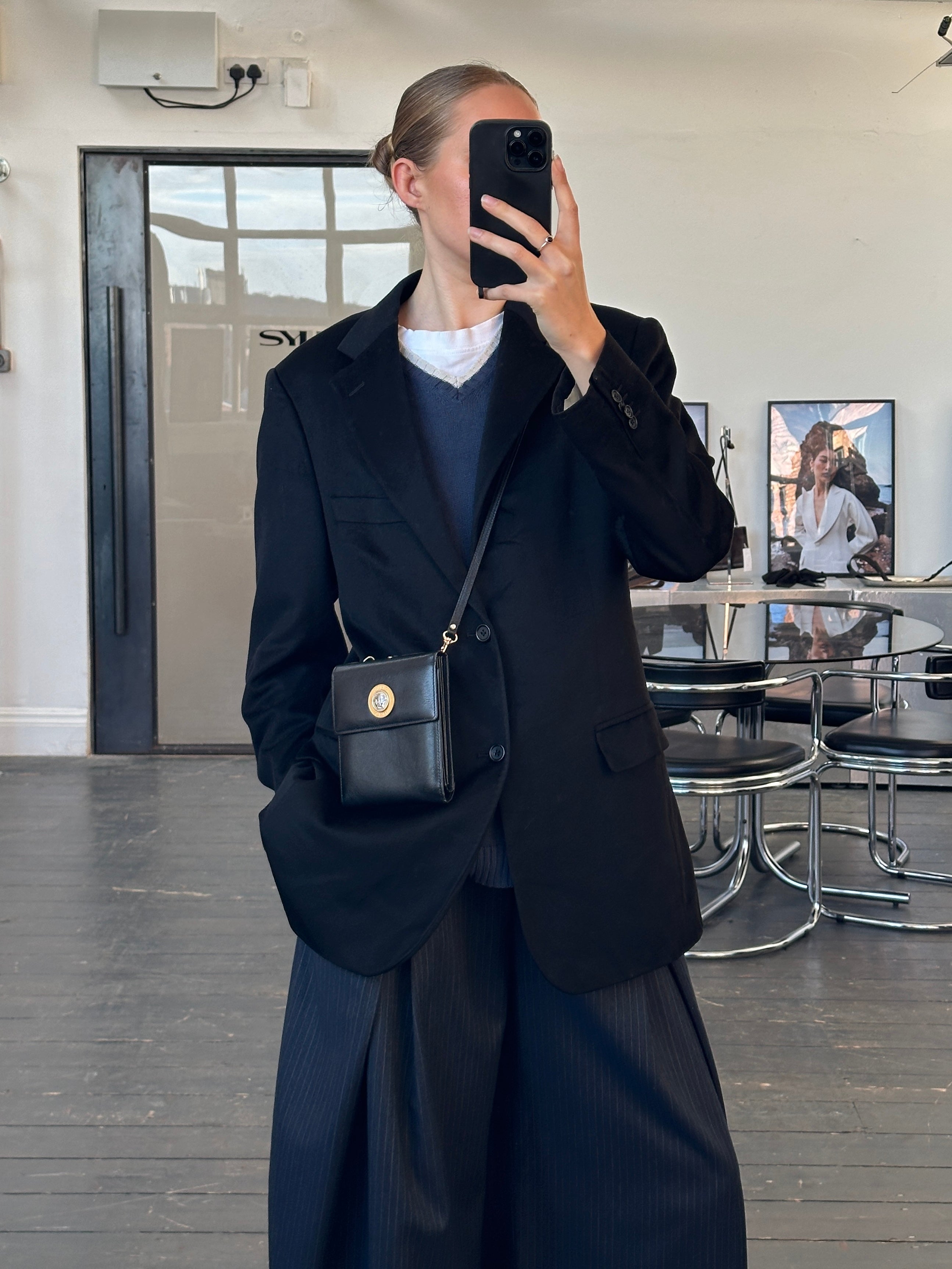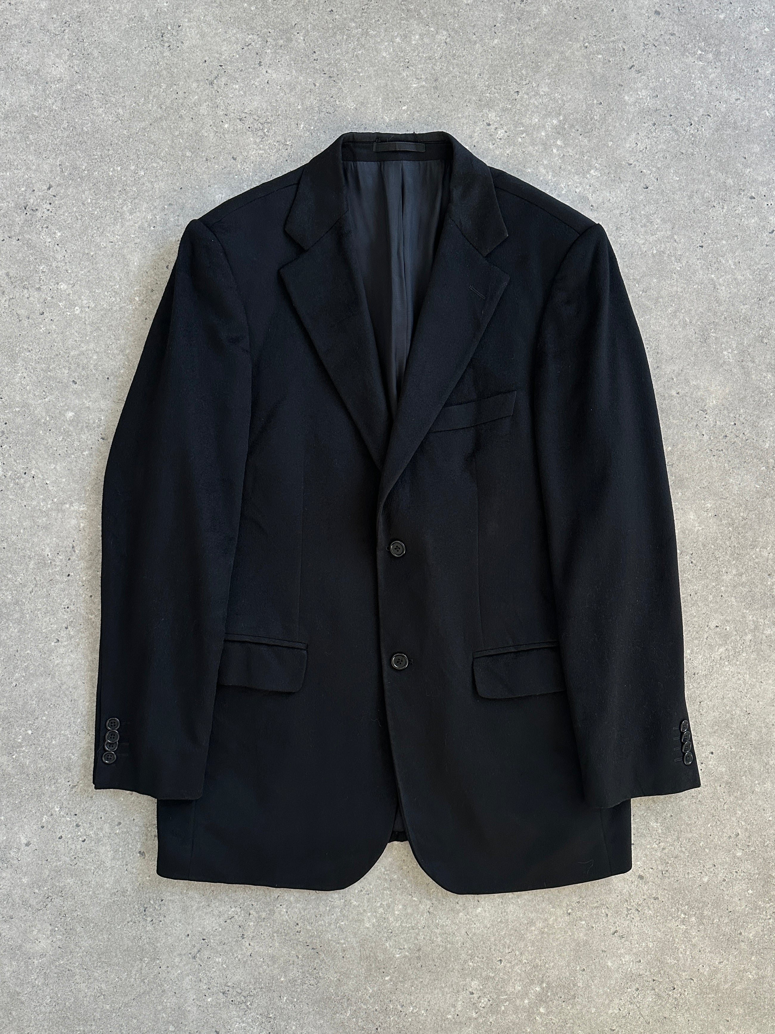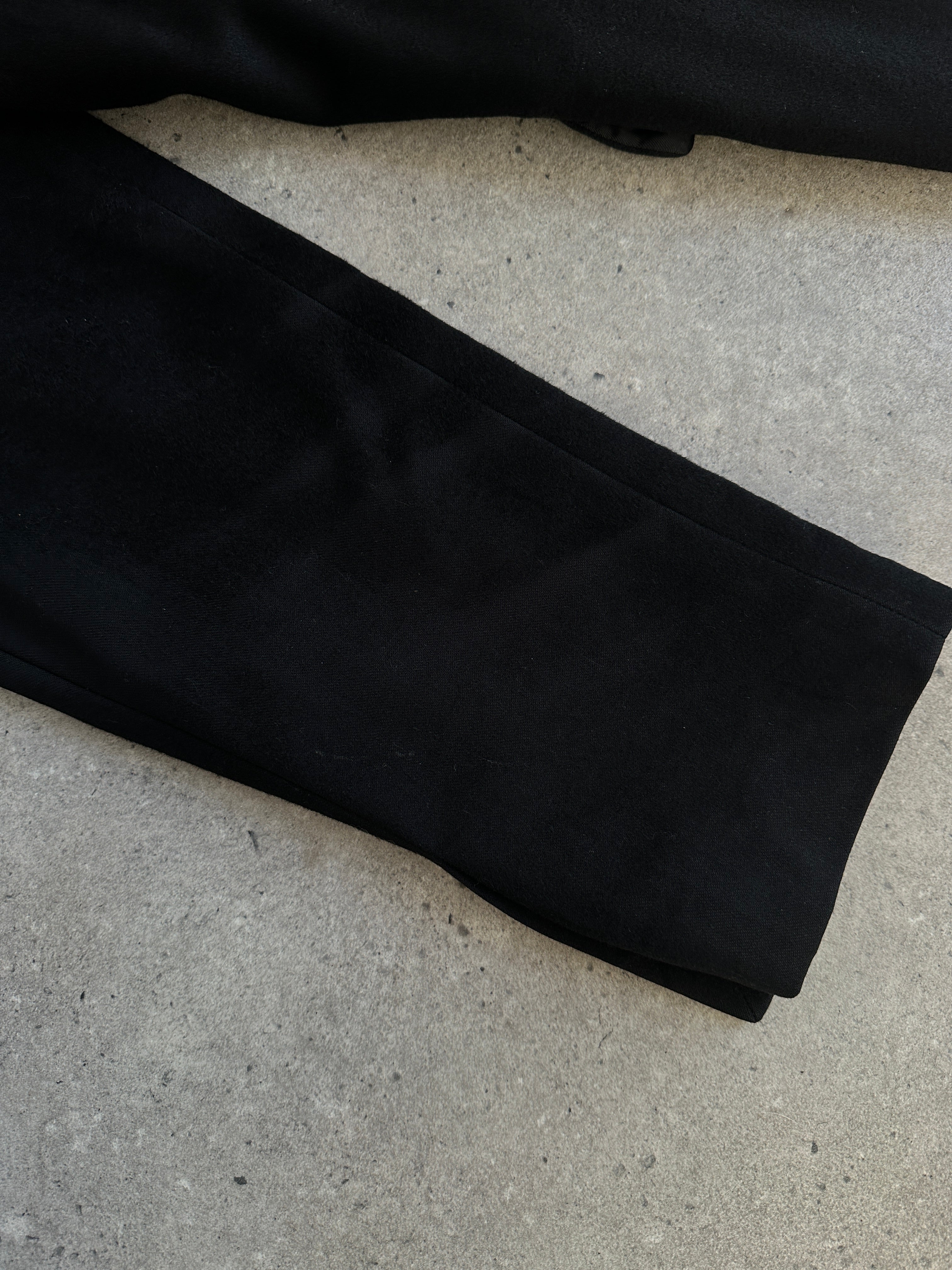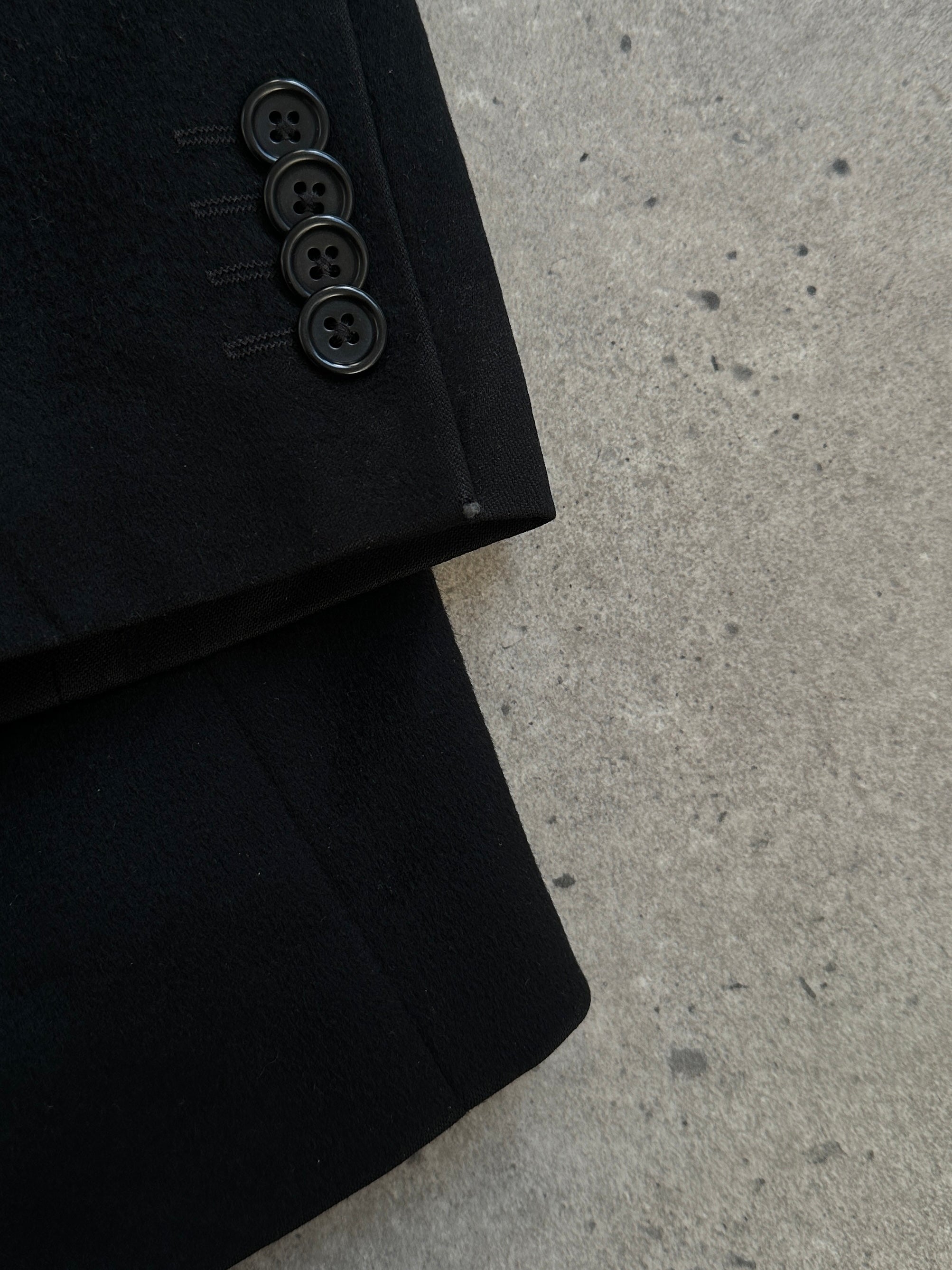 Vintage single-breasted blazer in a deep black brushed-wool tone, crafted from Loro Piana’s refined Doeskin pure wool. A smooth, velvety 1990s piece with a soft matte finish and clean structured tailoring.