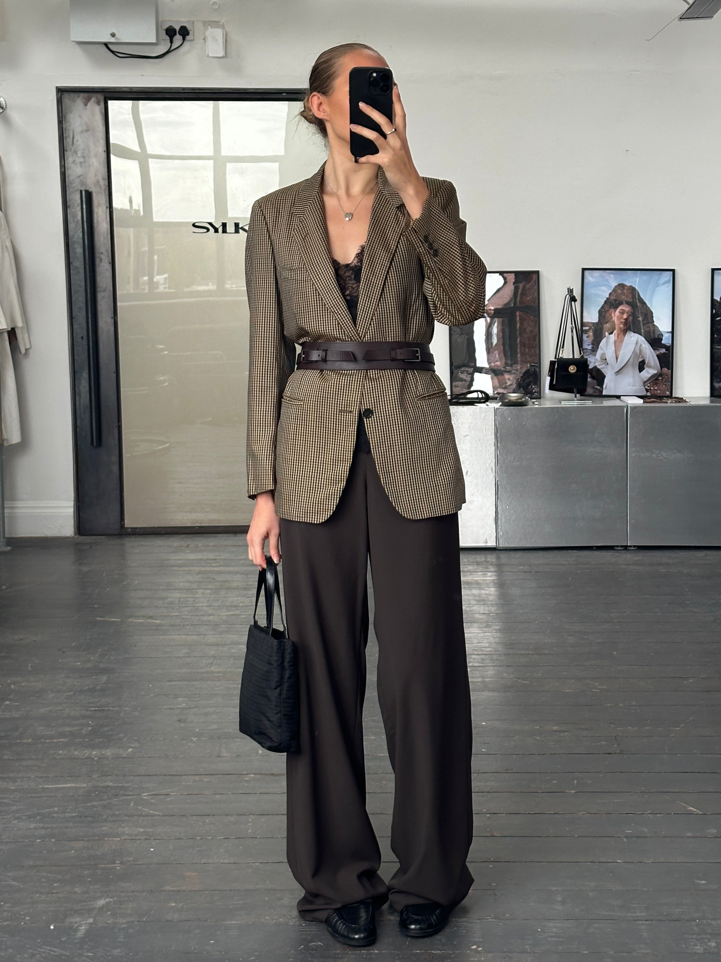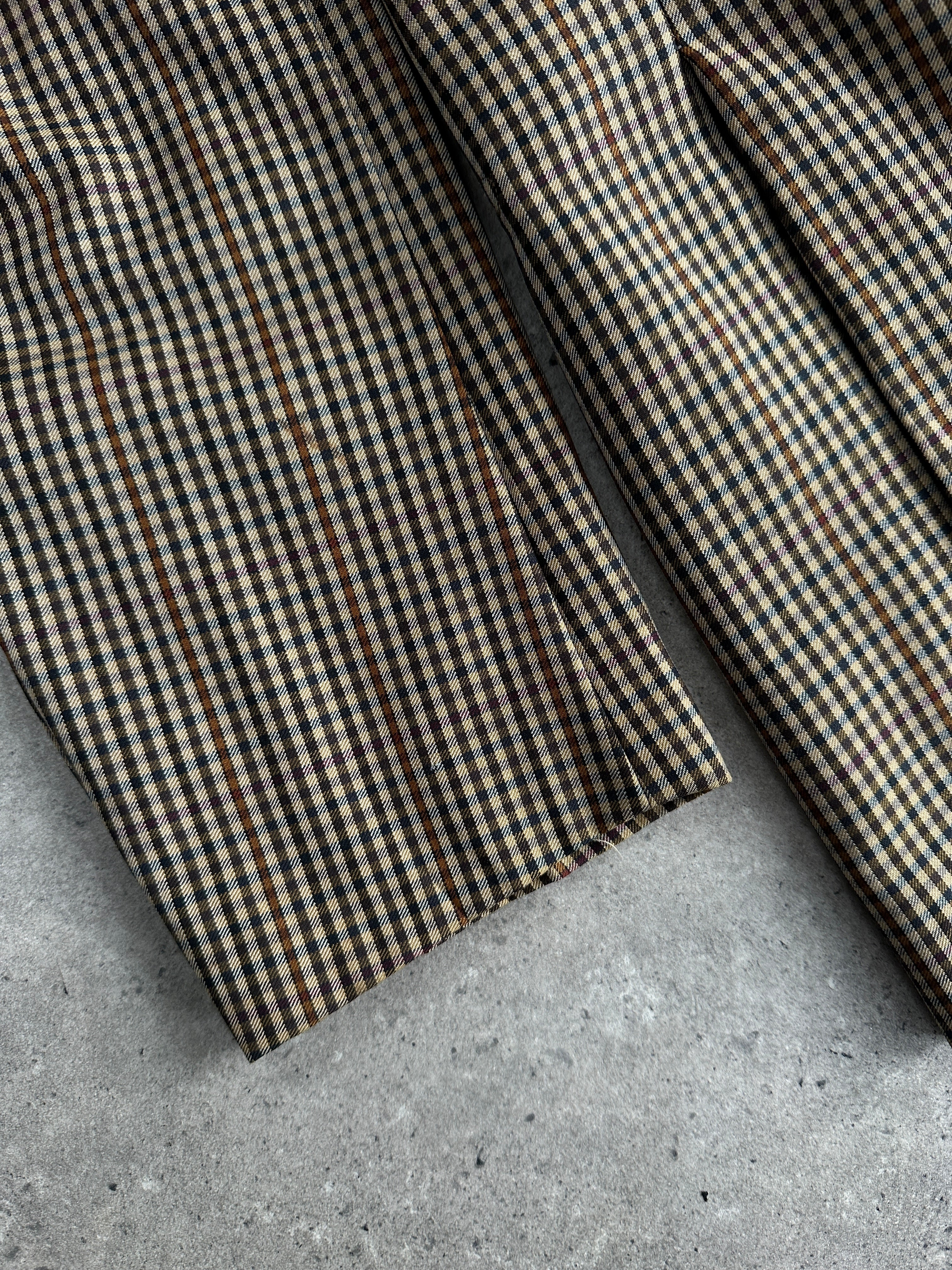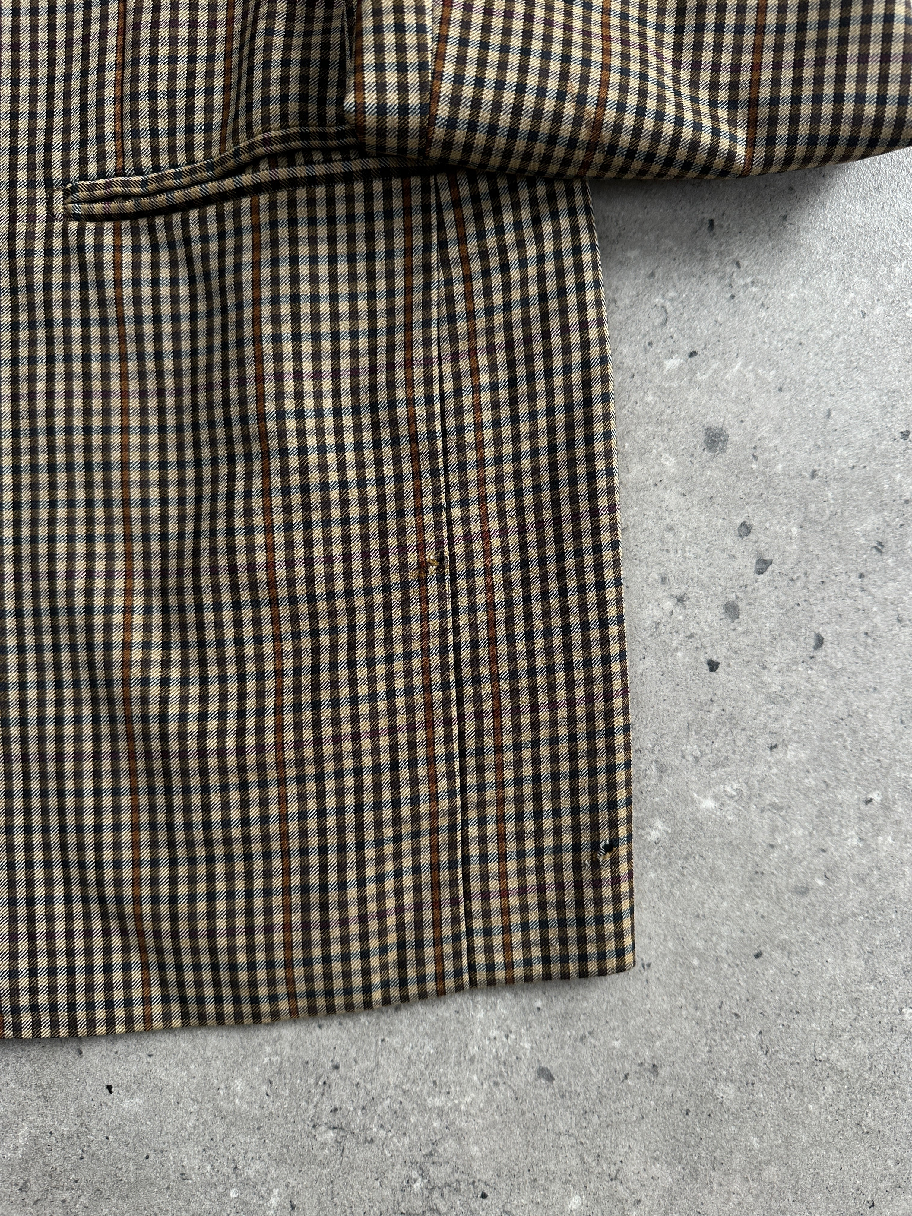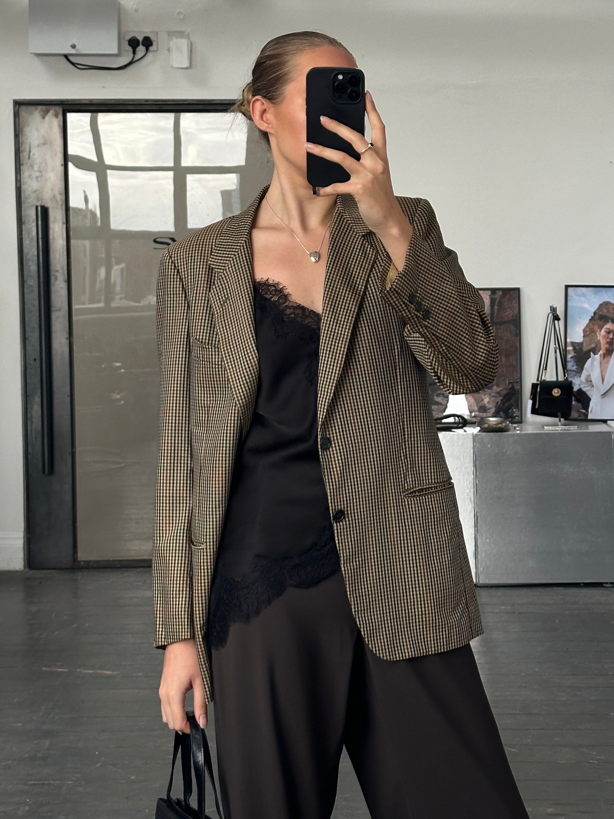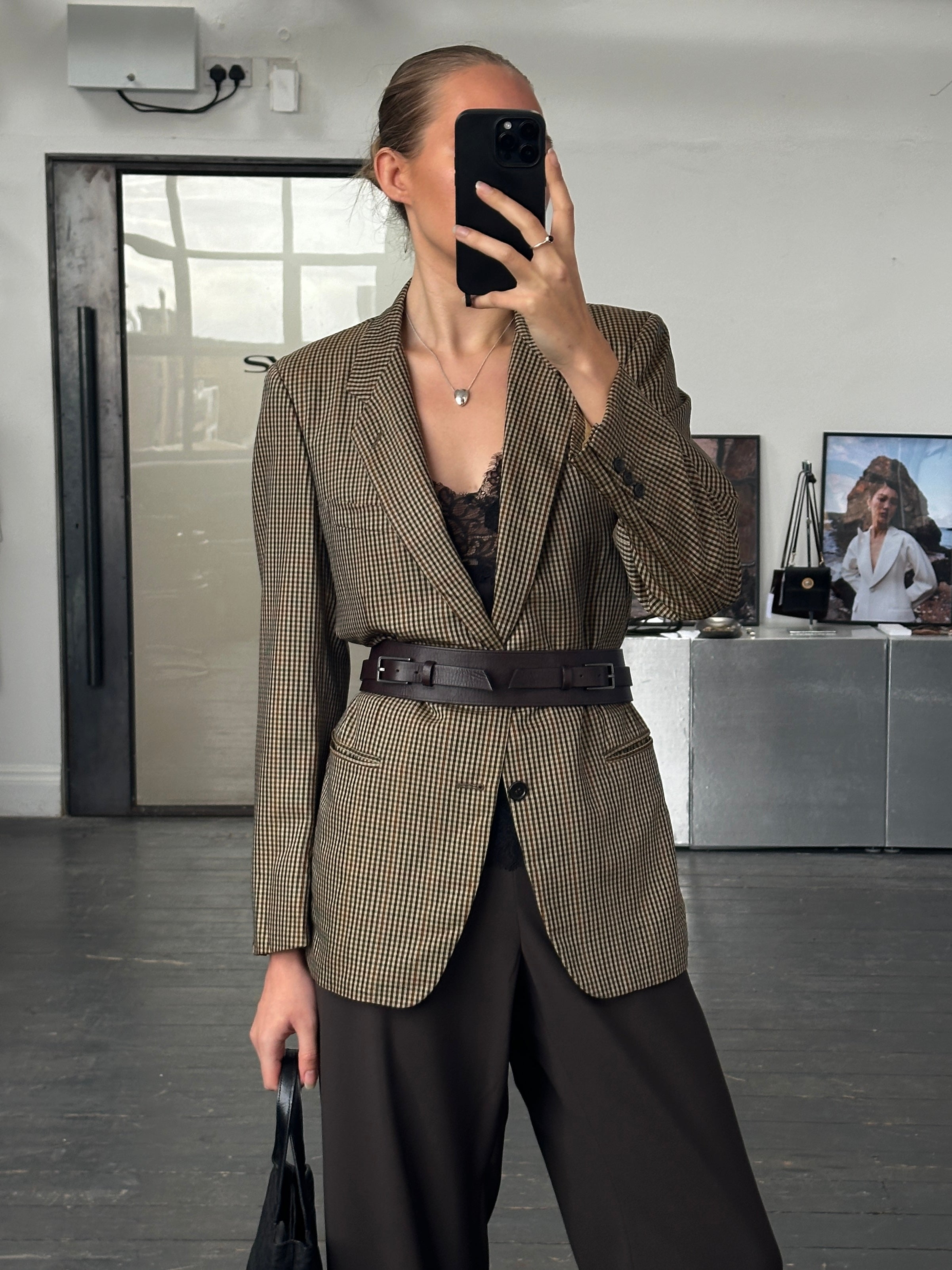 Vintage Pal Zileri 1990s single breasted blazer in neutral brown and beige check, crafted from Loro Piana’s signature “Tasmanian” pure wool. Lightweight and partly lined for a breathable, soft-drape finish.
