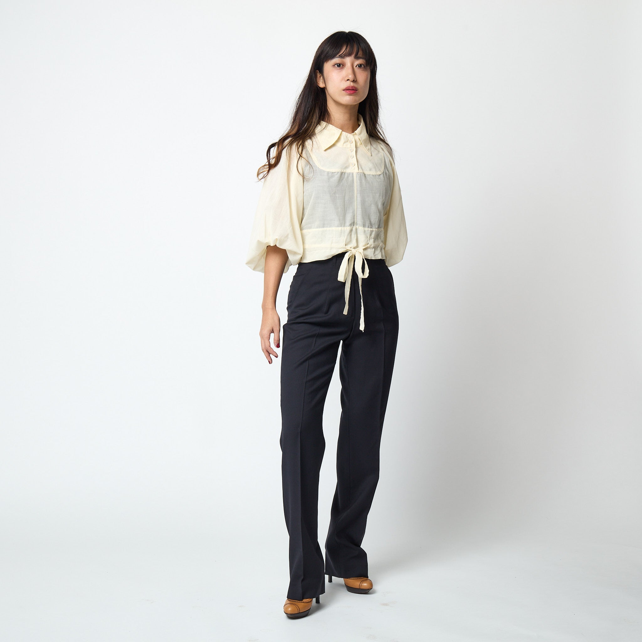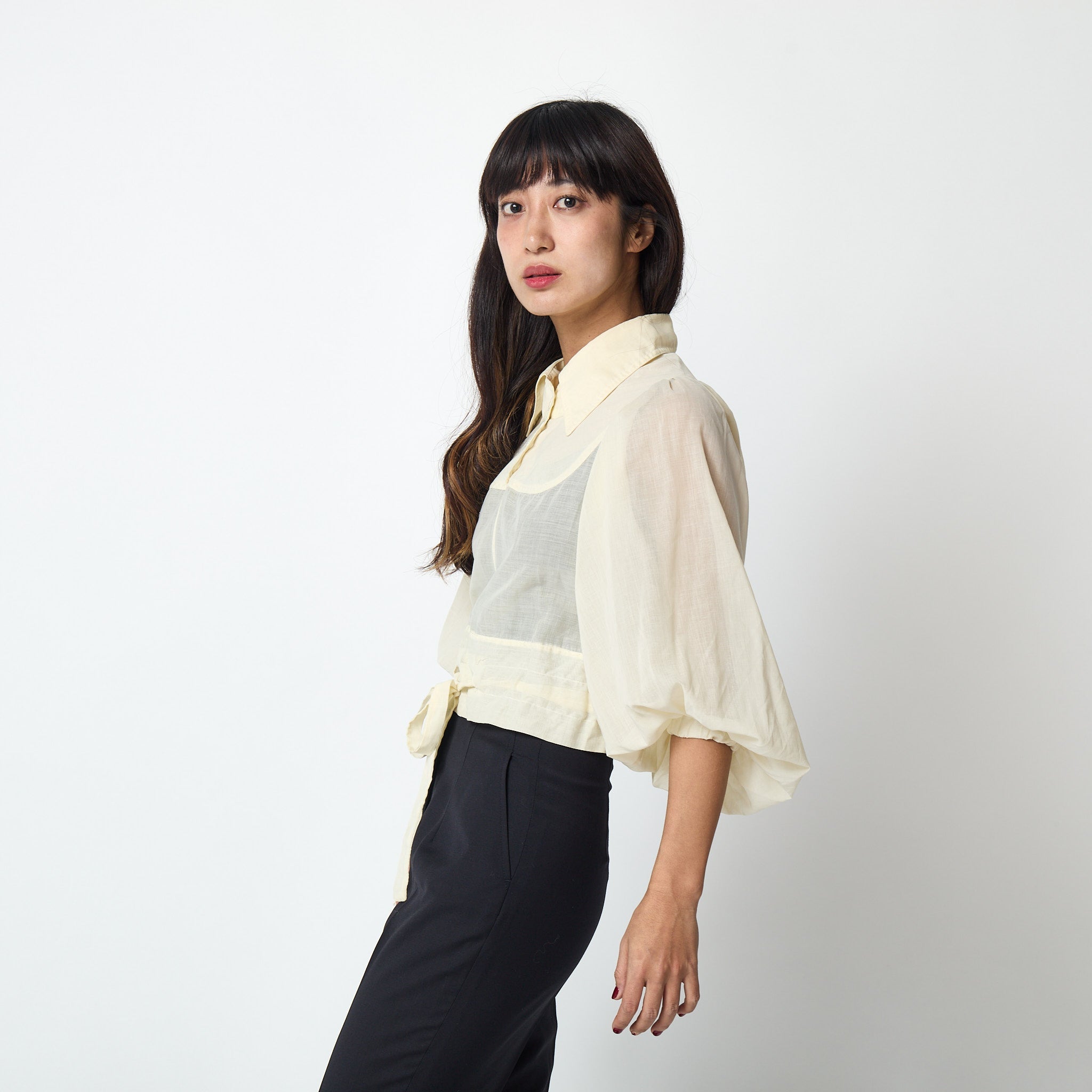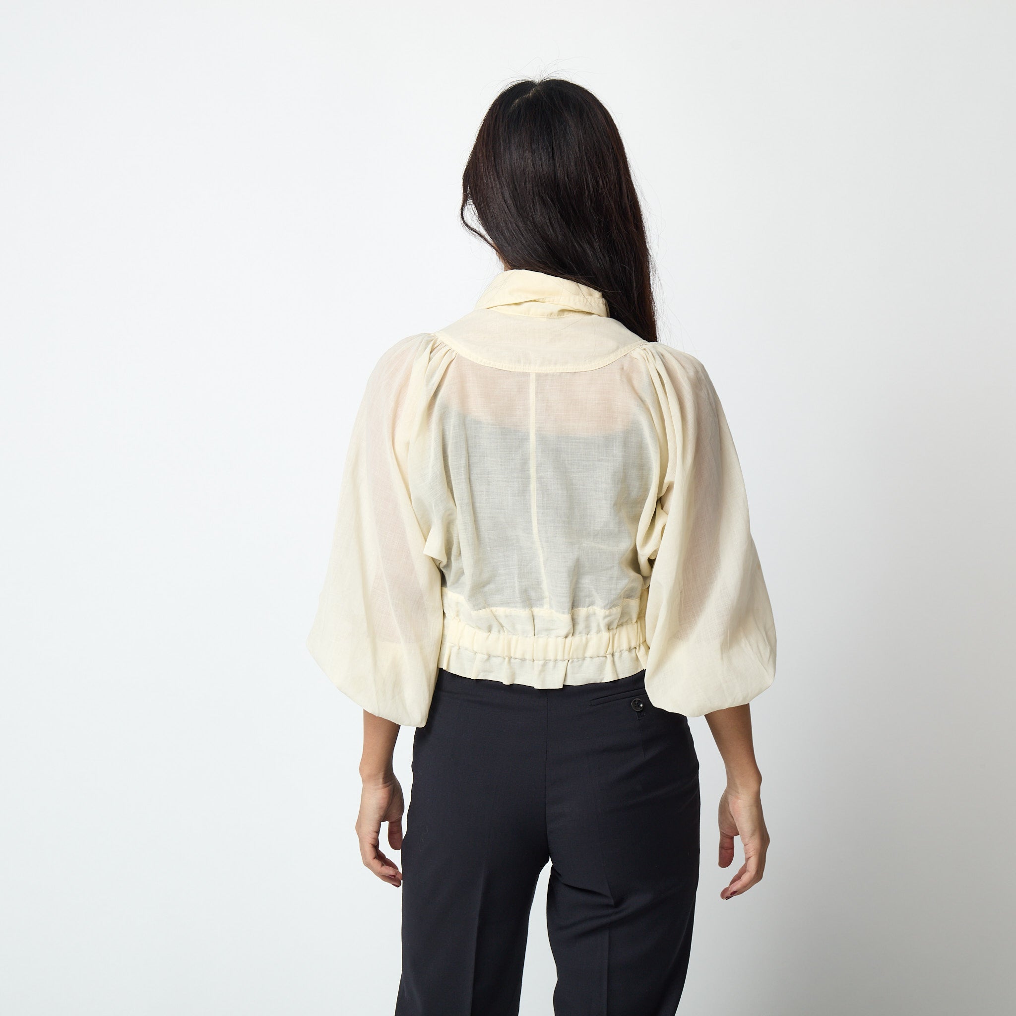 1970s Jeff Banks Cream Bell-Sleeve Crop Top with Drawstring Waist