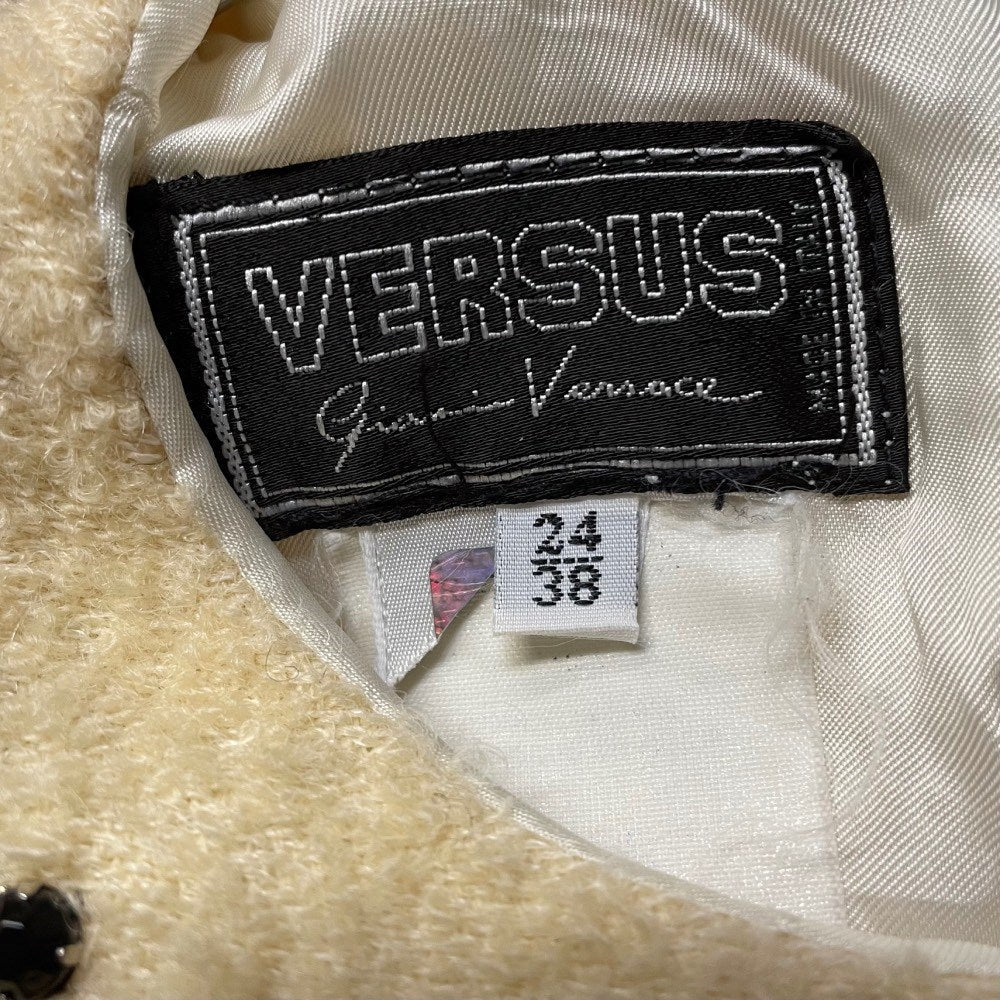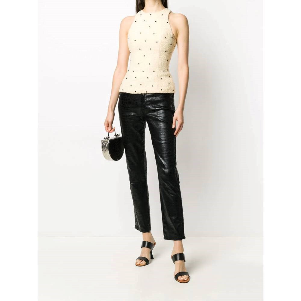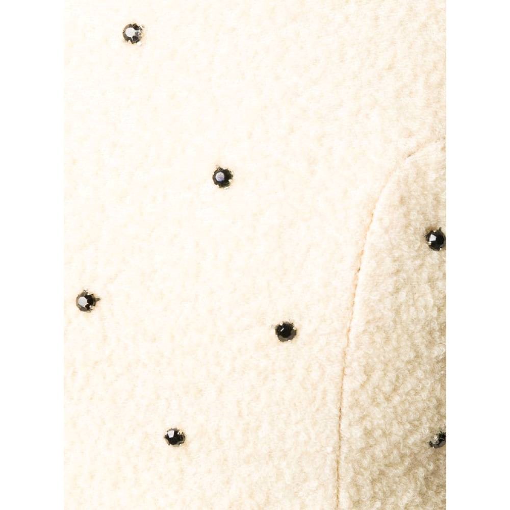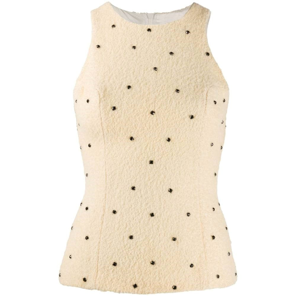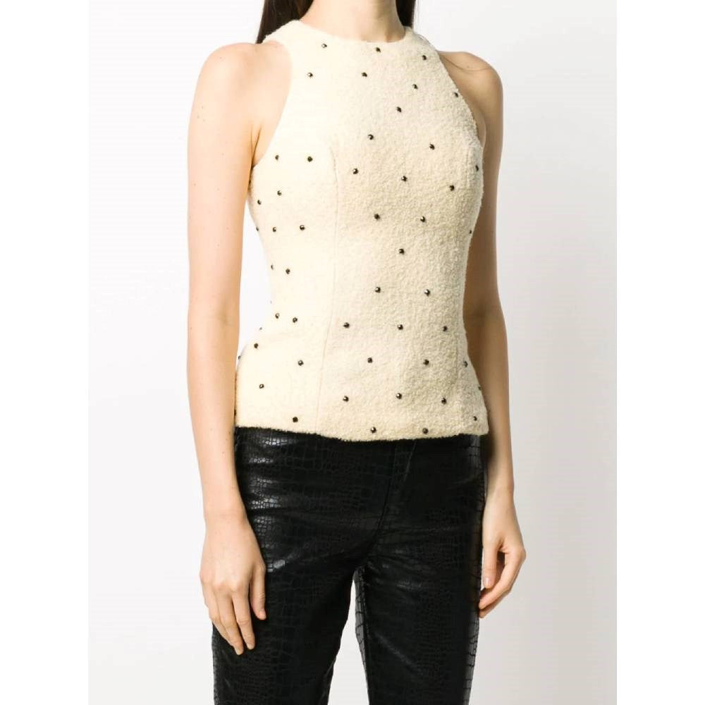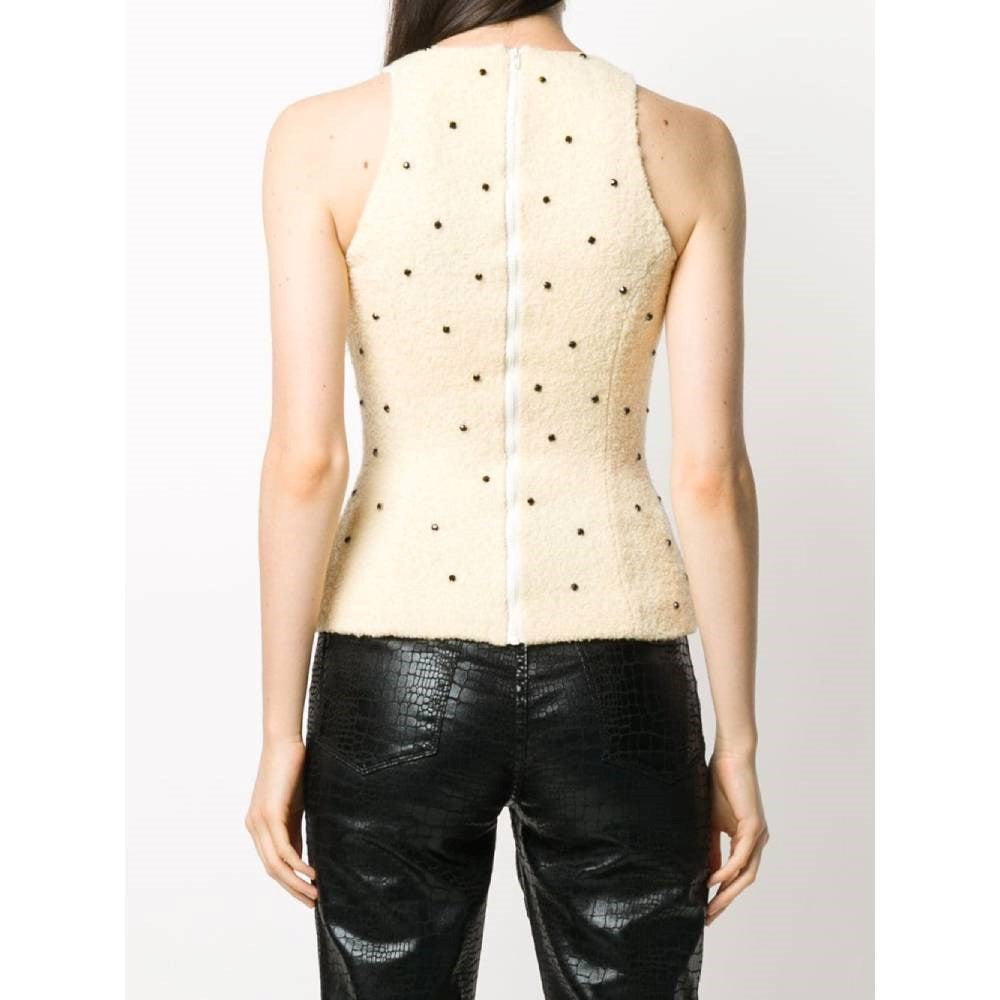 Versace beige wool sleeveless top with black stones and round collar. Zip closure on the back.