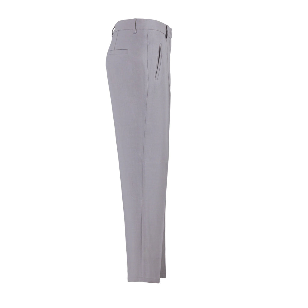 Crafted from a soft wool–viscose blend, they feature a high waist, straight leg, and light grey hue for versatile elegance.